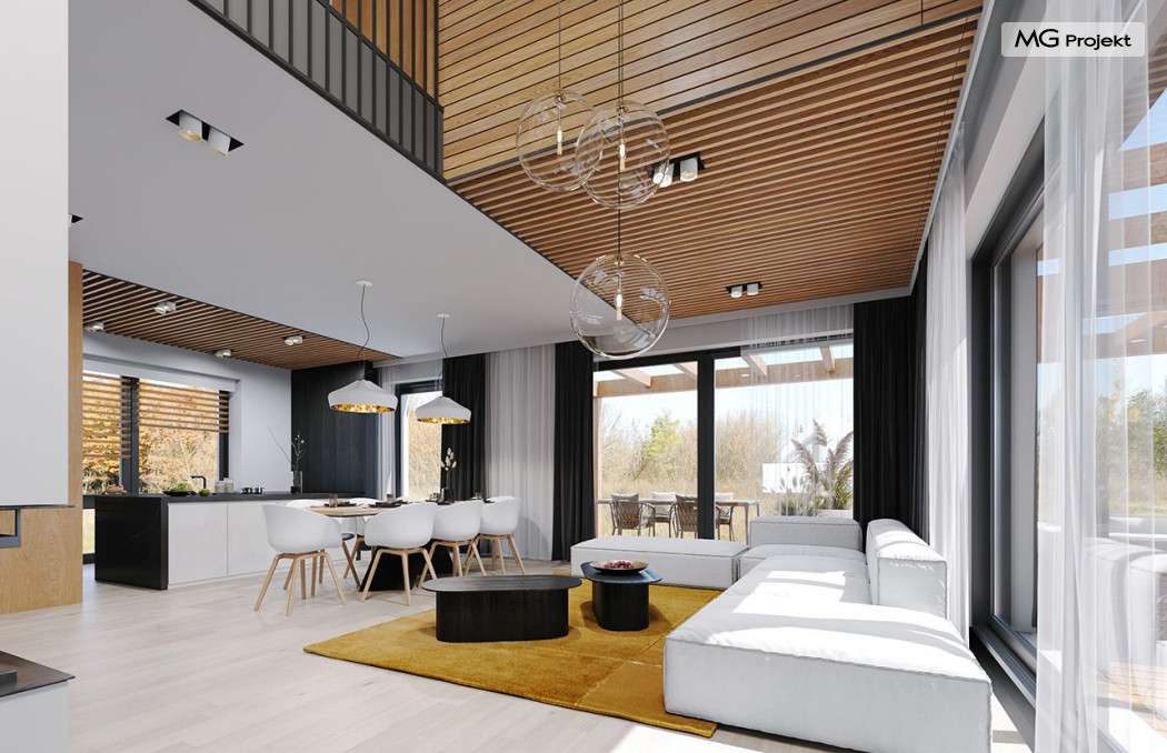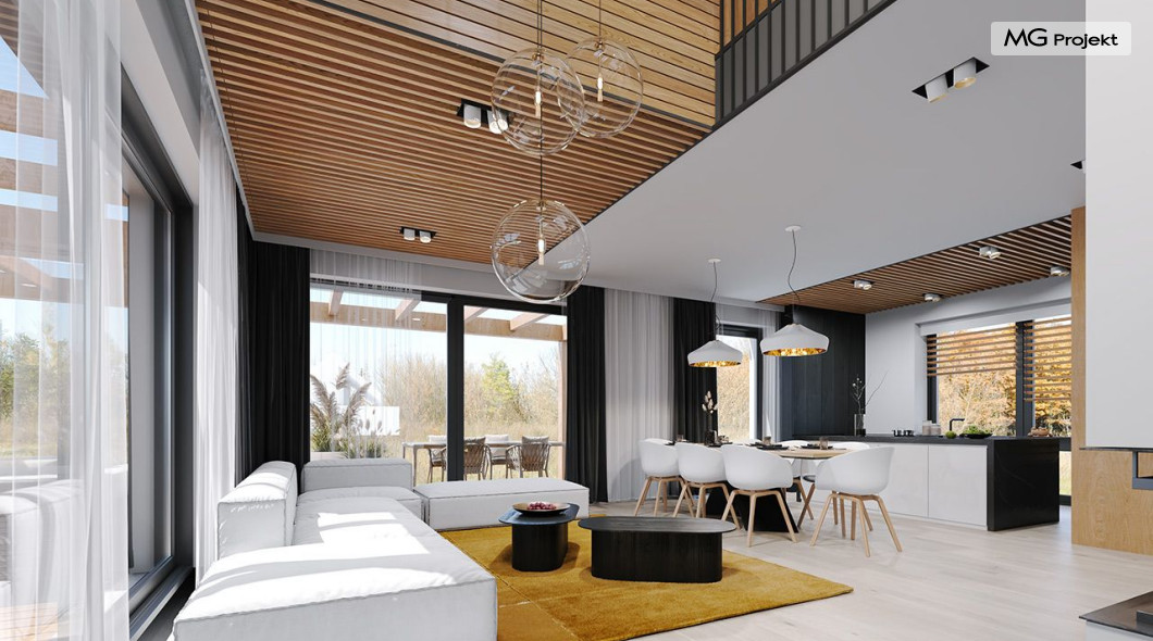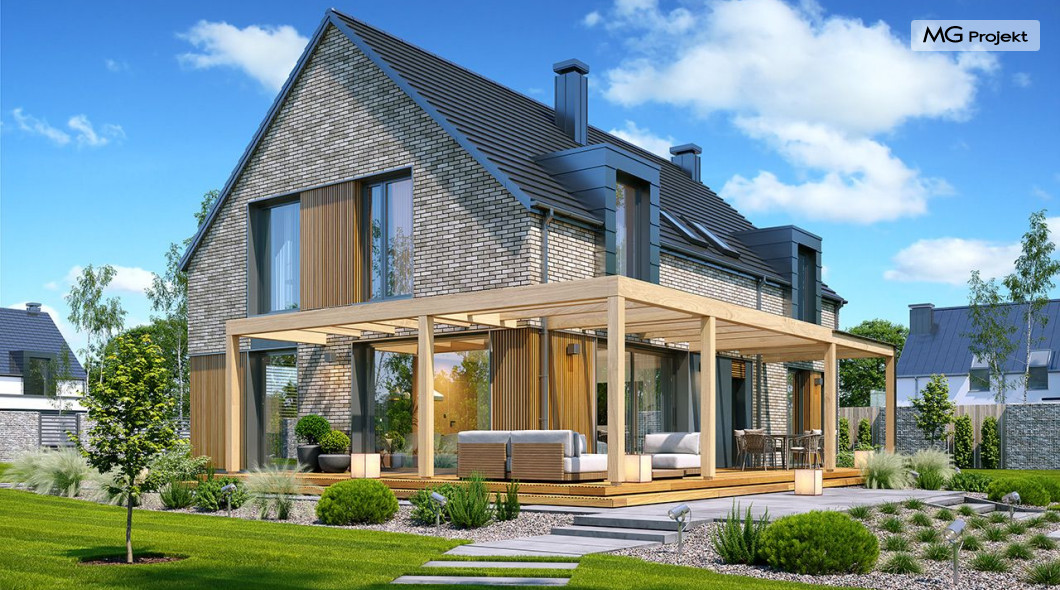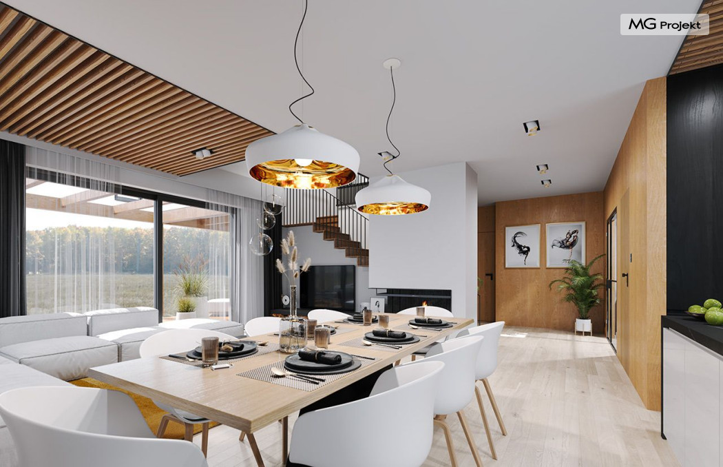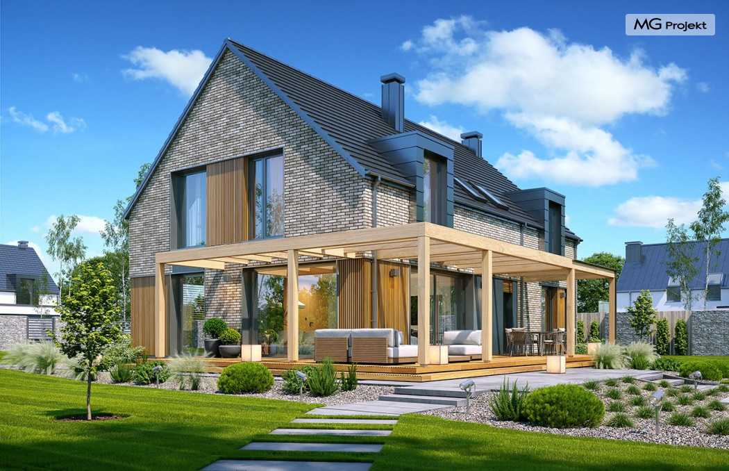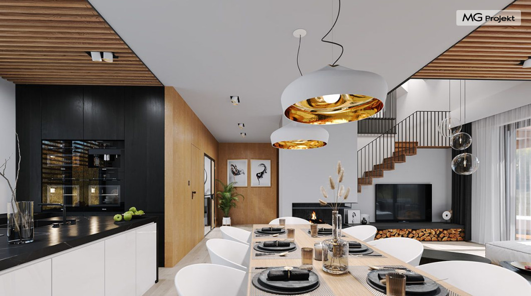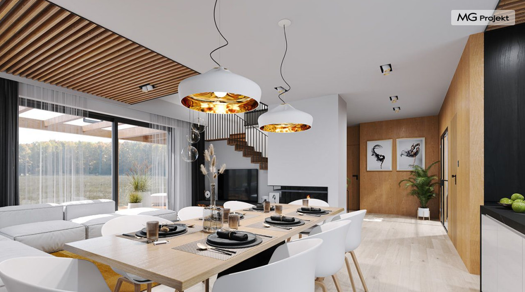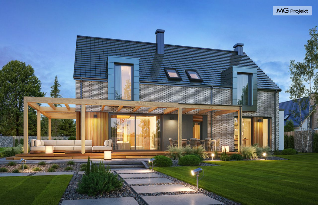 Projekt domu Bolero to projekt domu jednorodzinnego - z naszej serii taneczno-imprezowych domów (Mambo, Lambada, Makarena, Party, Biba, Tango, Salsa, Rumba). Bolero to propozycja praktycznego, funkcjonalnego domu jednorodzinnego, parterowego z poddaszem użytkowym, o nowoczesnej architekturze, w popularnej stylistyce domu-stodoły. Budynek wyróżnia zwarta bryła, nowoczesne detale architektoniczne i funkcjonalne wnętrze. Prostokątny plan, z wbudowanym częściowo garażem przykryto dwuspadowym symetrycznym dachem z wysoką ścianą kolankową poddasza. Sylwetkę domu urozmaicono kubicznymi lukarnami poddasza, a całą fasadę podzielono na poziome pasy wykończone kontrastującymi materiałami. Propozycja elewacji to miks płytki klinkierowej, z fragmentami wykończenia drewnem, oraz tynku. Całość kompozycji zwieńcza dach pokryty płaską dachówką. Oczywiście to jedna z możliwych opcji wykończenia domu od zewnątrz – wszystko zależy od inwencji, wyobraźni i preferencji przyszłych właścicieli. Elewację frontową podkreśla reprezentacyjne wejście z szerokimi drzwiami z naświetlami bocznymi, piękne duże okno kuchni z wyspą, oraz lukarny poddasza z dużymi przeszkleniami. Od strony ogrodowej dom ma spokojniejszą bardziej jednorodną fasadę, z dużymi narożnymi przeszkleniami części dziennej i dodaną pergolą zadaszającą taras ogrodowy. Wnętrze domu zaskakuje poczuciem przestrzeni, niełatwym do uzyskania w 150-metrowym domu. Poczucie przestronności części dziennej potęgują duże przeszklenia salonu na taras, oraz pustka nad salonem i schodami, łącząca pokój dzienny z antresolą na poddaszu. Wnętrze jest bardzo nowoczesne. Przykładem może tu być niebanalna kuchnia z dużą wyspą i oryginalnym baletem roboczym przy oknie. Na parterze prócz salonu zaprojektowano dodatkowy pokój z łazienką, oraz garaż z pomieszczeniem technicznym. Na poddaszu przewidziano cztery pokoje z dwiema łazienkami, w tym apartament master z własną łazienką i garderobą. Wnętrze można dowolnie kształtować, ale bez problemu zmieści się tutaj 4-6cioosobowa rodzina. Budynek zaprojektowano jako energooszczędny, z dobrymi izolacjami i nowoczesnymi instalacjami. Dom ma prostą konstrukcję i zwartą bryłę, dzięki czemu będzie łatwy w budowie i niedrogi w późniejszej eksploatacji. Bolero to propozycja dla Inwestorów pragnących zbudować nowoczesny, nietuzinkowy i ciekawy architektonicznie dom o nieprzesadzonej wielkości. Dom dla Inwestorów chcących połączyć tradycyjną funkcjonalność z ciekawymi designerskimi detalami. Zapraszamy do zapoznania się z całą serią "roztańczonych domów": https://www.mgprojekt.com.pl/makarena, https://www.mgprojekt.com.pl/bolero, https://www.mgprojekt.com.pl/lambada, https://www.mgprojekt.com.pl/party, https://www.mgprojekt.com.pl/party-2, https://www.mgprojekt.com.pl/biba, https://www.mgprojekt.com.pl/tango, https://www.mgprojekt.com.pl/salsa, https://www.mgprojekt.com.pl/rumba, https://www.mgprojekt.com.pl/mambo.