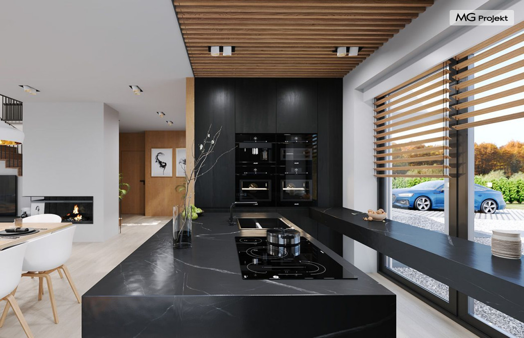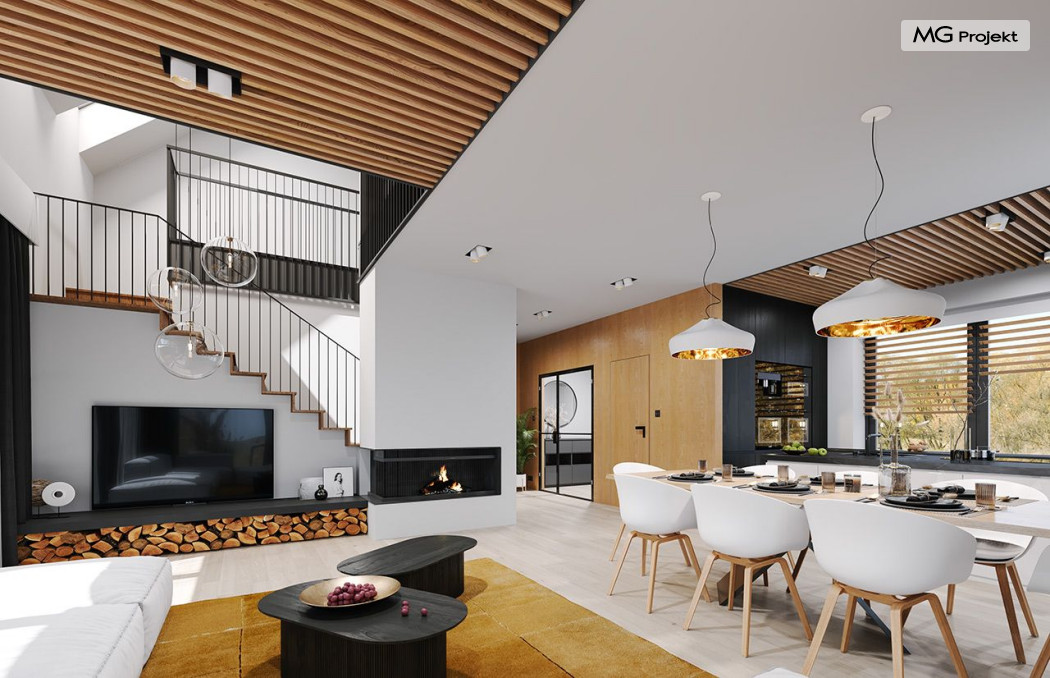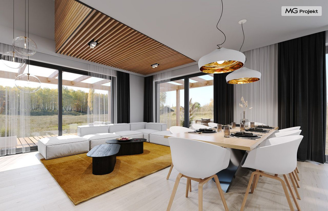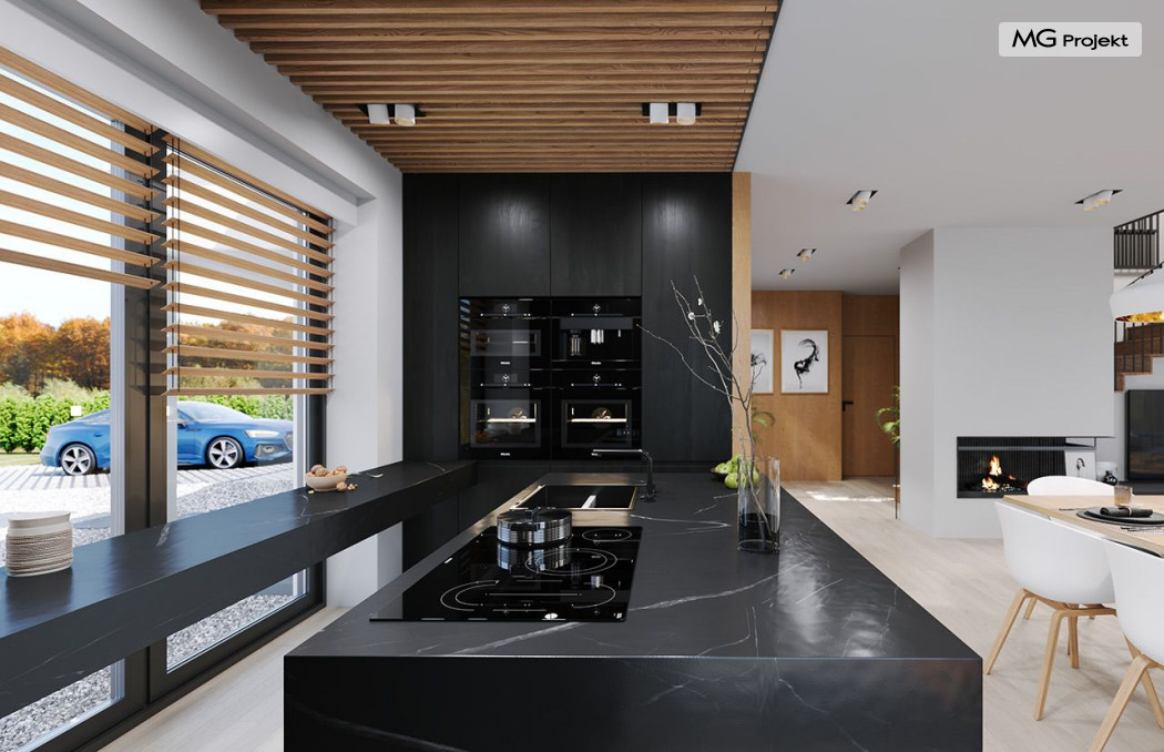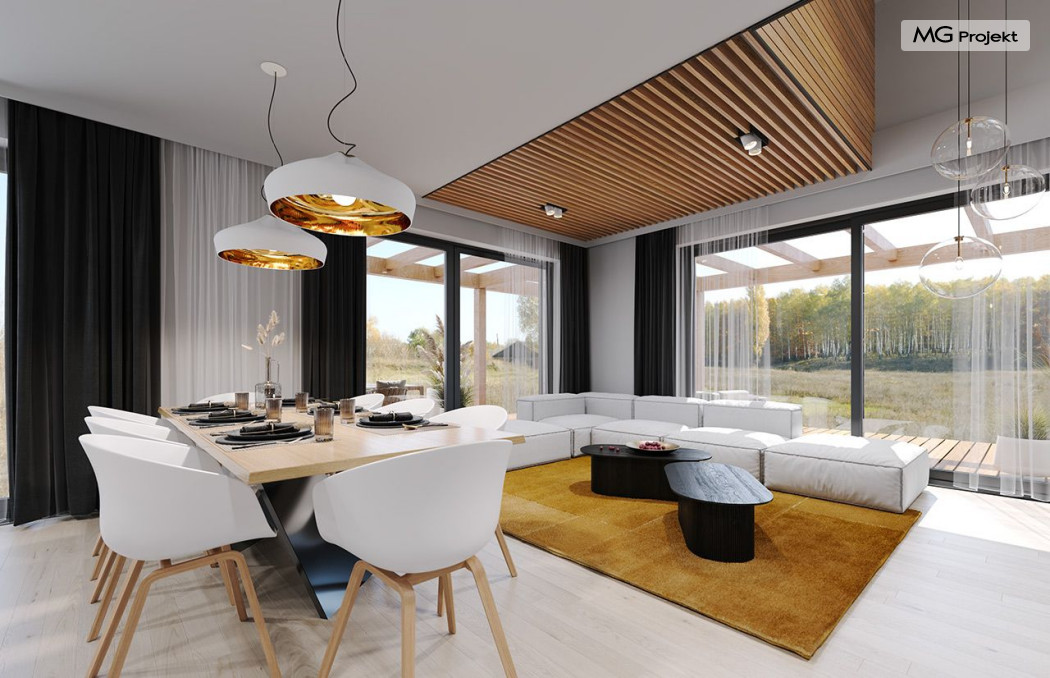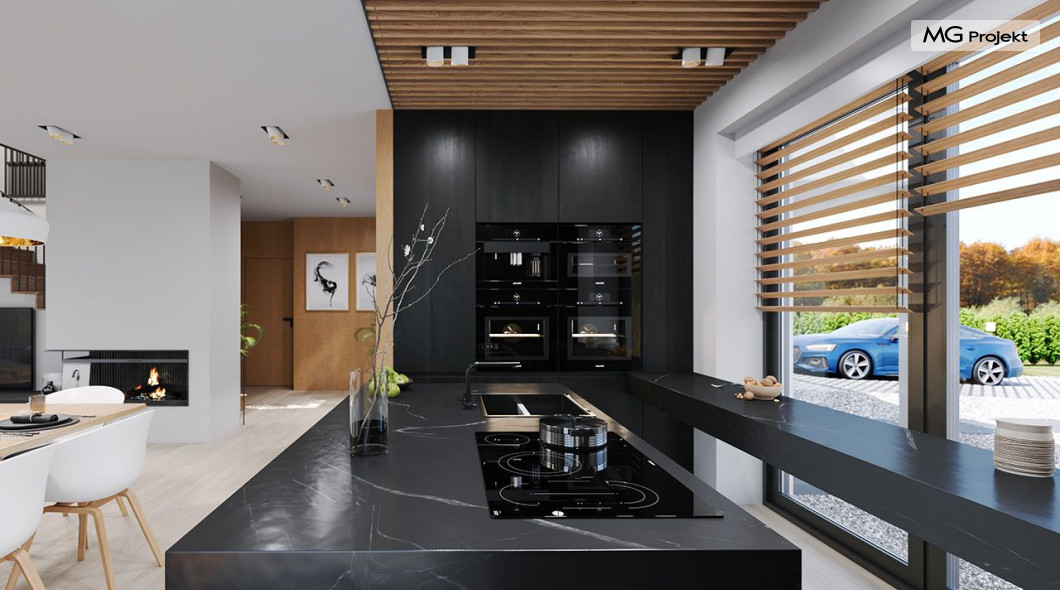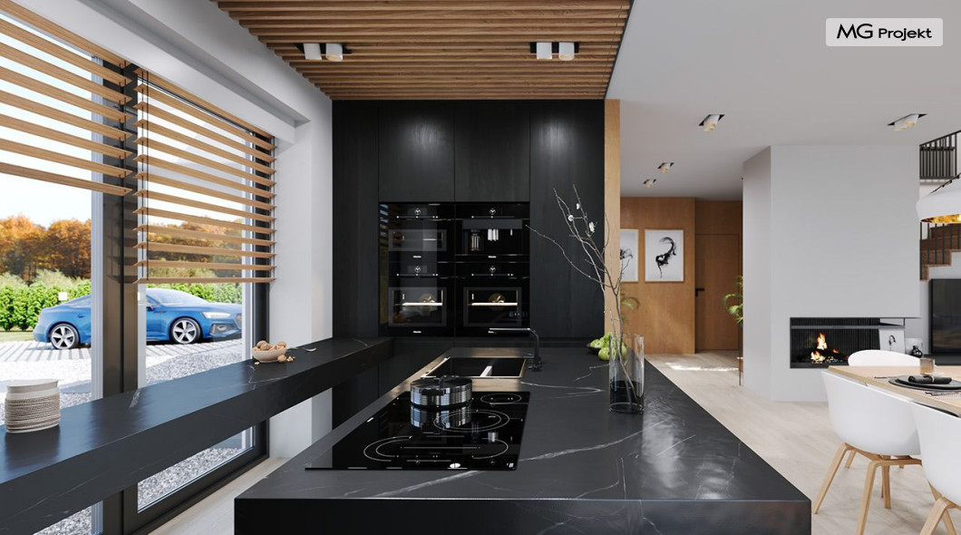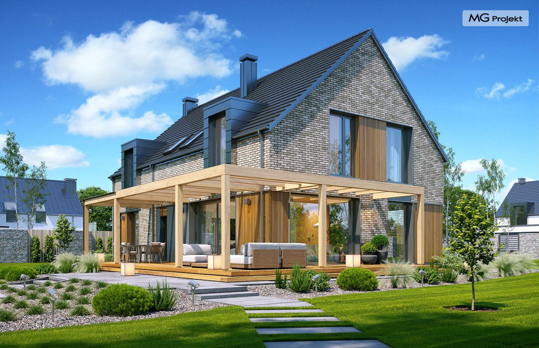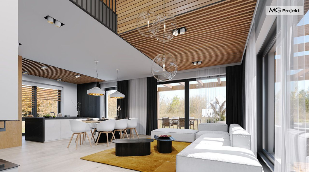 Projekt domu Bolero to projekt domu jednorodzinnego - z naszej serii taneczno-imprezowych domów (Mambo, Lambada, Makarena, Party, Biba, Tango, Salsa, Rumba). Bolero to propozycja praktycznego, funkcjonalnego domu jednorodzinnego, parterowego z poddaszem użytkowym, o nowoczesnej architekturze, w popularnej stylistyce domu-stodoły. Budynek wyróżnia zwarta bryła, nowoczesne detale architektoniczne i funkcjonalne wnętrze. Prostokątny plan, z wbudowanym częściowo garażem przykryto dwuspadowym symetrycznym dachem z wysoką ścianą kolankową poddasza. Sylwetkę domu urozmaicono kubicznymi lukarnami poddasza, a całą fasadę podzielono na poziome pasy wykończone kontrastującymi materiałami. Propozycja elewacji to miks płytki klinkierowej, z fragmentami wykończenia drewnem, oraz tynku. Całość kompozycji zwieńcza dach pokryty płaską dachówką. Oczywiście to jedna z możliwych opcji wykończenia domu od zewnątrz – wszystko zależy od inwencji, wyobraźni i preferencji przyszłych właścicieli. Elewację frontową podkreśla reprezentacyjne wejście z szerokimi drzwiami z naświetlami bocznymi, piękne duże okno kuchni z wyspą, oraz lukarny poddasza z dużymi przeszkleniami. Od strony ogrodowej dom ma spokojniejszą bardziej jednorodną fasadę, z dużymi narożnymi przeszkleniami części dziennej i dodaną pergolą zadaszającą taras ogrodowy. Wnętrze domu zaskakuje poczuciem przestrzeni, niełatwym do uzyskania w 150-metrowym domu. Poczucie przestronności części dziennej potęgują duże przeszklenia salonu na taras, oraz pustka nad salonem i schodami, łącząca pokój dzienny z antresolą na poddaszu. Wnętrze jest bardzo nowoczesne. Przykładem może tu być niebanalna kuchnia z dużą wyspą i oryginalnym baletem roboczym przy oknie. Na parterze prócz salonu zaprojektowano dodatkowy pokój z łazienką, oraz garaż z pomieszczeniem technicznym. Na poddaszu przewidziano cztery pokoje z dwiema łazienkami, w tym apartament master z własną łazienką i garderobą. Wnętrze można dowolnie kształtować, ale bez problemu zmieści się tutaj 4-6cioosobowa rodzina. Budynek zaprojektowano jako energooszczędny, z dobrymi izolacjami i nowoczesnymi instalacjami. Dom ma prostą konstrukcję i zwartą bryłę, dzięki czemu będzie łatwy w budowie i niedrogi w późniejszej eksploatacji. Bolero to propozycja dla Inwestorów pragnących zbudować nowoczesny, nietuzinkowy i ciekawy architektonicznie dom o nieprzesadzonej wielkości. Dom dla Inwestorów chcących połączyć tradycyjną funkcjonalność z ciekawymi designerskimi detalami. Zapraszamy do zapoznania się z całą serią "roztańczonych domów": https://www.mgprojekt.com.pl/makarena, https://www.mgprojekt.com.pl/bolero, https://www.mgprojekt.com.pl/lambada, https://www.mgprojekt.com.pl/party, https://www.mgprojekt.com.pl/party-2, https://www.mgprojekt.com.pl/biba, https://www.mgprojekt.com.pl/tango, https://www.mgprojekt.com.pl/salsa, https://www.mgprojekt.com.pl/rumba, https://www.mgprojekt.com.pl/mambo.