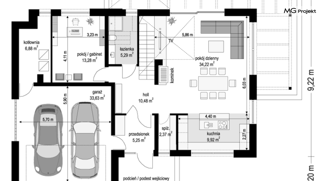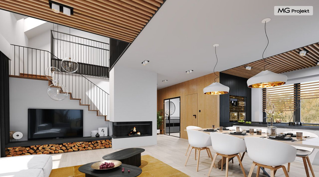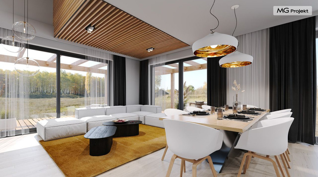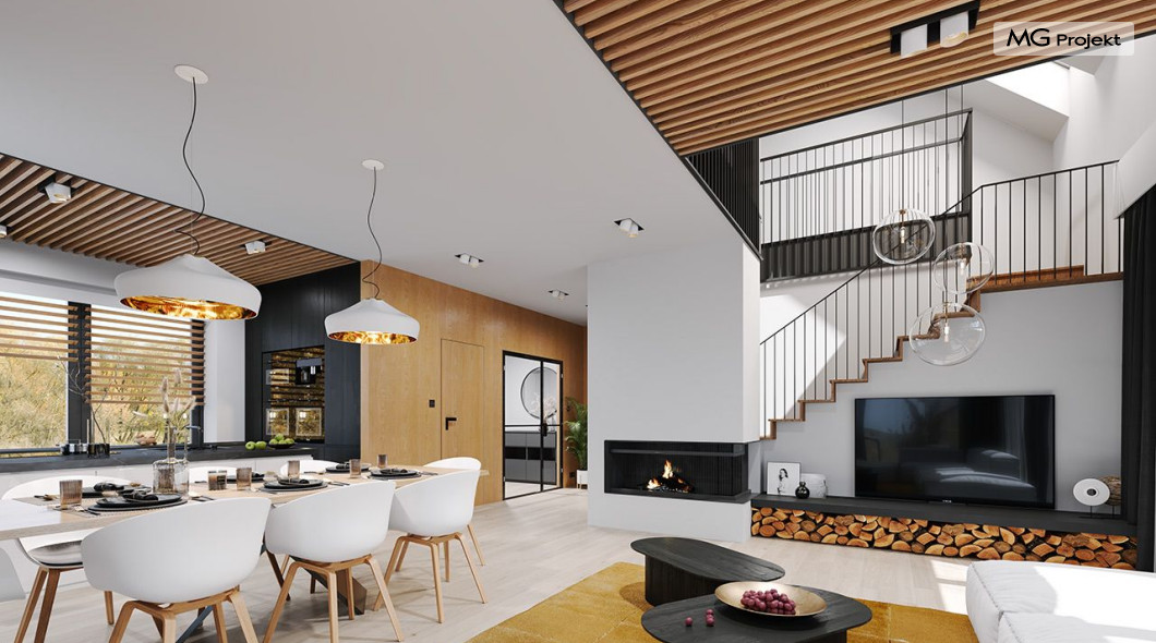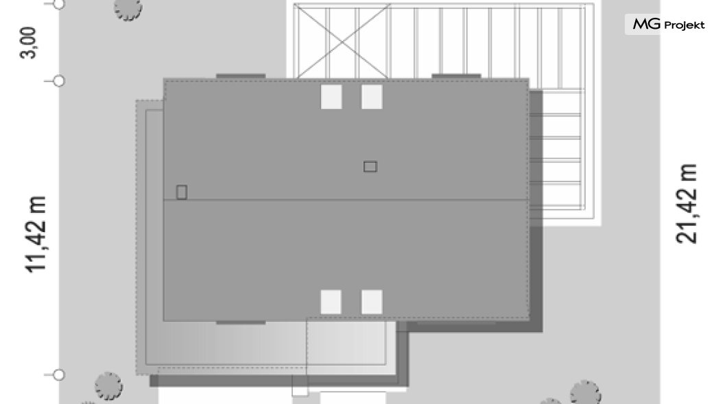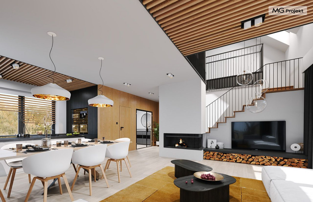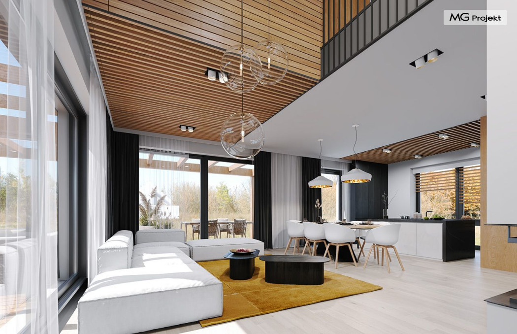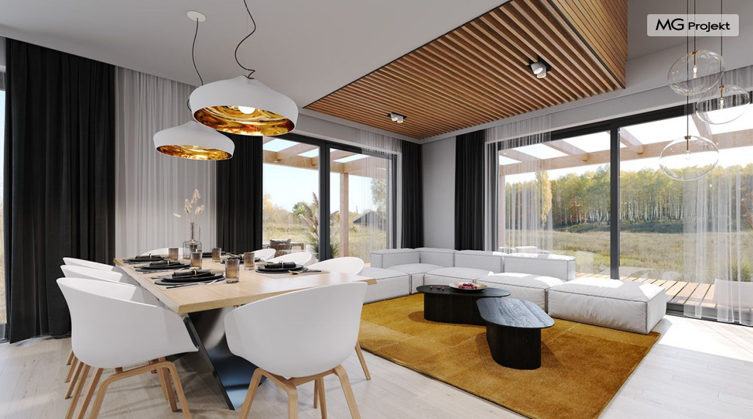 Projekt domu Bolero to projekt domu jednorodzinnego - z naszej serii taneczno-imprezowych domów (Mambo, Lambada, Makarena, Party, Biba, Tango, Salsa, Rumba). Bolero to propozycja praktycznego, funkcjonalnego domu jednorodzinnego, parterowego z poddaszem użytkowym, o nowoczesnej architekturze, w popularnej stylistyce domu-stodoły. Budynek wyróżnia zwarta bryła, nowoczesne detale architektoniczne i funkcjonalne wnętrze. Prostokątny plan, z wbudowanym częściowo garażem przykryto dwuspadowym symetrycznym dachem z wysoką ścianą kolankową poddasza. Sylwetkę domu urozmaicono kubicznymi lukarnami poddasza, a całą fasadę podzielono na poziome pasy wykończone kontrastującymi materiałami. Propozycja elewacji to miks płytki klinkierowej, z fragmentami wykończenia drewnem, oraz tynku. Całość kompozycji zwieńcza dach pokryty płaską dachówką. Oczywiście to jedna z możliwych opcji wykończenia domu od zewnątrz – wszystko zależy od inwencji, wyobraźni i preferencji przyszłych właścicieli. Elewację frontową podkreśla reprezentacyjne wejście z szerokimi drzwiami z naświetlami bocznymi, piękne duże okno kuchni z wyspą, oraz lukarny poddasza z dużymi przeszkleniami. Od strony ogrodowej dom ma spokojniejszą bardziej jednorodną fasadę, z dużymi narożnymi przeszkleniami części dziennej i dodaną pergolą zadaszającą taras ogrodowy. Wnętrze domu zaskakuje poczuciem przestrzeni, niełatwym do uzyskania w 150-metrowym domu. Poczucie przestronności części dziennej potęgują duże przeszklenia salonu na taras, oraz pustka nad salonem i schodami, łącząca pokój dzienny z antresolą na poddaszu. Wnętrze jest bardzo nowoczesne. Przykładem może tu być niebanalna kuchnia z dużą wyspą i oryginalnym baletem roboczym przy oknie. Na parterze prócz salonu zaprojektowano dodatkowy pokój z łazienką, oraz garaż z pomieszczeniem technicznym. Na poddaszu przewidziano cztery pokoje z dwiema łazienkami, w tym apartament master z własną łazienką i garderobą. Wnętrze można dowolnie kształtować, ale bez problemu zmieści się tutaj 4-6cioosobowa rodzina. Budynek zaprojektowano jako energooszczędny, z dobrymi izolacjami i nowoczesnymi instalacjami. Dom ma prostą konstrukcję i zwartą bryłę, dzięki czemu będzie łatwy w budowie i niedrogi w późniejszej eksploatacji. Bolero to propozycja dla Inwestorów pragnących zbudować nowoczesny, nietuzinkowy i ciekawy architektonicznie dom o nieprzesadzonej wielkości. Dom dla Inwestorów chcących połączyć tradycyjną funkcjonalność z ciekawymi designerskimi detalami. Zapraszamy do zapoznania się z całą serią "roztańczonych domów": https://www.mgprojekt.com.pl/makarena, https://www.mgprojekt.com.pl/bolero, https://www.mgprojekt.com.pl/lambada, https://www.mgprojekt.com.pl/party, https://www.mgprojekt.com.pl/party-2, https://www.mgprojekt.com.pl/biba, https://www.mgprojekt.com.pl/tango, https://www.mgprojekt.com.pl/salsa, https://www.mgprojekt.com.pl/rumba, https://www.mgprojekt.com.pl/mambo.