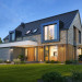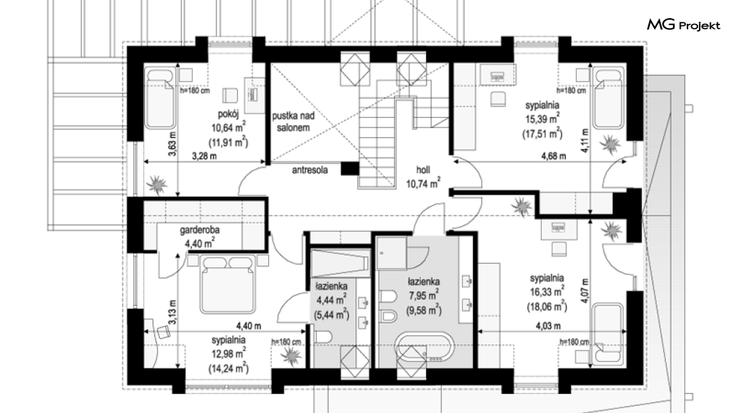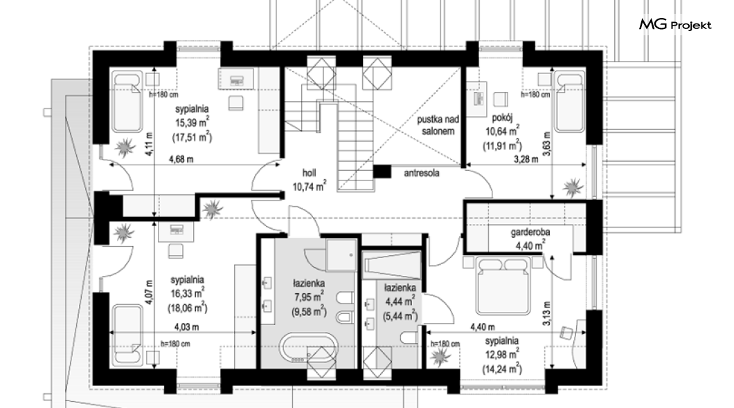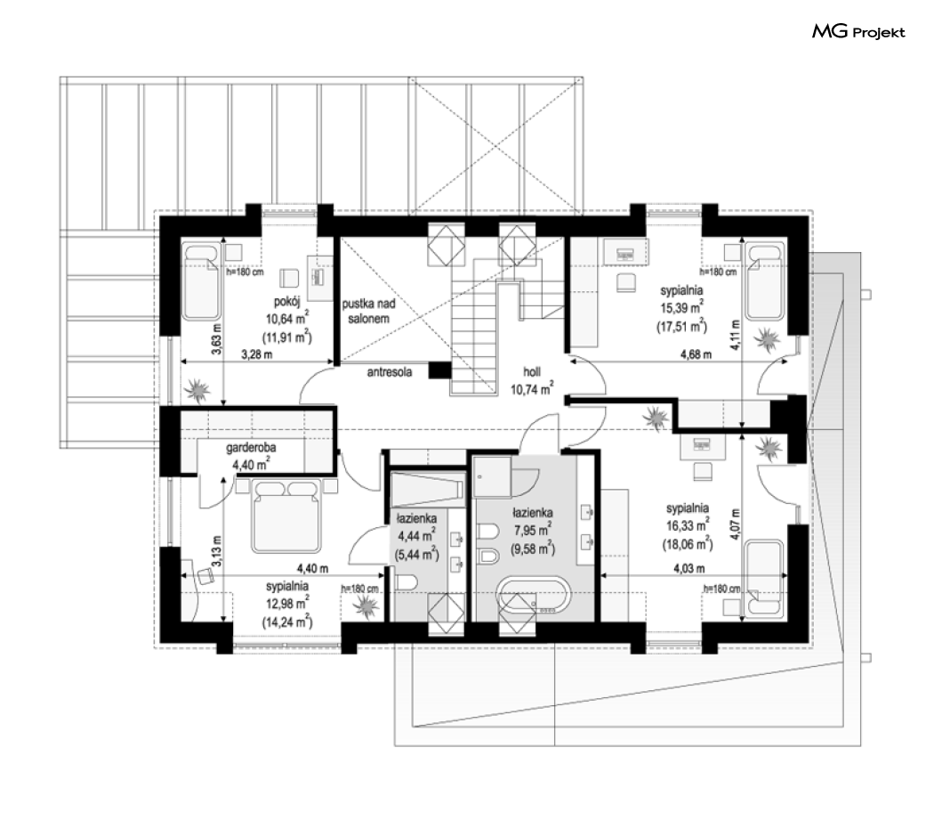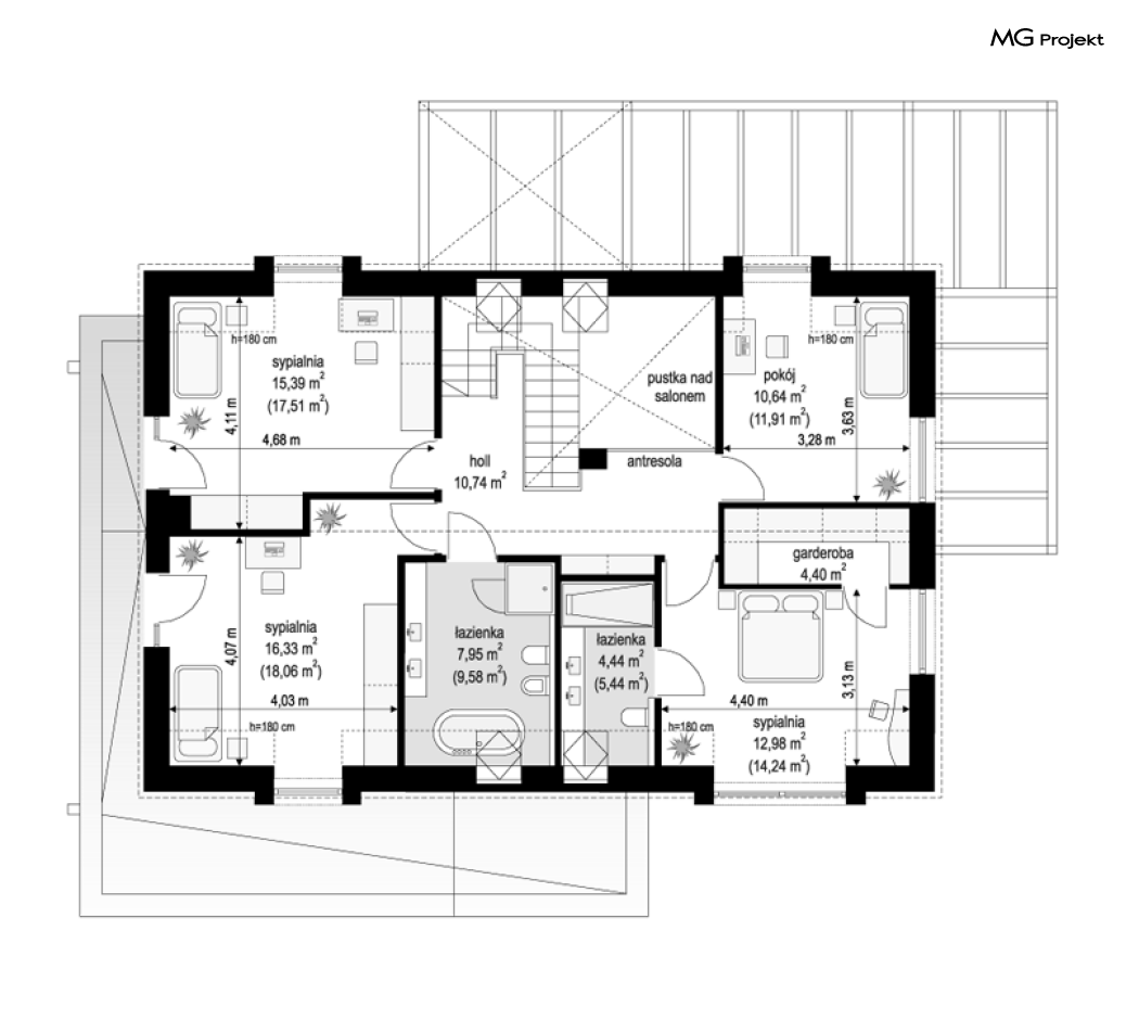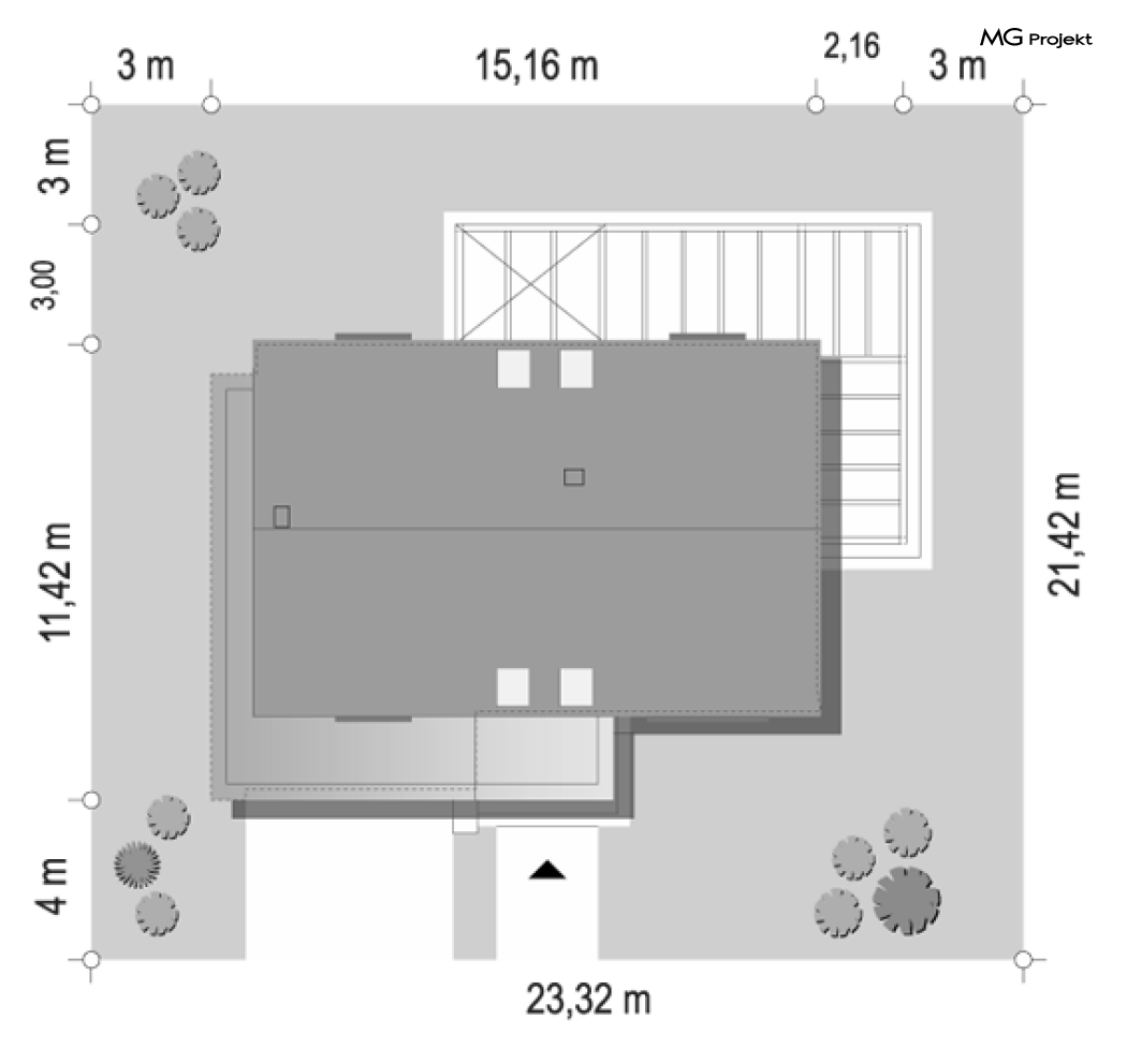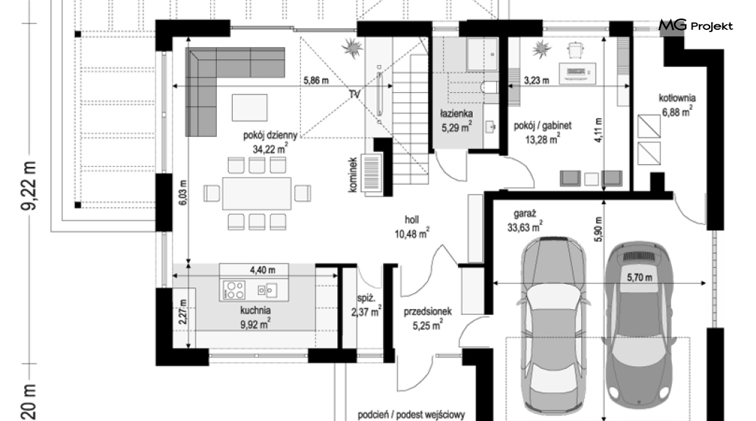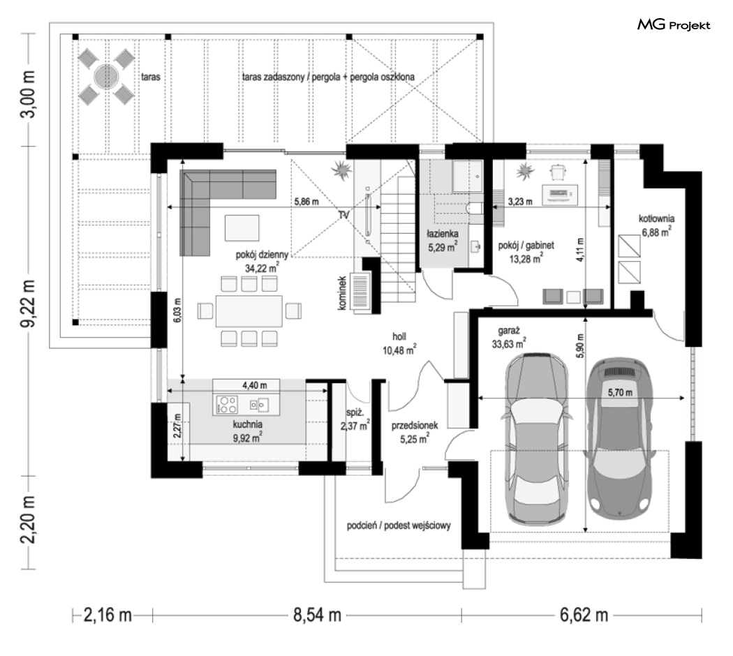 Projekt domu Bolero to projekt domu jednorodzinnego - z naszej serii taneczno-imprezowych domów (Mambo, Lambada, Makarena, Party, Biba, Tango, Salsa, Rumba). Bolero to propozycja praktycznego, funkcjonalnego domu jednorodzinnego, parterowego z poddaszem użytkowym, o nowoczesnej architekturze, w popularnej stylistyce domu-stodoły. Budynek wyróżnia zwarta bryła, nowoczesne detale architektoniczne i funkcjonalne wnętrze. Prostokątny plan, z wbudowanym częściowo garażem przykryto dwuspadowym symetrycznym dachem z wysoką ścianą kolankową poddasza. Sylwetkę domu urozmaicono kubicznymi lukarnami poddasza, a całą fasadę podzielono na poziome pasy wykończone kontrastującymi materiałami. Propozycja elewacji to miks płytki klinkierowej, z fragmentami wykończenia drewnem, oraz tynku. Całość kompozycji zwieńcza dach pokryty płaską dachówką. Oczywiście to jedna z możliwych opcji wykończenia domu od zewnątrz – wszystko zależy od inwencji, wyobraźni i preferencji przyszłych właścicieli. Elewację frontową podkreśla reprezentacyjne wejście z szerokimi drzwiami z naświetlami bocznymi, piękne duże okno kuchni z wyspą, oraz lukarny poddasza z dużymi przeszkleniami. Od strony ogrodowej dom ma spokojniejszą bardziej jednorodną fasadę, z dużymi narożnymi przeszkleniami części dziennej i dodaną pergolą zadaszającą taras ogrodowy. Wnętrze domu zaskakuje poczuciem przestrzeni, niełatwym do uzyskania w 150-metrowym domu. Poczucie przestronności części dziennej potęgują duże przeszklenia salonu na taras, oraz pustka nad salonem i schodami, łącząca pokój dzienny z antresolą na poddaszu. Wnętrze jest bardzo nowoczesne. Przykładem może tu być niebanalna kuchnia z dużą wyspą i oryginalnym baletem roboczym przy oknie. Na parterze prócz salonu zaprojektowano dodatkowy pokój z łazienką, oraz garaż z pomieszczeniem technicznym. Na poddaszu przewidziano cztery pokoje z dwiema łazienkami, w tym apartament master z własną łazienką i garderobą. Wnętrze można dowolnie kształtować, ale bez problemu zmieści się tutaj 4-6cioosobowa rodzina. Budynek zaprojektowano jako energooszczędny, z dobrymi izolacjami i nowoczesnymi instalacjami. Dom ma prostą konstrukcję i zwartą bryłę, dzięki czemu będzie łatwy w budowie i niedrogi w późniejszej eksploatacji. Bolero to propozycja dla Inwestorów pragnących zbudować nowoczesny, nietuzinkowy i ciekawy architektonicznie dom o nieprzesadzonej wielkości. Dom dla Inwestorów chcących połączyć tradycyjną funkcjonalność z ciekawymi designerskimi detalami. Zapraszamy do zapoznania się z całą serią "roztańczonych domów": https://www.mgprojekt.com.pl/makarena, https://www.mgprojekt.com.pl/bolero, https://www.mgprojekt.com.pl/lambada, https://www.mgprojekt.com.pl/party, https://www.mgprojekt.com.pl/party-2, https://www.mgprojekt.com.pl/biba, https://www.mgprojekt.com.pl/tango, https://www.mgprojekt.com.pl/salsa, https://www.mgprojekt.com.pl/rumba, https://www.mgprojekt.com.pl/mambo.
