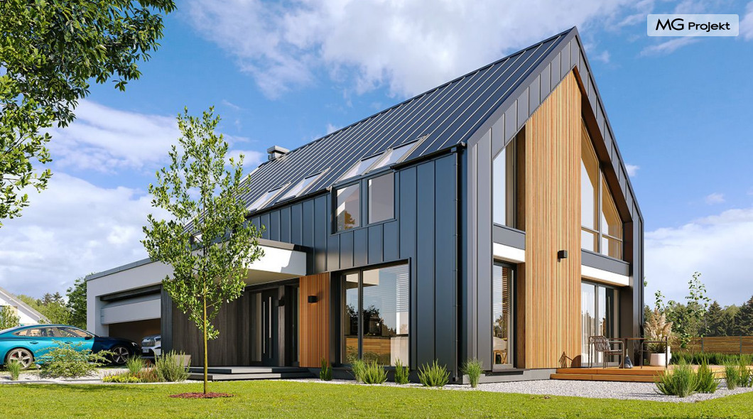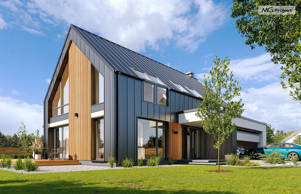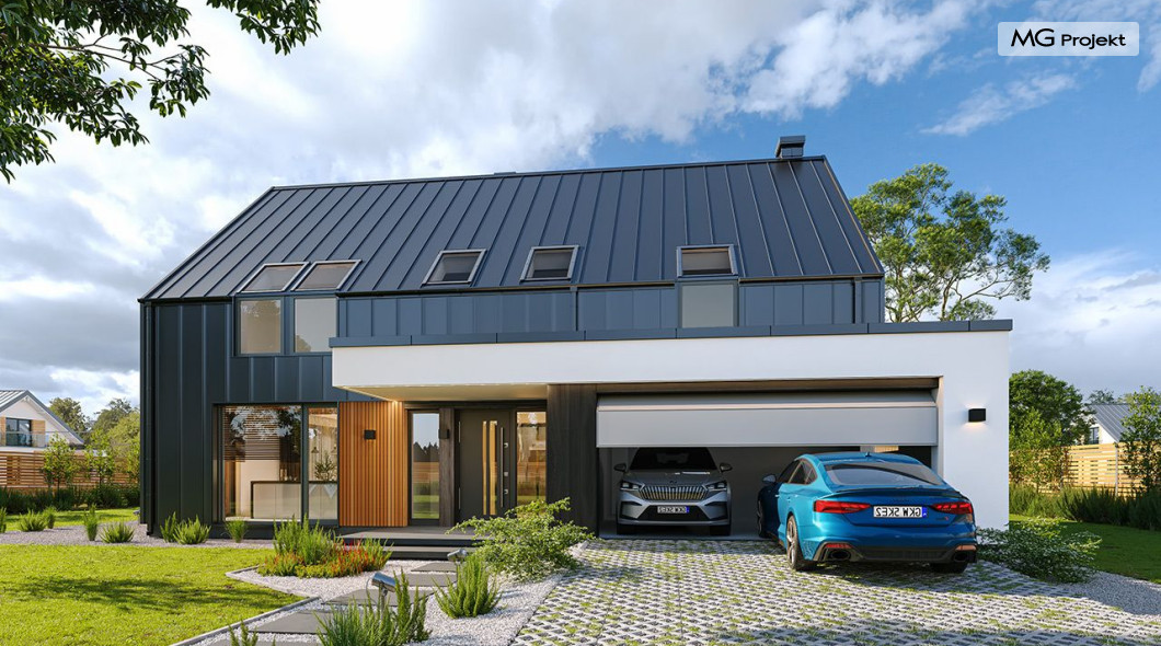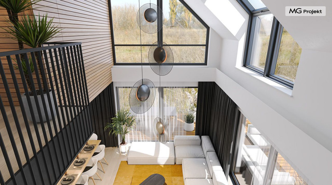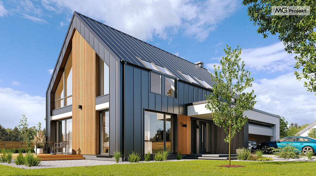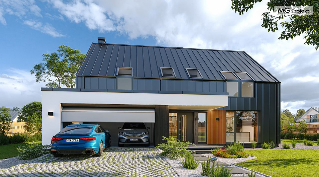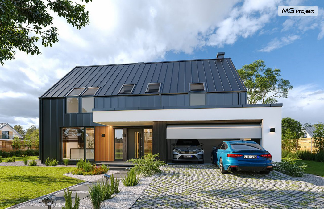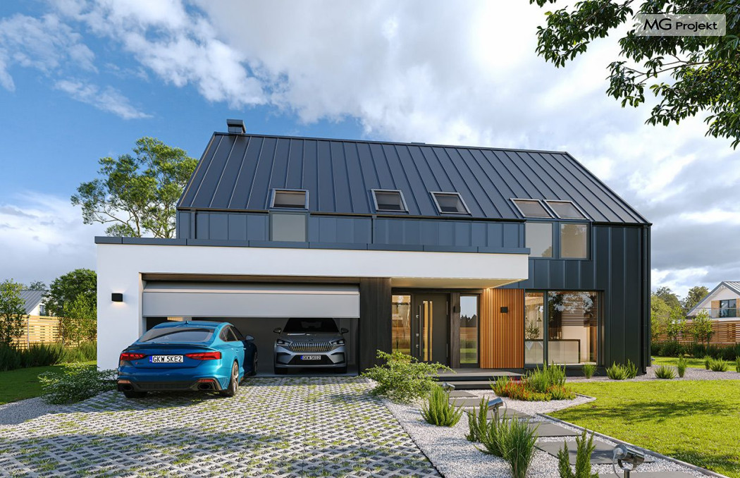 Projekt domu Makarena to projekt nowoczesnej stodoły z naszej serii taneczno-imprezowych domów (Mambo, Bolero, Lambada, Party, Biba, Tango, Salsa, Rumba). To wyjątkowy projekt w naszej ofercie - tylko dla odważnych Inwestorów, patrzących z wizją i wyobraźnią na swoją przeszłą inwestycję. Makarena to połączenie bezkompromisowej architektury, zamkniętej w nowoczesnej formie domu- stodoły, oraz funkcjonalnego parterowego domku jednorodzinnego z poddaszem użytkowym. Rzut domu na planie prostokąta, z wbudowanym parterowym garażem, wieńczy dwuspadowy symetryczny dach z wysoką ścianą kolankową poddasza. Całość bryły budynku wykończona jest blachą na rąbek stojący - zarówno połacie dachu jak i ściany elewacji bocznych. Jednolitą materiałowo i kolorystycznie bryłę przecinają duże przeszklenia okienne, fragmenty elewacji drewnianej, parterowy garaż od frontu i pergola od strony elewacji ogrodowej. Antracytowy kolor blachy kontrastuje z elementami drewnianymi, z fragmentami elewacji tynkowanej i z szybami otwierającymi wnętrze lub odbijającymi otaczającą dom zieleń. Sylwetka i bryła budynku jest bardzo nowoczesna, bezkompromisowa w swym wyrazie, nietuzinkowa. Dom z pewnością ma oryginalny wyraz i będzie przyciągał spojrzenia. Od strony elewacji frontowej pierwsze skrzypce gra reprezentacyjne wejście do domu - z drzwiami wejściowymi z naświetlami bocznymi, oraz duże okno kuchenne otwierające wnętrze kuchni z wyspą. Strona ogrodowa to piękne przeszklenia salonu, w tym wysokie dwukondygnacyjne okno antresoli, oraz drewniane elementy - taras, okładzina szczytu i pergola, przełamujące monotonię ciemnej blachy. Wnętrze domu zaskakuje poczuciem dużej przestrzeni części dziennej - niełatwym do uzyskania w 150-metrowym domu. Wrażenie przestronności potęgują duże przeszklenia, oraz pustka nad salonem i schodami, łącząca pokój dzienny z antresolą na poddaszu. Wnętrze jest bardzo nowoczesne. Dominują tu trzy przenikające się kolory i materiały : biel ścian, drewno i kontrastujące wstawki w szarości i czerni. Na parterze prócz części dziennej znajdziemy dodatkowy pokój z łazienką, oraz garaż z pomieszczeniem technicznym. Na poddaszu przewidziano trzy pokoje sypialne z dwiema łazienkami, w tym apartament master z własną łazienką i garderobą. Wnętrze można dowolnie kształtować, ale bez problemu zmieści się tutaj 4-6cioosobowa rodzina. Budynek zaprojektowano jako energooszczędny, z dobrymi izolacjami i nowoczesnymi instalacjami. Dom, mimo ekstrawaganckiego wyglądu, ma prostą konstrukcję i zwartą bryłę, dzięki czemu będzie łatwy w budowie i niedrogi w późniejszej eksploatacji. Makarena to propozycja dla Inwestorów pragnących zbudować oryginalny, wyjątkowy dom o ultranowoczesnym bezkompromisowym wyglądzie. Dom, który jest nietuzinkową i wyjątkową scenografią codziennego życia, który sam w sobie podnosi jego jakość, ciesząc zmysły właścicieli i przyciągając zaciekawione spojrzenia sąsiadów i przechodniów. Makarena do dom dla Inwestorów chcących wyrazić siebie i zaznaczyć swój wyraźny i oryginalny ślad. Zapraszamy do zapoznania się z całą serią "roztańczonych domów": https://www.mgprojekt.com.pl/makarena, https://www.mgprojekt.com.pl/bolero, https://www.mgprojekt.com.pl/lambada, https://www.mgprojekt.com.pl/party, https://www.mgprojekt.com.pl/party-2, https://www.mgprojekt.com.pl/biba, https://www.mgprojekt.com.pl/tango, https://www.mgprojekt.com.pl/salsa, https://www.mgprojekt.com.pl/rumba.