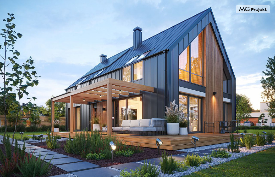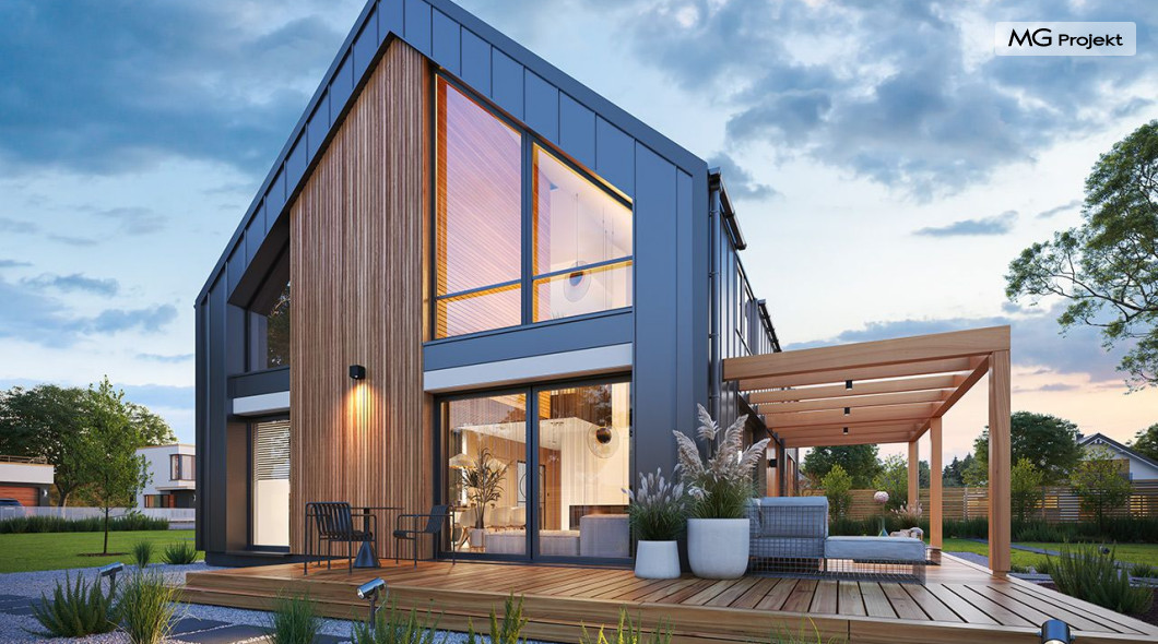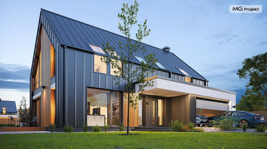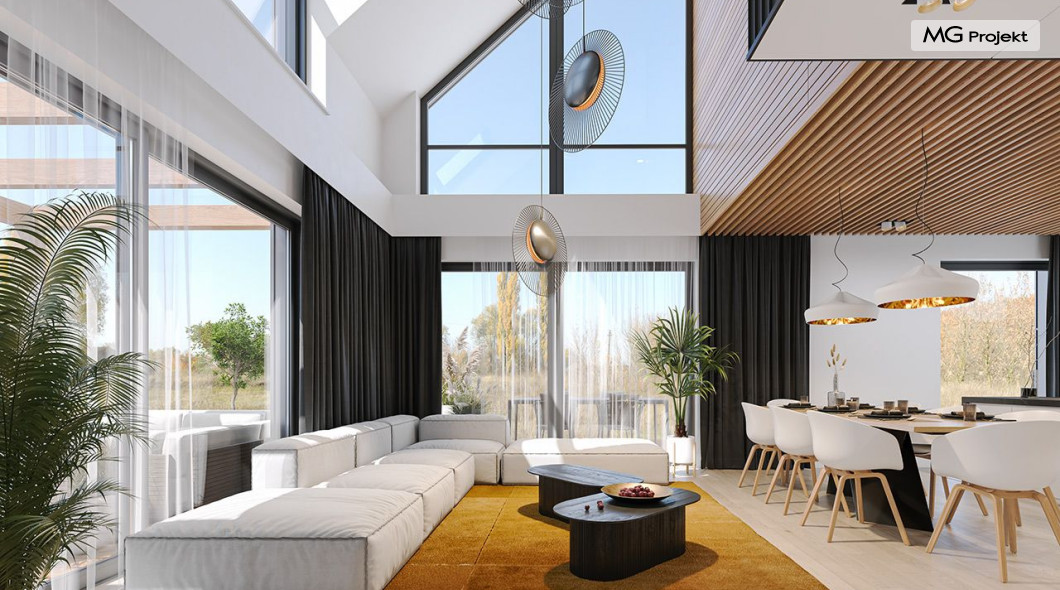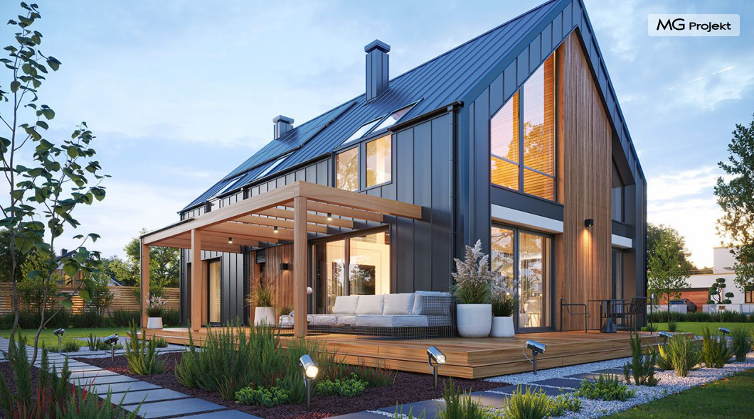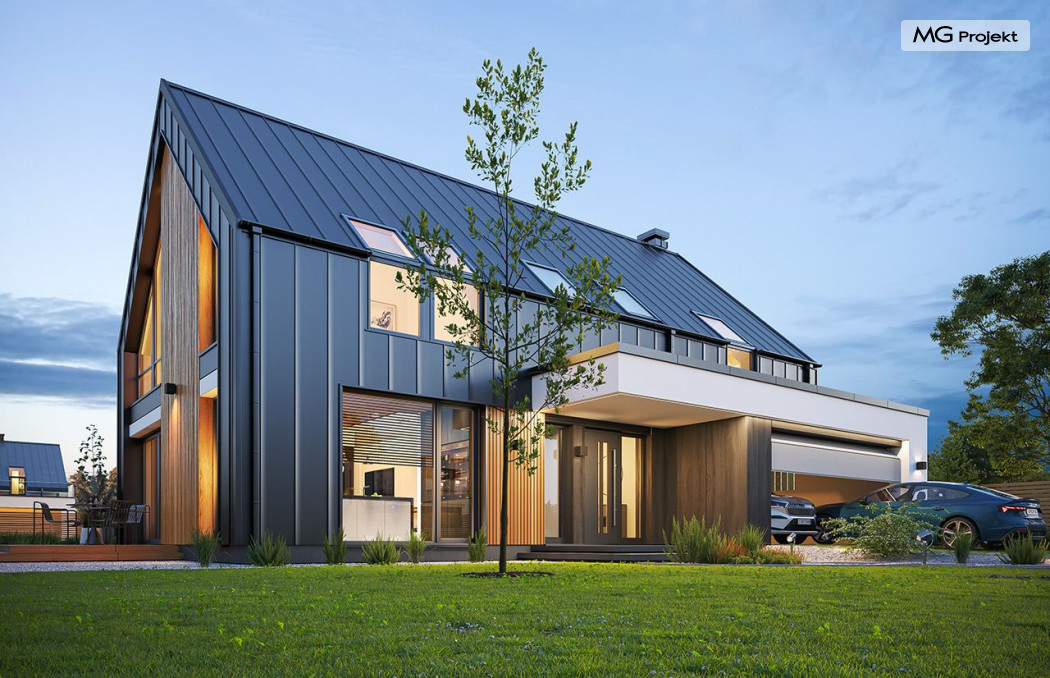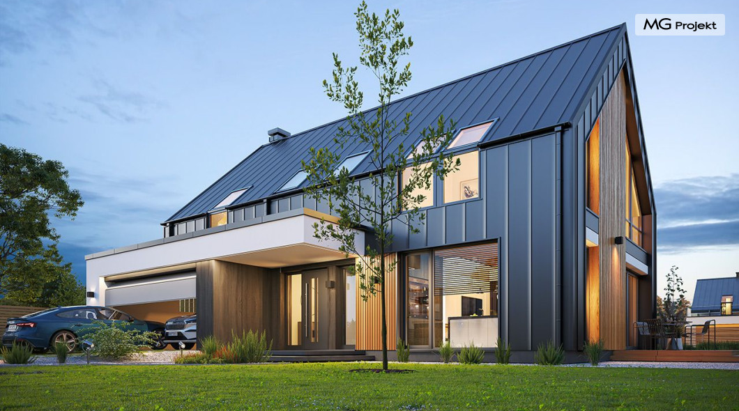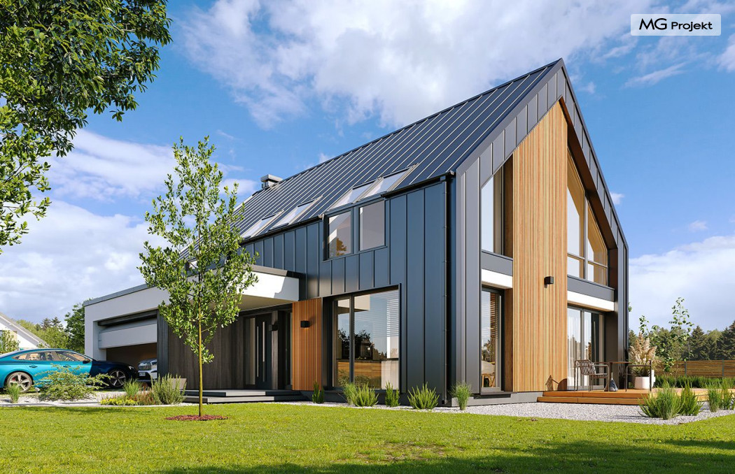 Projekt domu Makarena to projekt nowoczesnej stodoły z naszej serii taneczno-imprezowych domów (Mambo, Bolero, Lambada, Party, Biba, Tango, Salsa, Rumba). To wyjątkowy projekt w naszej ofercie - tylko dla odważnych Inwestorów, patrzących z wizją i wyobraźnią na swoją przeszłą inwestycję. Makarena to połączenie bezkompromisowej architektury, zamkniętej w nowoczesnej formie domu- stodoły, oraz funkcjonalnego parterowego domku jednorodzinnego z poddaszem użytkowym. Rzut domu na planie prostokąta, z wbudowanym parterowym garażem, wieńczy dwuspadowy symetryczny dach z wysoką ścianą kolankową poddasza. Całość bryły budynku wykończona jest blachą na rąbek stojący - zarówno połacie dachu jak i ściany elewacji bocznych. Jednolitą materiałowo i kolorystycznie bryłę przecinają duże przeszklenia okienne, fragmenty elewacji drewnianej, parterowy garaż od frontu i pergola od strony elewacji ogrodowej. Antracytowy kolor blachy kontrastuje z elementami drewnianymi, z fragmentami elewacji tynkowanej i z szybami otwierającymi wnętrze lub odbijającymi otaczającą dom zieleń. Sylwetka i bryła budynku jest bardzo nowoczesna, bezkompromisowa w swym wyrazie, nietuzinkowa. Dom z pewnością ma oryginalny wyraz i będzie przyciągał spojrzenia. Od strony elewacji frontowej pierwsze skrzypce gra reprezentacyjne wejście do domu - z drzwiami wejściowymi z naświetlami bocznymi, oraz duże okno kuchenne otwierające wnętrze kuchni z wyspą. Strona ogrodowa to piękne przeszklenia salonu, w tym wysokie dwukondygnacyjne okno antresoli, oraz drewniane elementy - taras, okładzina szczytu i pergola, przełamujące monotonię ciemnej blachy. Wnętrze domu zaskakuje poczuciem dużej przestrzeni części dziennej - niełatwym do uzyskania w 150-metrowym domu. Wrażenie przestronności potęgują duże przeszklenia, oraz pustka nad salonem i schodami, łącząca pokój dzienny z antresolą na poddaszu. Wnętrze jest bardzo nowoczesne. Dominują tu trzy przenikające się kolory i materiały : biel ścian, drewno i kontrastujące wstawki w szarości i czerni. Na parterze prócz części dziennej znajdziemy dodatkowy pokój z łazienką, oraz garaż z pomieszczeniem technicznym. Na poddaszu przewidziano trzy pokoje sypialne z dwiema łazienkami, w tym apartament master z własną łazienką i garderobą. Wnętrze można dowolnie kształtować, ale bez problemu zmieści się tutaj 4-6cioosobowa rodzina. Budynek zaprojektowano jako energooszczędny, z dobrymi izolacjami i nowoczesnymi instalacjami. Dom, mimo ekstrawaganckiego wyglądu, ma prostą konstrukcję i zwartą bryłę, dzięki czemu będzie łatwy w budowie i niedrogi w późniejszej eksploatacji. Makarena to propozycja dla Inwestorów pragnących zbudować oryginalny, wyjątkowy dom o ultranowoczesnym bezkompromisowym wyglądzie. Dom, który jest nietuzinkową i wyjątkową scenografią codziennego życia, który sam w sobie podnosi jego jakość, ciesząc zmysły właścicieli i przyciągając zaciekawione spojrzenia sąsiadów i przechodniów. Makarena do dom dla Inwestorów chcących wyrazić siebie i zaznaczyć swój wyraźny i oryginalny ślad. Zapraszamy do zapoznania się z całą serią "roztańczonych domów": https://www.mgprojekt.com.pl/makarena, https://www.mgprojekt.com.pl/bolero, https://www.mgprojekt.com.pl/lambada, https://www.mgprojekt.com.pl/party, https://www.mgprojekt.com.pl/party-2, https://www.mgprojekt.com.pl/biba, https://www.mgprojekt.com.pl/tango, https://www.mgprojekt.com.pl/salsa, https://www.mgprojekt.com.pl/rumba.