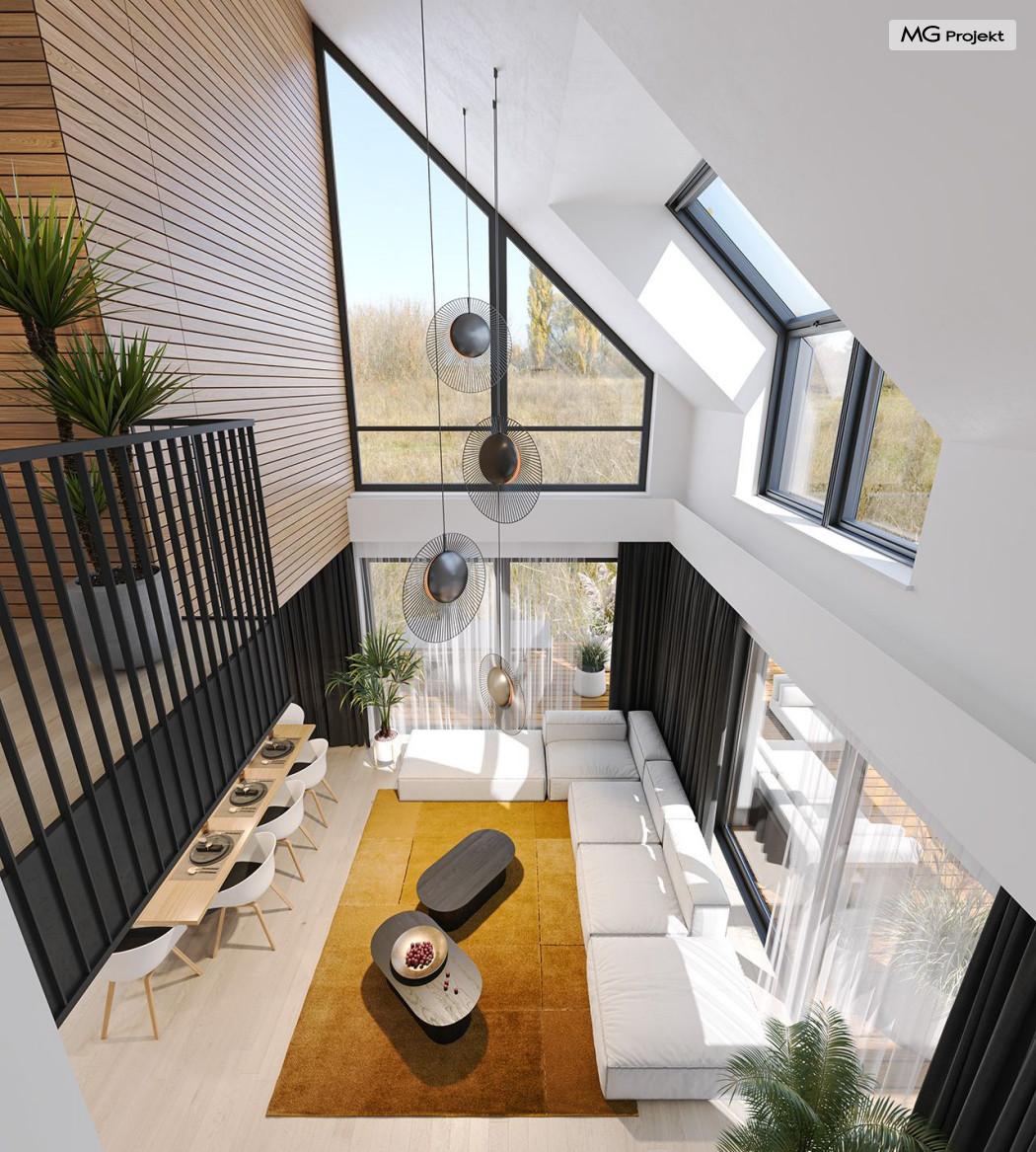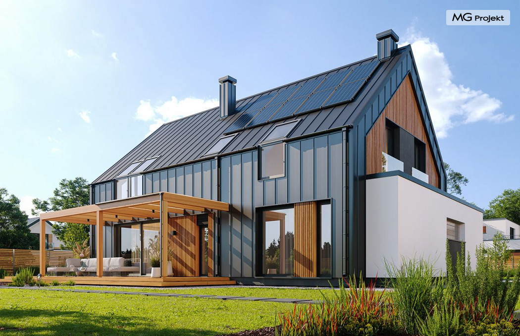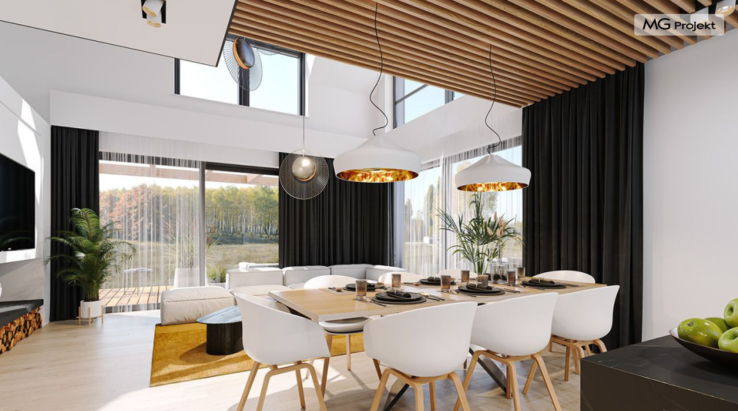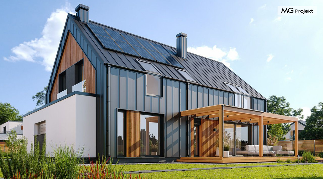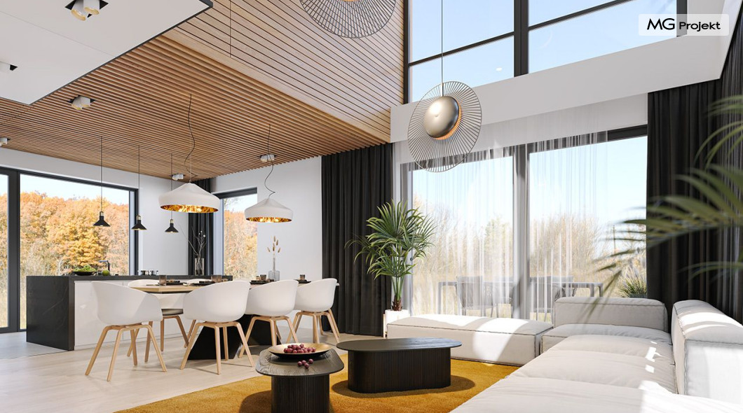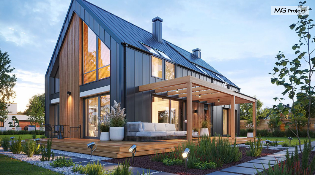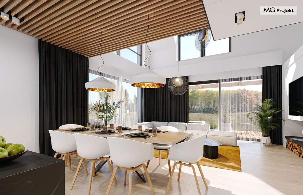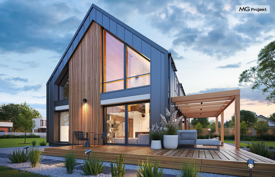Projekt domu Makarena to projekt nowoczesnej stodoły z naszej serii taneczno-imprezowych domów (Mambo, Bolero, Lambada, Party, Biba, Tango, Salsa, Rumba). To wyjątkowy projekt w naszej ofercie - tylko dla odważnych Inwestorów, patrzących z wizją i wyobraźnią na swoją przeszłą inwestycję. Makarena to połączenie bezkompromisowej architektury, zamkniętej w nowoczesnej formie domu- stodoły, oraz funkcjonalnego parterowego domku jednorodzinnego z poddaszem użytkowym. Rzut domu na planie prostokąta, z wbudowanym parterowym garażem, wieńczy dwuspadowy symetryczny dach z wysoką ścianą kolankową poddasza. Całość bryły budynku wykończona jest blachą na rąbek stojący - zarówno połacie dachu jak i ściany elewacji bocznych. Jednolitą materiałowo i kolorystycznie bryłę przecinają duże przeszklenia okienne, fragmenty elewacji drewnianej, parterowy garaż od frontu i pergola od strony elewacji ogrodowej. Antracytowy kolor blachy kontrastuje z elementami drewnianymi, z fragmentami elewacji tynkowanej i z szybami otwierającymi wnętrze lub odbijającymi otaczającą dom zieleń. Sylwetka i bryła budynku jest bardzo nowoczesna, bezkompromisowa w swym wyrazie, nietuzinkowa. Dom z pewnością ma oryginalny wyraz i będzie przyciągał spojrzenia. Od strony elewacji frontowej pierwsze skrzypce gra reprezentacyjne wejście do domu - z drzwiami wejściowymi z naświetlami bocznymi, oraz duże okno kuchenne otwierające wnętrze kuchni z wyspą. Strona ogrodowa to piękne przeszklenia salonu, w tym wysokie dwukondygnacyjne okno antresoli, oraz drewniane elementy - taras, okładzina szczytu i pergola, przełamujące monotonię ciemnej blachy. Wnętrze domu zaskakuje poczuciem dużej przestrzeni części dziennej - niełatwym do uzyskania w 150-metrowym domu. Wrażenie przestronności potęgują duże przeszklenia, oraz pustka nad salonem i schodami, łącząca pokój dzienny z antresolą na poddaszu. Wnętrze jest bardzo nowoczesne. Dominują tu trzy przenikające się kolory i materiały : biel ścian, drewno i kontrastujące wstawki w szarości i czerni. Na parterze prócz części dziennej znajdziemy dodatkowy pokój z łazienką, oraz garaż z pomieszczeniem technicznym. Na poddaszu przewidziano trzy pokoje sypialne z dwiema łazienkami, w tym apartament master z własną łazienką i garderobą. Wnętrze można dowolnie kształtować, ale bez problemu zmieści się tutaj 4-6cioosobowa rodzina. Budynek zaprojektowano jako energooszczędny, z dobrymi izolacjami i nowoczesnymi instalacjami. Dom, mimo ekstrawaganckiego wyglądu, ma prostą konstrukcję i zwartą bryłę, dzięki czemu będzie łatwy w budowie i niedrogi w późniejszej eksploatacji. Makarena to propozycja dla Inwestorów pragnących zbudować oryginalny, wyjątkowy dom o ultranowoczesnym bezkompromisowym wyglądzie. Dom, który jest nietuzinkową i wyjątkową scenografią codziennego życia, który sam w sobie podnosi jego jakość, ciesząc zmysły właścicieli i przyciągając zaciekawione spojrzenia sąsiadów i przechodniów. Makarena do dom dla Inwestorów chcących wyrazić siebie i zaznaczyć swój wyraźny i oryginalny ślad. Zapraszamy do zapoznania się z całą serią "roztańczonych domów": https://www.mgprojekt.com.pl/makarena, https://www.mgprojekt.com.pl/bolero, https://www.mgprojekt.com.pl/lambada, https://www.mgprojekt.com.pl/party, https://www.mgprojekt.com.pl/party-2, https://www.mgprojekt.com.pl/biba, https://www.mgprojekt.com.pl/tango, https://www.mgprojekt.com.pl/salsa, https://www.mgprojekt.com.pl/rumba.