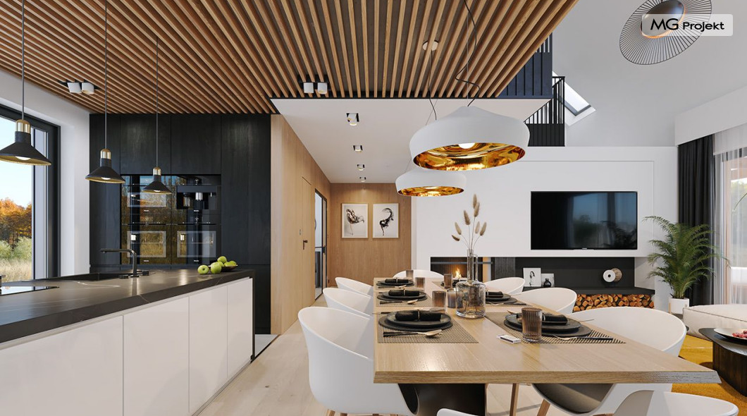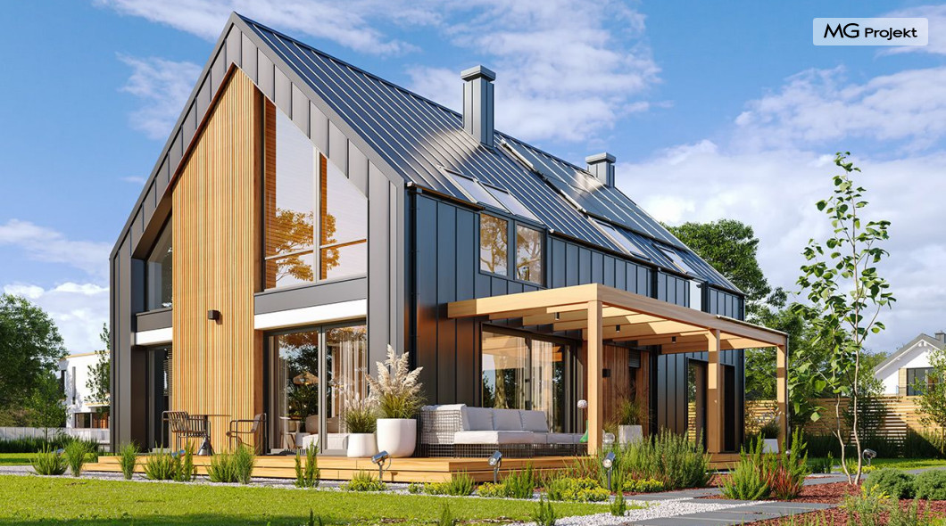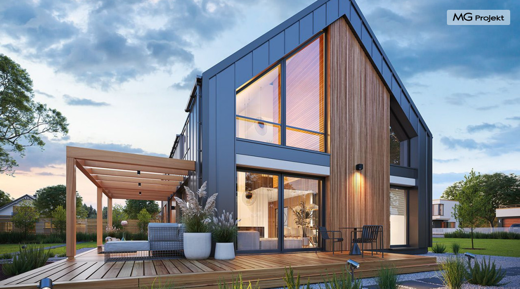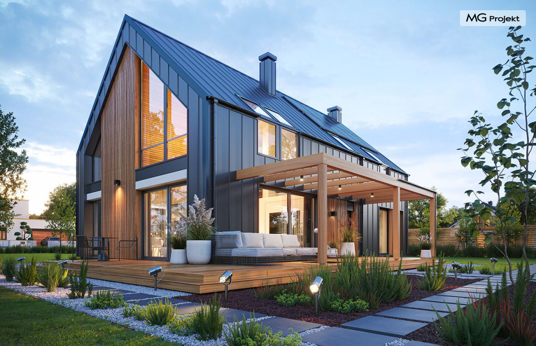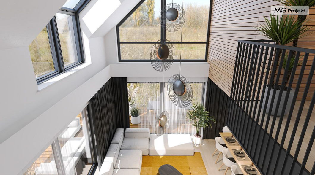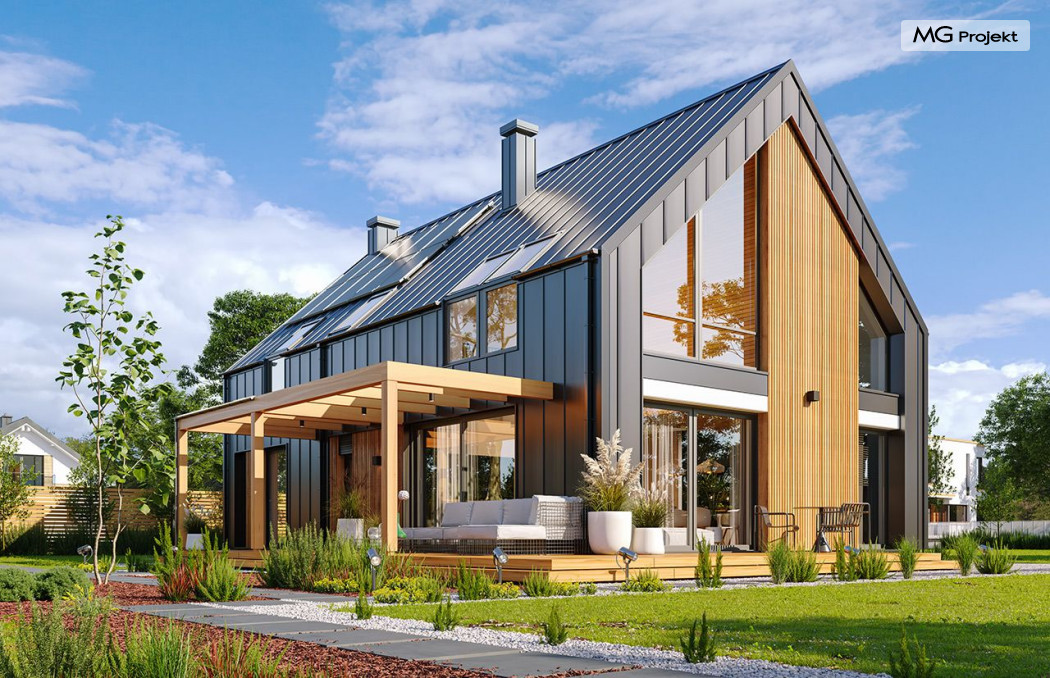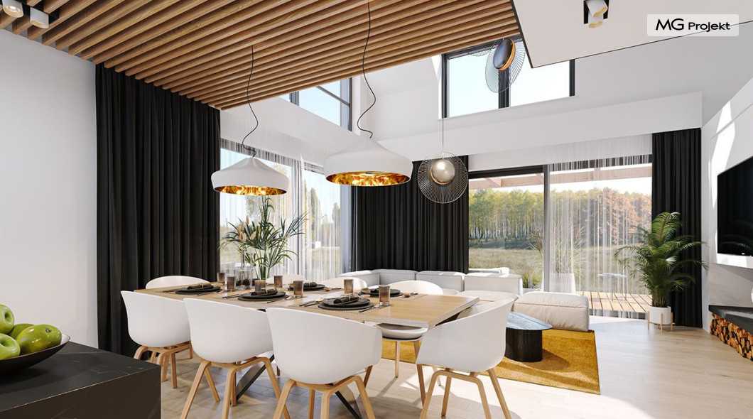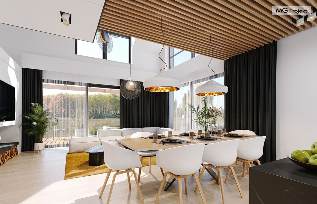 Projekt domu Makarena to projekt nowoczesnej stodoły z naszej serii taneczno-imprezowych domów (Mambo, Bolero, Lambada, Party, Biba, Tango, Salsa, Rumba). To wyjątkowy projekt w naszej ofercie - tylko dla odważnych Inwestorów, patrzących z wizją i wyobraźnią na swoją przeszłą inwestycję. Makarena to połączenie bezkompromisowej architektury, zamkniętej w nowoczesnej formie domu- stodoły, oraz funkcjonalnego parterowego domku jednorodzinnego z poddaszem użytkowym. Rzut domu na planie prostokąta, z wbudowanym parterowym garażem, wieńczy dwuspadowy symetryczny dach z wysoką ścianą kolankową poddasza. Całość bryły budynku wykończona jest blachą na rąbek stojący - zarówno połacie dachu jak i ściany elewacji bocznych. Jednolitą materiałowo i kolorystycznie bryłę przecinają duże przeszklenia okienne, fragmenty elewacji drewnianej, parterowy garaż od frontu i pergola od strony elewacji ogrodowej. Antracytowy kolor blachy kontrastuje z elementami drewnianymi, z fragmentami elewacji tynkowanej i z szybami otwierającymi wnętrze lub odbijającymi otaczającą dom zieleń. Sylwetka i bryła budynku jest bardzo nowoczesna, bezkompromisowa w swym wyrazie, nietuzinkowa. Dom z pewnością ma oryginalny wyraz i będzie przyciągał spojrzenia. Od strony elewacji frontowej pierwsze skrzypce gra reprezentacyjne wejście do domu - z drzwiami wejściowymi z naświetlami bocznymi, oraz duże okno kuchenne otwierające wnętrze kuchni z wyspą. Strona ogrodowa to piękne przeszklenia salonu, w tym wysokie dwukondygnacyjne okno antresoli, oraz drewniane elementy - taras, okładzina szczytu i pergola, przełamujące monotonię ciemnej blachy. Wnętrze domu zaskakuje poczuciem dużej przestrzeni części dziennej - niełatwym do uzyskania w 150-metrowym domu. Wrażenie przestronności potęgują duże przeszklenia, oraz pustka nad salonem i schodami, łącząca pokój dzienny z antresolą na poddaszu. Wnętrze jest bardzo nowoczesne. Dominują tu trzy przenikające się kolory i materiały : biel ścian, drewno i kontrastujące wstawki w szarości i czerni. Na parterze prócz części dziennej znajdziemy dodatkowy pokój z łazienką, oraz garaż z pomieszczeniem technicznym. Na poddaszu przewidziano trzy pokoje sypialne z dwiema łazienkami, w tym apartament master z własną łazienką i garderobą. Wnętrze można dowolnie kształtować, ale bez problemu zmieści się tutaj 4-6cioosobowa rodzina. Budynek zaprojektowano jako energooszczędny, z dobrymi izolacjami i nowoczesnymi instalacjami. Dom, mimo ekstrawaganckiego wyglądu, ma prostą konstrukcję i zwartą bryłę, dzięki czemu będzie łatwy w budowie i niedrogi w późniejszej eksploatacji. Makarena to propozycja dla Inwestorów pragnących zbudować oryginalny, wyjątkowy dom o ultranowoczesnym bezkompromisowym wyglądzie. Dom, który jest nietuzinkową i wyjątkową scenografią codziennego życia, który sam w sobie podnosi jego jakość, ciesząc zmysły właścicieli i przyciągając zaciekawione spojrzenia sąsiadów i przechodniów. Makarena do dom dla Inwestorów chcących wyrazić siebie i zaznaczyć swój wyraźny i oryginalny ślad. Zapraszamy do zapoznania się z całą serią "roztańczonych domów": https://www.mgprojekt.com.pl/makarena, https://www.mgprojekt.com.pl/bolero, https://www.mgprojekt.com.pl/lambada, https://www.mgprojekt.com.pl/party, https://www.mgprojekt.com.pl/party-2, https://www.mgprojekt.com.pl/biba, https://www.mgprojekt.com.pl/tango, https://www.mgprojekt.com.pl/salsa, https://www.mgprojekt.com.pl/rumba.