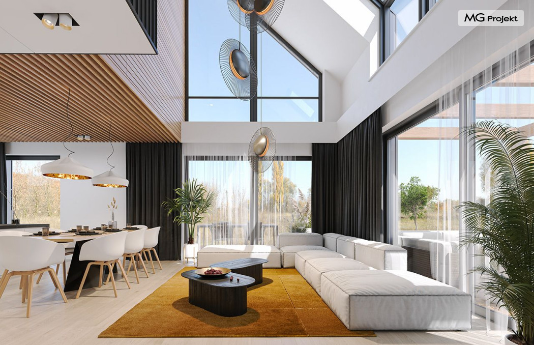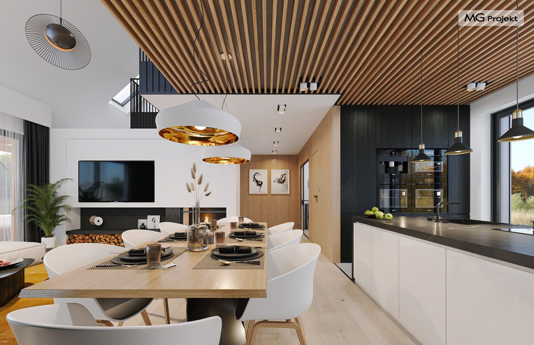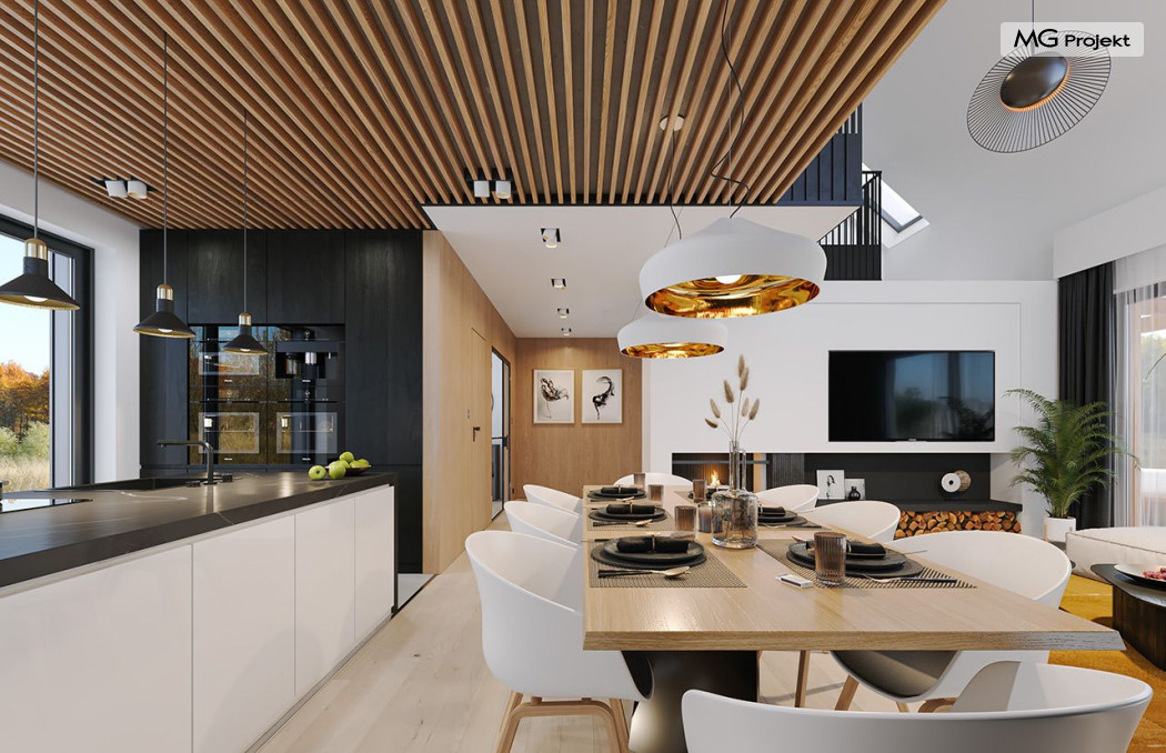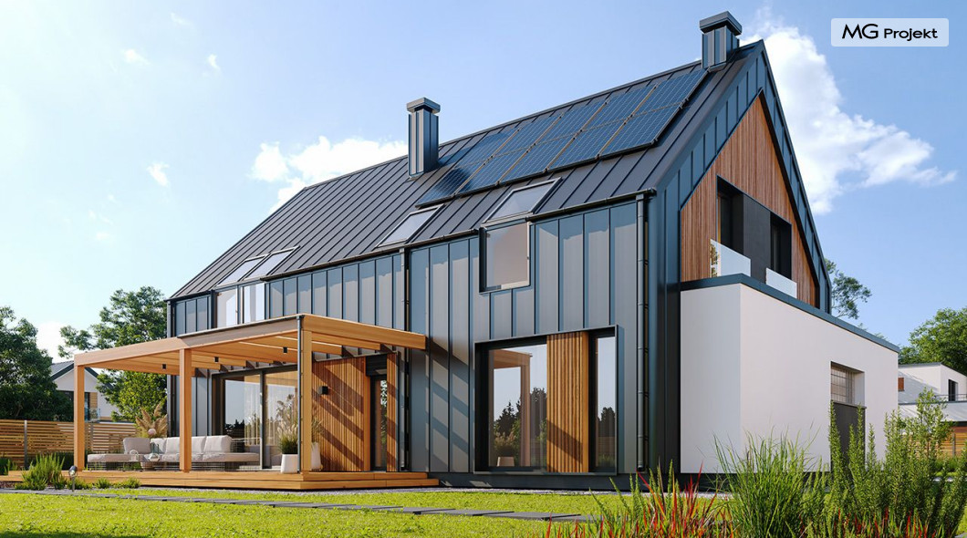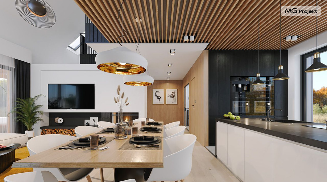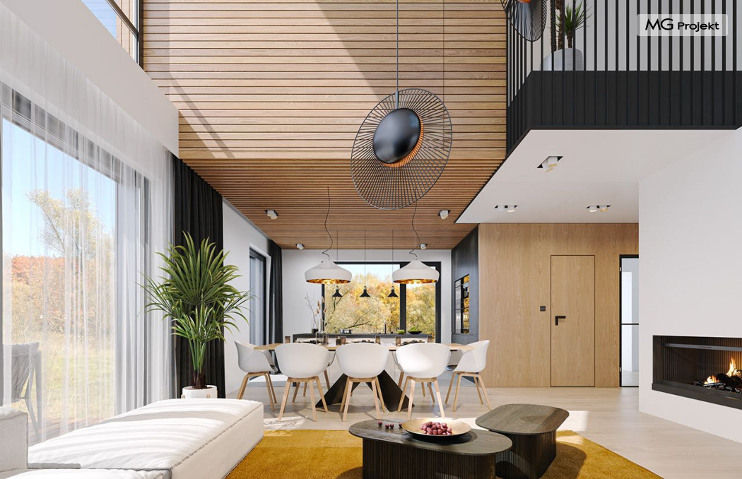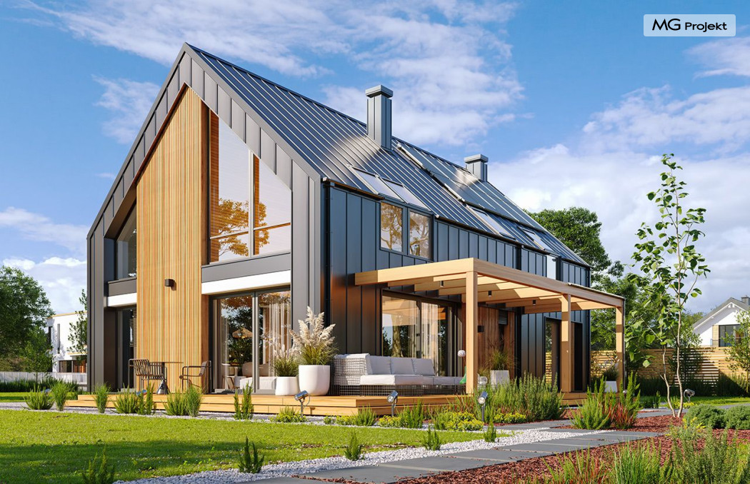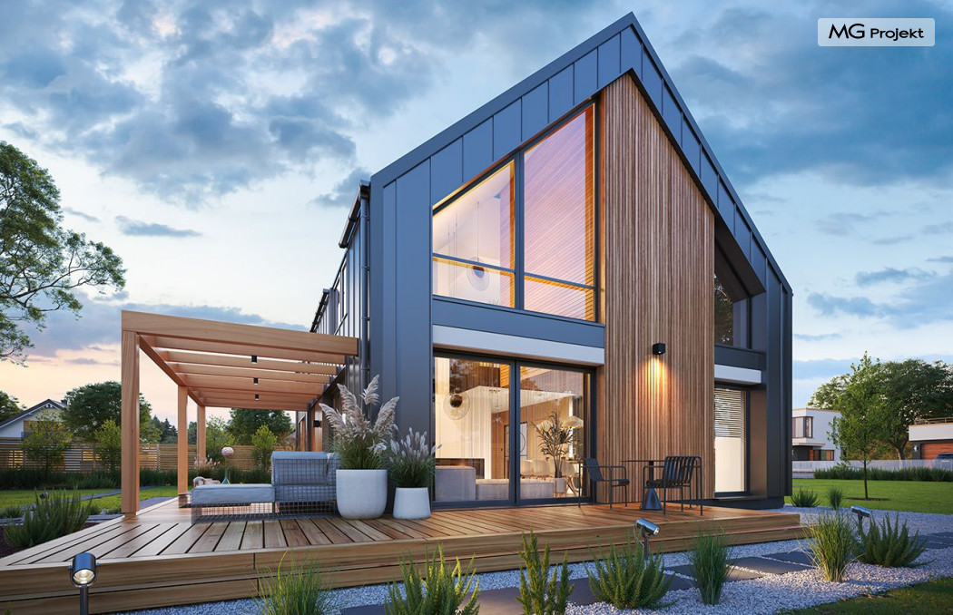 Projekt domu Makarena to projekt nowoczesnej stodoły z naszej serii taneczno-imprezowych domów (Mambo, Bolero, Lambada, Party, Biba, Tango, Salsa, Rumba). To wyjątkowy projekt w naszej ofercie - tylko dla odważnych Inwestorów, patrzących z wizją i wyobraźnią na swoją przeszłą inwestycję. Makarena to połączenie bezkompromisowej architektury, zamkniętej w nowoczesnej formie domu- stodoły, oraz funkcjonalnego parterowego domku jednorodzinnego z poddaszem użytkowym. Rzut domu na planie prostokąta, z wbudowanym parterowym garażem, wieńczy dwuspadowy symetryczny dach z wysoką ścianą kolankową poddasza. Całość bryły budynku wykończona jest blachą na rąbek stojący - zarówno połacie dachu jak i ściany elewacji bocznych. Jednolitą materiałowo i kolorystycznie bryłę przecinają duże przeszklenia okienne, fragmenty elewacji drewnianej, parterowy garaż od frontu i pergola od strony elewacji ogrodowej. Antracytowy kolor blachy kontrastuje z elementami drewnianymi, z fragmentami elewacji tynkowanej i z szybami otwierającymi wnętrze lub odbijającymi otaczającą dom zieleń. Sylwetka i bryła budynku jest bardzo nowoczesna, bezkompromisowa w swym wyrazie, nietuzinkowa. Dom z pewnością ma oryginalny wyraz i będzie przyciągał spojrzenia. Od strony elewacji frontowej pierwsze skrzypce gra reprezentacyjne wejście do domu - z drzwiami wejściowymi z naświetlami bocznymi, oraz duże okno kuchenne otwierające wnętrze kuchni z wyspą. Strona ogrodowa to piękne przeszklenia salonu, w tym wysokie dwukondygnacyjne okno antresoli, oraz drewniane elementy - taras, okładzina szczytu i pergola, przełamujące monotonię ciemnej blachy. Wnętrze domu zaskakuje poczuciem dużej przestrzeni części dziennej - niełatwym do uzyskania w 150-metrowym domu. Wrażenie przestronności potęgują duże przeszklenia, oraz pustka nad salonem i schodami, łącząca pokój dzienny z antresolą na poddaszu. Wnętrze jest bardzo nowoczesne. Dominują tu trzy przenikające się kolory i materiały : biel ścian, drewno i kontrastujące wstawki w szarości i czerni. Na parterze prócz części dziennej znajdziemy dodatkowy pokój z łazienką, oraz garaż z pomieszczeniem technicznym. Na poddaszu przewidziano trzy pokoje sypialne z dwiema łazienkami, w tym apartament master z własną łazienką i garderobą. Wnętrze można dowolnie kształtować, ale bez problemu zmieści się tutaj 4-6cioosobowa rodzina. Budynek zaprojektowano jako energooszczędny, z dobrymi izolacjami i nowoczesnymi instalacjami. Dom, mimo ekstrawaganckiego wyglądu, ma prostą konstrukcję i zwartą bryłę, dzięki czemu będzie łatwy w budowie i niedrogi w późniejszej eksploatacji. Makarena to propozycja dla Inwestorów pragnących zbudować oryginalny, wyjątkowy dom o ultranowoczesnym bezkompromisowym wyglądzie. Dom, który jest nietuzinkową i wyjątkową scenografią codziennego życia, który sam w sobie podnosi jego jakość, ciesząc zmysły właścicieli i przyciągając zaciekawione spojrzenia sąsiadów i przechodniów. Makarena do dom dla Inwestorów chcących wyrazić siebie i zaznaczyć swój wyraźny i oryginalny ślad. Zapraszamy do zapoznania się z całą serią "roztańczonych domów": https://www.mgprojekt.com.pl/makarena, https://www.mgprojekt.com.pl/bolero, https://www.mgprojekt.com.pl/lambada, https://www.mgprojekt.com.pl/party, https://www.mgprojekt.com.pl/party-2, https://www.mgprojekt.com.pl/biba, https://www.mgprojekt.com.pl/tango, https://www.mgprojekt.com.pl/salsa, https://www.mgprojekt.com.pl/rumba.