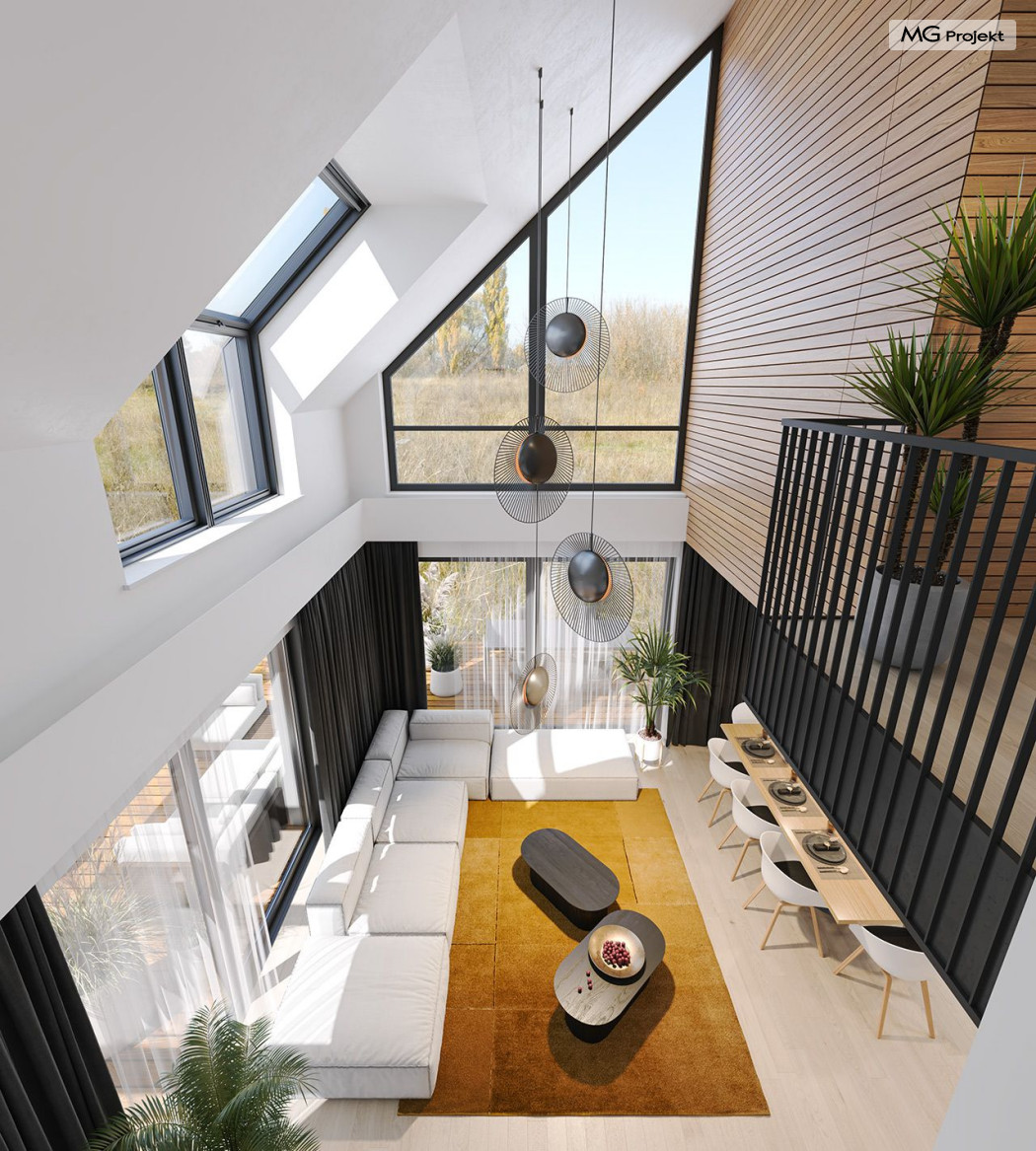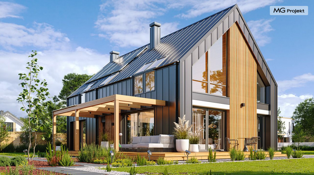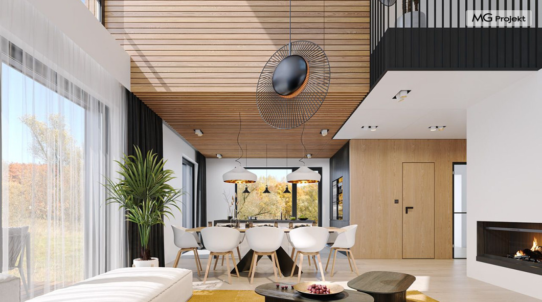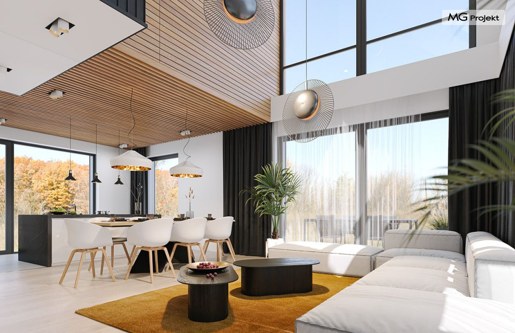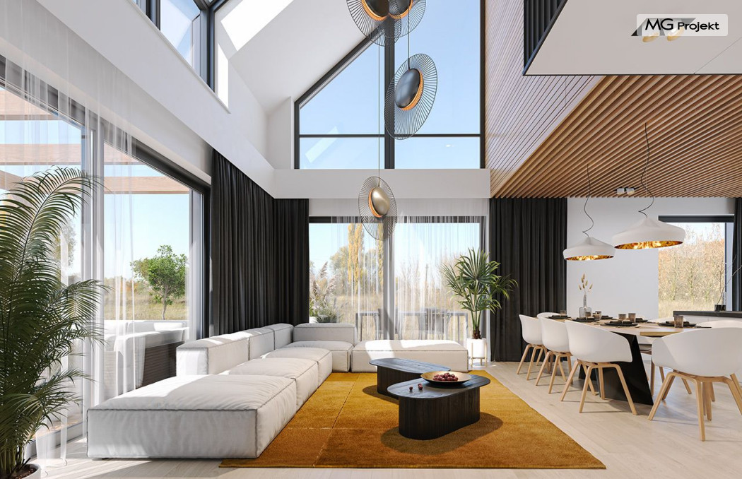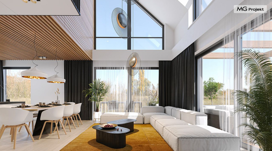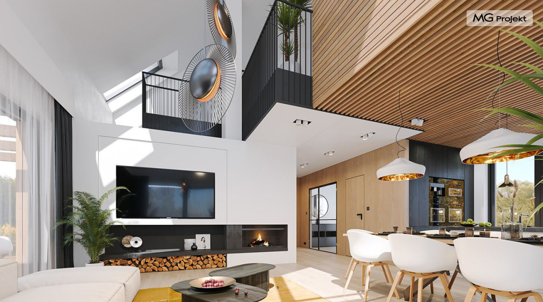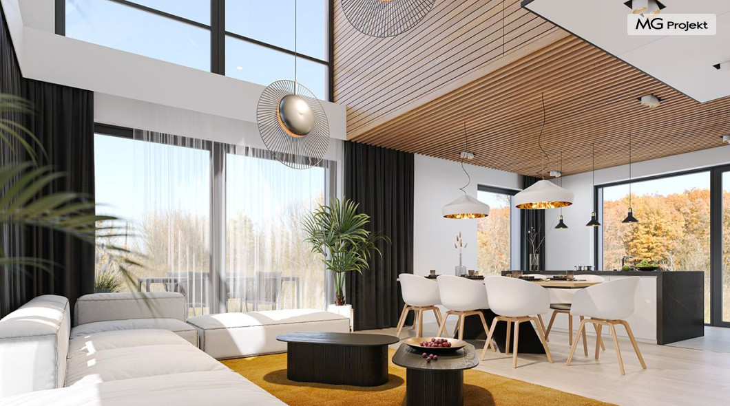Projekt domu Makarena to projekt nowoczesnej stodoły z naszej serii taneczno-imprezowych domów (Mambo, Bolero, Lambada, Party, Biba, Tango, Salsa, Rumba). To wyjątkowy projekt w naszej ofercie - tylko dla odważnych Inwestorów, patrzących z wizją i wyobraźnią na swoją przeszłą inwestycję. Makarena to połączenie bezkompromisowej architektury, zamkniętej w nowoczesnej formie domu- stodoły, oraz funkcjonalnego parterowego domku jednorodzinnego z poddaszem użytkowym. Rzut domu na planie prostokąta, z wbudowanym parterowym garażem, wieńczy dwuspadowy symetryczny dach z wysoką ścianą kolankową poddasza. Całość bryły budynku wykończona jest blachą na rąbek stojący - zarówno połacie dachu jak i ściany elewacji bocznych. Jednolitą materiałowo i kolorystycznie bryłę przecinają duże przeszklenia okienne, fragmenty elewacji drewnianej, parterowy garaż od frontu i pergola od strony elewacji ogrodowej. Antracytowy kolor blachy kontrastuje z elementami drewnianymi, z fragmentami elewacji tynkowanej i z szybami otwierającymi wnętrze lub odbijającymi otaczającą dom zieleń. Sylwetka i bryła budynku jest bardzo nowoczesna, bezkompromisowa w swym wyrazie, nietuzinkowa. Dom z pewnością ma oryginalny wyraz i będzie przyciągał spojrzenia. Od strony elewacji frontowej pierwsze skrzypce gra reprezentacyjne wejście do domu - z drzwiami wejściowymi z naświetlami bocznymi, oraz duże okno kuchenne otwierające wnętrze kuchni z wyspą. Strona ogrodowa to piękne przeszklenia salonu, w tym wysokie dwukondygnacyjne okno antresoli, oraz drewniane elementy - taras, okładzina szczytu i pergola, przełamujące monotonię ciemnej blachy. Wnętrze domu zaskakuje poczuciem dużej przestrzeni części dziennej - niełatwym do uzyskania w 150-metrowym domu. Wrażenie przestronności potęgują duże przeszklenia, oraz pustka nad salonem i schodami, łącząca pokój dzienny z antresolą na poddaszu. Wnętrze jest bardzo nowoczesne. Dominują tu trzy przenikające się kolory i materiały : biel ścian, drewno i kontrastujące wstawki w szarości i czerni. Na parterze prócz części dziennej znajdziemy dodatkowy pokój z łazienką, oraz garaż z pomieszczeniem technicznym. Na poddaszu przewidziano trzy pokoje sypialne z dwiema łazienkami, w tym apartament master z własną łazienką i garderobą. Wnętrze można dowolnie kształtować, ale bez problemu zmieści się tutaj 4-6cioosobowa rodzina. Budynek zaprojektowano jako energooszczędny, z dobrymi izolacjami i nowoczesnymi instalacjami. Dom, mimo ekstrawaganckiego wyglądu, ma prostą konstrukcję i zwartą bryłę, dzięki czemu będzie łatwy w budowie i niedrogi w późniejszej eksploatacji. Makarena to propozycja dla Inwestorów pragnących zbudować oryginalny, wyjątkowy dom o ultranowoczesnym bezkompromisowym wyglądzie. Dom, który jest nietuzinkową i wyjątkową scenografią codziennego życia, który sam w sobie podnosi jego jakość, ciesząc zmysły właścicieli i przyciągając zaciekawione spojrzenia sąsiadów i przechodniów. Makarena do dom dla Inwestorów chcących wyrazić siebie i zaznaczyć swój wyraźny i oryginalny ślad. Zapraszamy do zapoznania się z całą serią "roztańczonych domów": https://www.mgprojekt.com.pl/makarena, https://www.mgprojekt.com.pl/bolero, https://www.mgprojekt.com.pl/lambada, https://www.mgprojekt.com.pl/party, https://www.mgprojekt.com.pl/party-2, https://www.mgprojekt.com.pl/biba, https://www.mgprojekt.com.pl/tango, https://www.mgprojekt.com.pl/salsa, https://www.mgprojekt.com.pl/rumba.