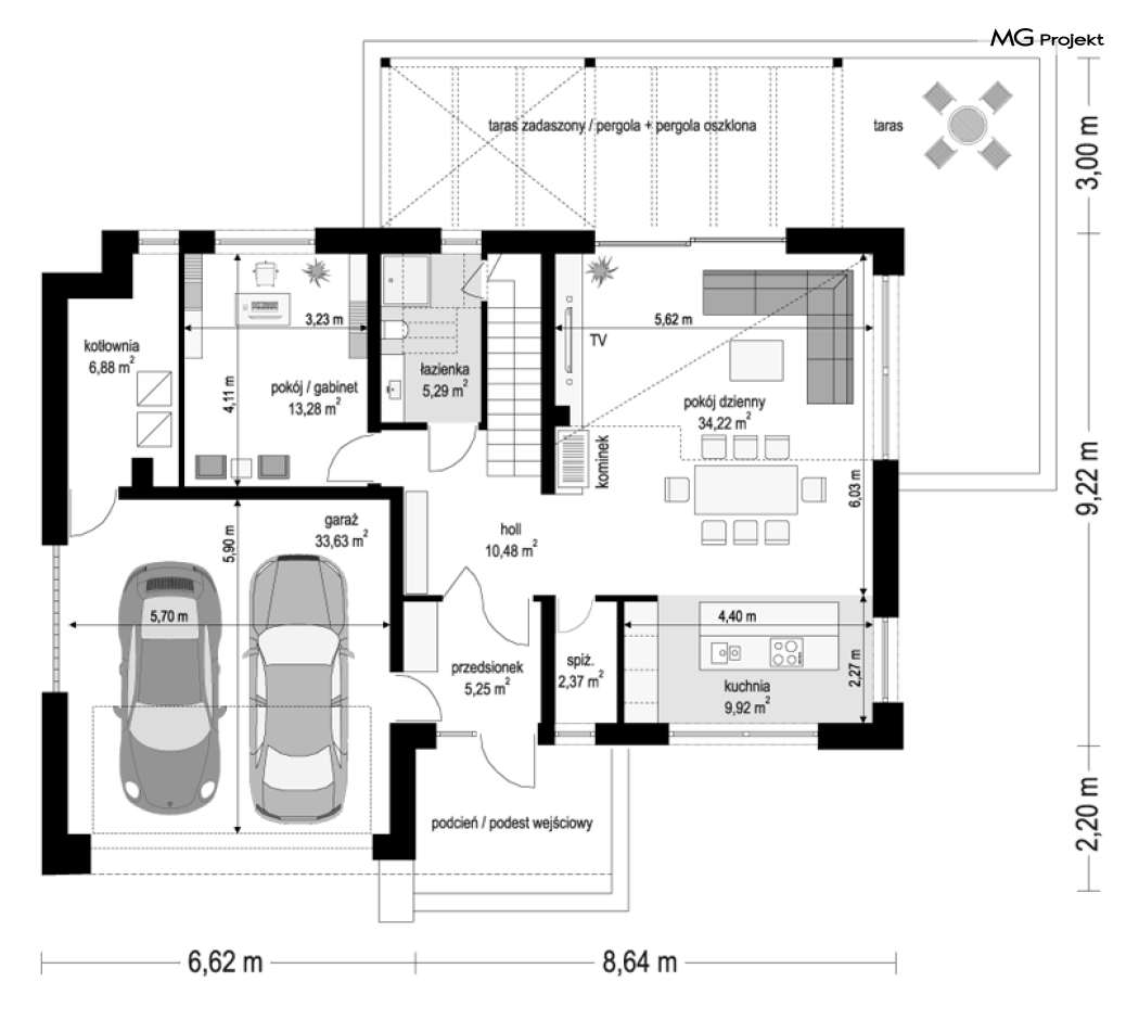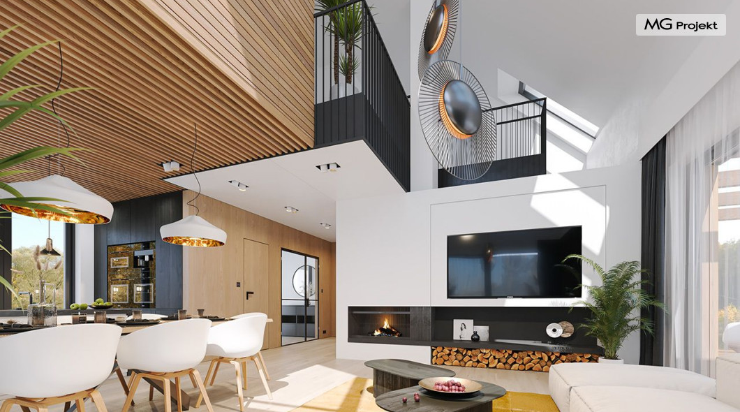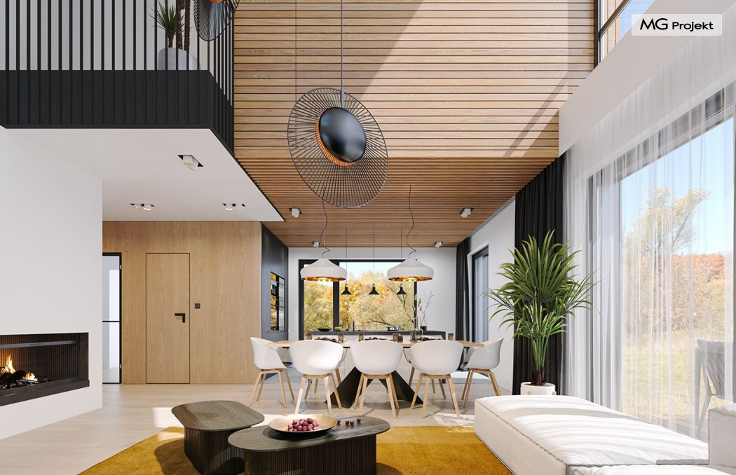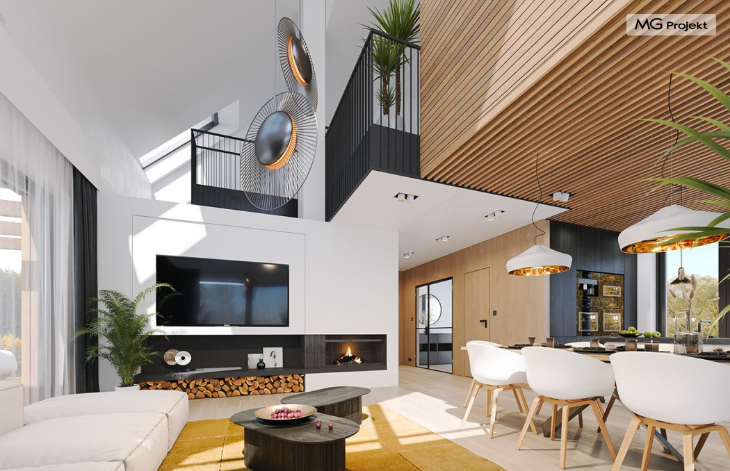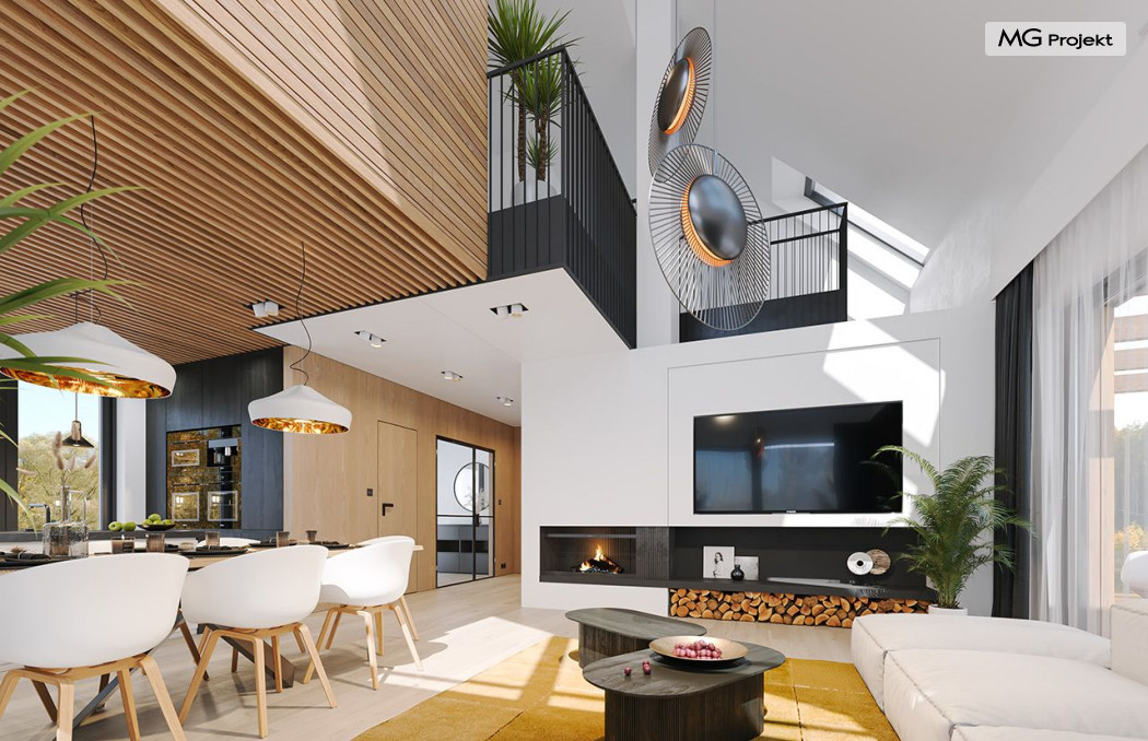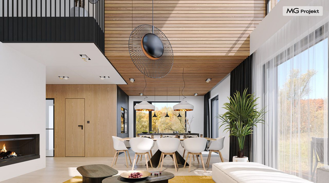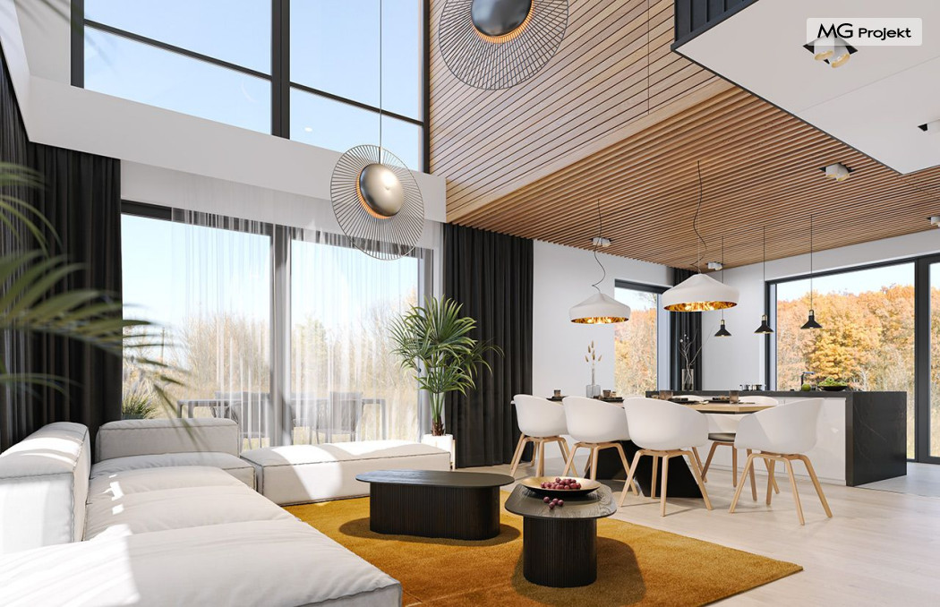 Projekt domu Makarena to projekt nowoczesnej stodoły z naszej serii taneczno-imprezowych domów (Mambo, Bolero, Lambada, Party, Biba, Tango, Salsa, Rumba). To wyjątkowy projekt w naszej ofercie - tylko dla odważnych Inwestorów, patrzących z wizją i wyobraźnią na swoją przeszłą inwestycję. Makarena to połączenie bezkompromisowej architektury, zamkniętej w nowoczesnej formie domu- stodoły, oraz funkcjonalnego parterowego domku jednorodzinnego z poddaszem użytkowym. Rzut domu na planie prostokąta, z wbudowanym parterowym garażem, wieńczy dwuspadowy symetryczny dach z wysoką ścianą kolankową poddasza. Całość bryły budynku wykończona jest blachą na rąbek stojący - zarówno połacie dachu jak i ściany elewacji bocznych. Jednolitą materiałowo i kolorystycznie bryłę przecinają duże przeszklenia okienne, fragmenty elewacji drewnianej, parterowy garaż od frontu i pergola od strony elewacji ogrodowej. Antracytowy kolor blachy kontrastuje z elementami drewnianymi, z fragmentami elewacji tynkowanej i z szybami otwierającymi wnętrze lub odbijającymi otaczającą dom zieleń. Sylwetka i bryła budynku jest bardzo nowoczesna, bezkompromisowa w swym wyrazie, nietuzinkowa. Dom z pewnością ma oryginalny wyraz i będzie przyciągał spojrzenia. Od strony elewacji frontowej pierwsze skrzypce gra reprezentacyjne wejście do domu - z drzwiami wejściowymi z naświetlami bocznymi, oraz duże okno kuchenne otwierające wnętrze kuchni z wyspą. Strona ogrodowa to piękne przeszklenia salonu, w tym wysokie dwukondygnacyjne okno antresoli, oraz drewniane elementy - taras, okładzina szczytu i pergola, przełamujące monotonię ciemnej blachy. Wnętrze domu zaskakuje poczuciem dużej przestrzeni części dziennej - niełatwym do uzyskania w 150-metrowym domu. Wrażenie przestronności potęgują duże przeszklenia, oraz pustka nad salonem i schodami, łącząca pokój dzienny z antresolą na poddaszu. Wnętrze jest bardzo nowoczesne. Dominują tu trzy przenikające się kolory i materiały : biel ścian, drewno i kontrastujące wstawki w szarości i czerni. Na parterze prócz części dziennej znajdziemy dodatkowy pokój z łazienką, oraz garaż z pomieszczeniem technicznym. Na poddaszu przewidziano trzy pokoje sypialne z dwiema łazienkami, w tym apartament master z własną łazienką i garderobą. Wnętrze można dowolnie kształtować, ale bez problemu zmieści się tutaj 4-6cioosobowa rodzina. Budynek zaprojektowano jako energooszczędny, z dobrymi izolacjami i nowoczesnymi instalacjami. Dom, mimo ekstrawaganckiego wyglądu, ma prostą konstrukcję i zwartą bryłę, dzięki czemu będzie łatwy w budowie i niedrogi w późniejszej eksploatacji. Makarena to propozycja dla Inwestorów pragnących zbudować oryginalny, wyjątkowy dom o ultranowoczesnym bezkompromisowym wyglądzie. Dom, który jest nietuzinkową i wyjątkową scenografią codziennego życia, który sam w sobie podnosi jego jakość, ciesząc zmysły właścicieli i przyciągając zaciekawione spojrzenia sąsiadów i przechodniów. Makarena do dom dla Inwestorów chcących wyrazić siebie i zaznaczyć swój wyraźny i oryginalny ślad. Zapraszamy do zapoznania się z całą serią "roztańczonych domów": https://www.mgprojekt.com.pl/makarena, https://www.mgprojekt.com.pl/bolero, https://www.mgprojekt.com.pl/lambada, https://www.mgprojekt.com.pl/party, https://www.mgprojekt.com.pl/party-2, https://www.mgprojekt.com.pl/biba, https://www.mgprojekt.com.pl/tango, https://www.mgprojekt.com.pl/salsa, https://www.mgprojekt.com.pl/rumba.