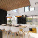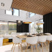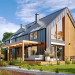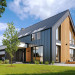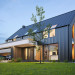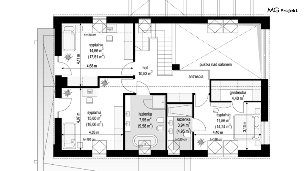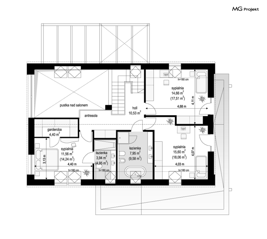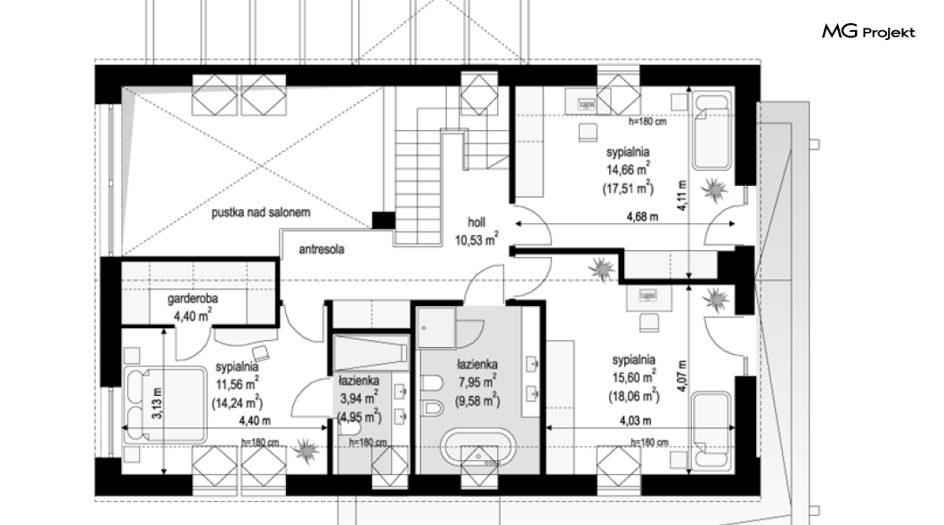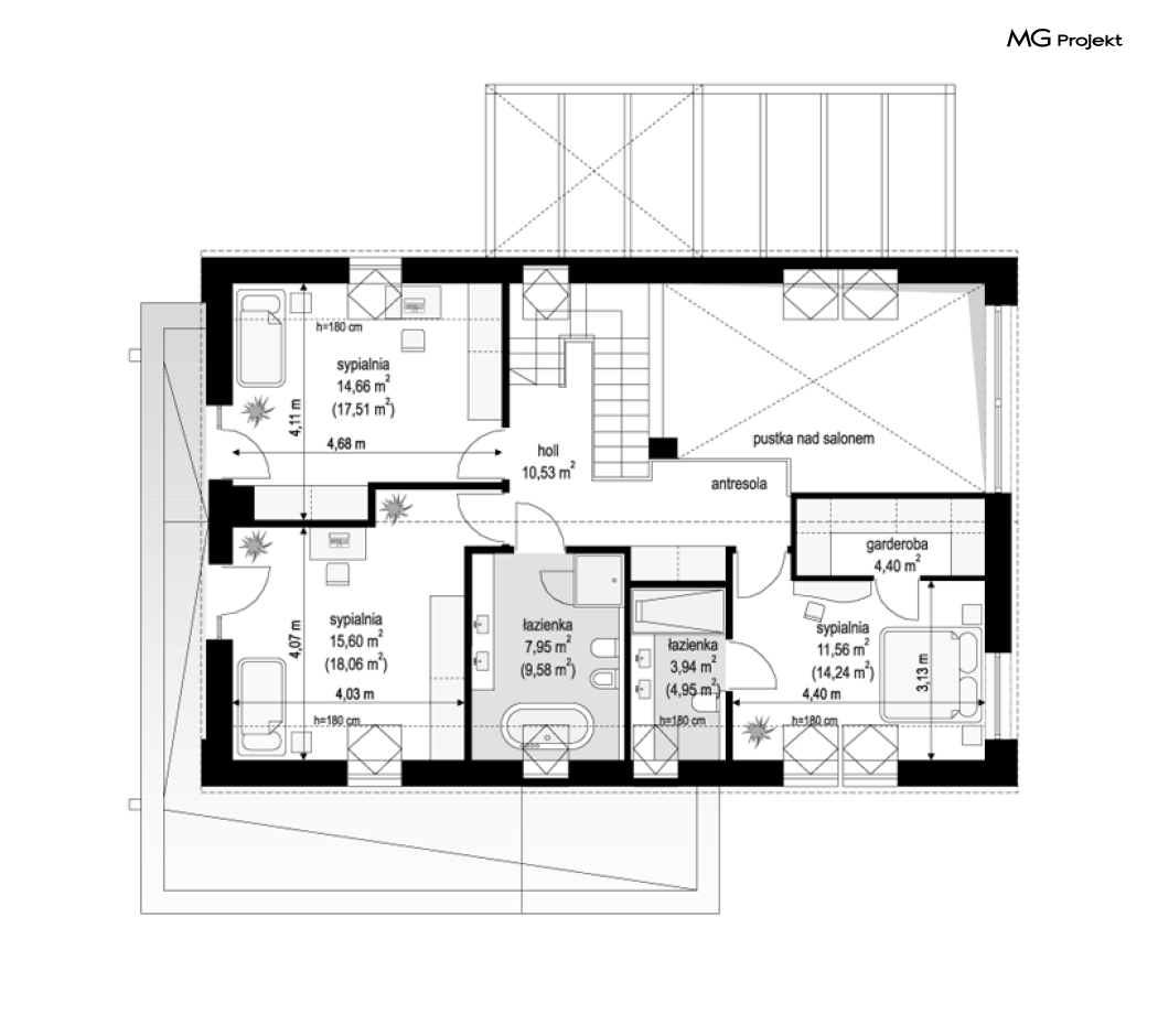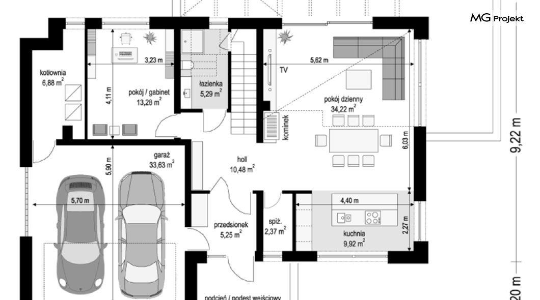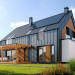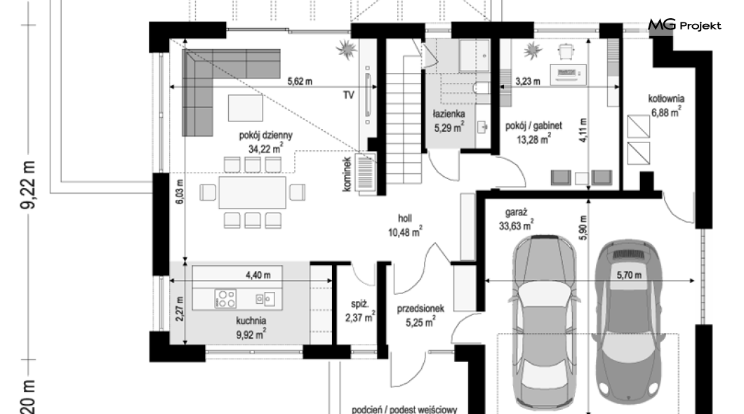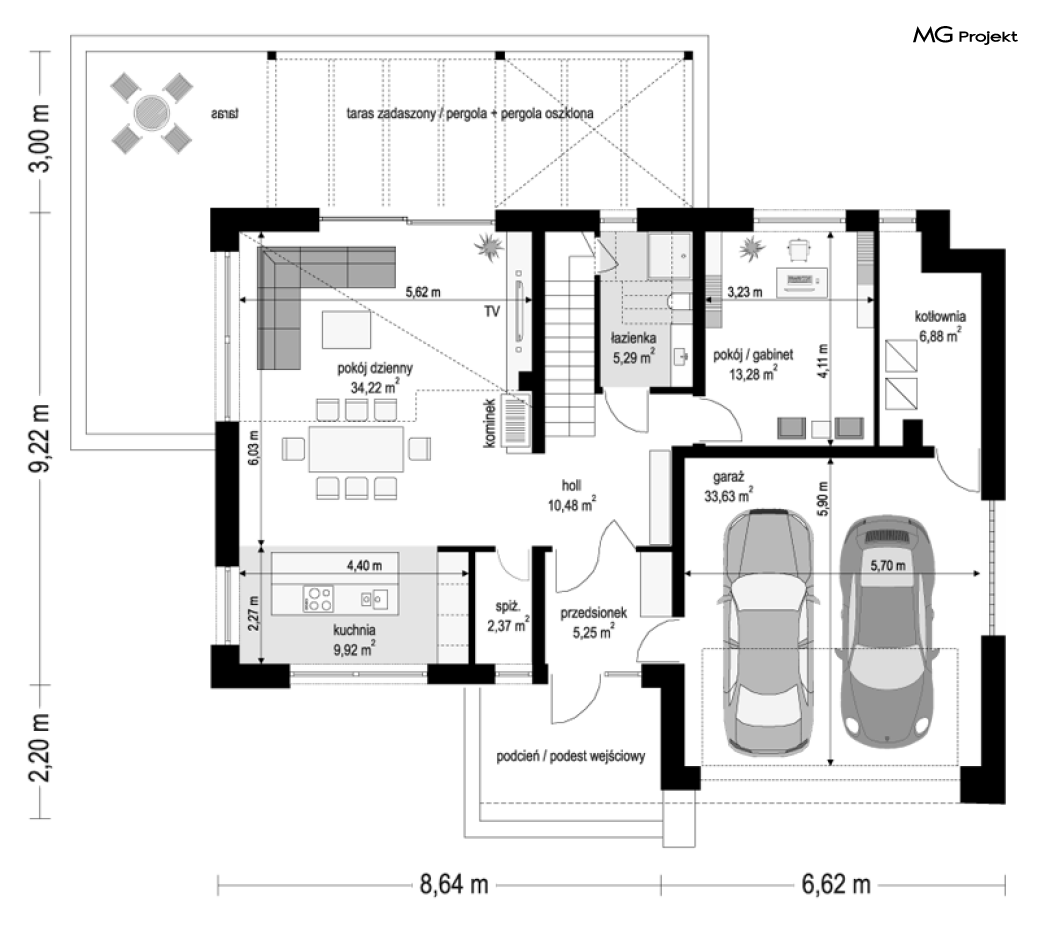Projekt domu Makarena to projekt nowoczesnej stodoły z naszej serii taneczno-imprezowych domów (Mambo, Bolero, Lambada, Party, Biba, Tango, Salsa, Rumba). To wyjątkowy projekt w naszej ofercie - tylko dla odważnych Inwestorów, patrzących z wizją i wyobraźnią na swoją przeszłą inwestycję. Makarena to połączenie bezkompromisowej architektury, zamkniętej w nowoczesnej formie domu- stodoły, oraz funkcjonalnego parterowego domku jednorodzinnego z poddaszem użytkowym. Rzut domu na planie prostokąta, z wbudowanym parterowym garażem, wieńczy dwuspadowy symetryczny dach z wysoką ścianą kolankową poddasza. Całość bryły budynku wykończona jest blachą na rąbek stojący - zarówno połacie dachu jak i ściany elewacji bocznych. Jednolitą materiałowo i kolorystycznie bryłę przecinają duże przeszklenia okienne, fragmenty elewacji drewnianej, parterowy garaż od frontu i pergola od strony elewacji ogrodowej. Antracytowy kolor blachy kontrastuje z elementami drewnianymi, z fragmentami elewacji tynkowanej i z szybami otwierającymi wnętrze lub odbijającymi otaczającą dom zieleń. Sylwetka i bryła budynku jest bardzo nowoczesna, bezkompromisowa w swym wyrazie, nietuzinkowa. Dom z pewnością ma oryginalny wyraz i będzie przyciągał spojrzenia. Od strony elewacji frontowej pierwsze skrzypce gra reprezentacyjne wejście do domu - z drzwiami wejściowymi z naświetlami bocznymi, oraz duże okno kuchenne otwierające wnętrze kuchni z wyspą. Strona ogrodowa to piękne przeszklenia salonu, w tym wysokie dwukondygnacyjne okno antresoli, oraz drewniane elementy - taras, okładzina szczytu i pergola, przełamujące monotonię ciemnej blachy. Wnętrze domu zaskakuje poczuciem dużej przestrzeni części dziennej - niełatwym do uzyskania w 150-metrowym domu. Wrażenie przestronności potęgują duże przeszklenia, oraz pustka nad salonem i schodami, łącząca pokój dzienny z antresolą na poddaszu. Wnętrze jest bardzo nowoczesne. Dominują tu trzy przenikające się kolory i materiały : biel ścian, drewno i kontrastujące wstawki w szarości i czerni. Na parterze prócz części dziennej znajdziemy dodatkowy pokój z łazienką, oraz garaż z pomieszczeniem technicznym. Na poddaszu przewidziano trzy pokoje sypialne z dwiema łazienkami, w tym apartament master z własną łazienką i garderobą. Wnętrze można dowolnie kształtować, ale bez problemu zmieści się tutaj 4-6cioosobowa rodzina. Budynek zaprojektowano jako energooszczędny, z dobrymi izolacjami i nowoczesnymi instalacjami. Dom, mimo ekstrawaganckiego wyglądu, ma prostą konstrukcję i zwartą bryłę, dzięki czemu będzie łatwy w budowie i niedrogi w późniejszej eksploatacji. Makarena to propozycja dla Inwestorów pragnących zbudować oryginalny, wyjątkowy dom o ultranowoczesnym bezkompromisowym wyglądzie. Dom, który jest nietuzinkową i wyjątkową scenografią codziennego życia, który sam w sobie podnosi jego jakość, ciesząc zmysły właścicieli i przyciągając zaciekawione spojrzenia sąsiadów i przechodniów. Makarena do dom dla Inwestorów chcących wyrazić siebie i zaznaczyć swój wyraźny i oryginalny ślad. Zapraszamy do zapoznania się z całą serią "roztańczonych domów": https://www.mgprojekt.com.pl/makarena, https://www.mgprojekt.com.pl/bolero, https://www.mgprojekt.com.pl/lambada, https://www.mgprojekt.com.pl/party, https://www.mgprojekt.com.pl/party-2, https://www.mgprojekt.com.pl/biba, https://www.mgprojekt.com.pl/tango, https://www.mgprojekt.com.pl/salsa, https://www.mgprojekt.com.pl/rumba.