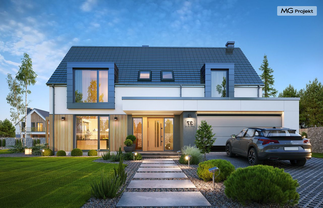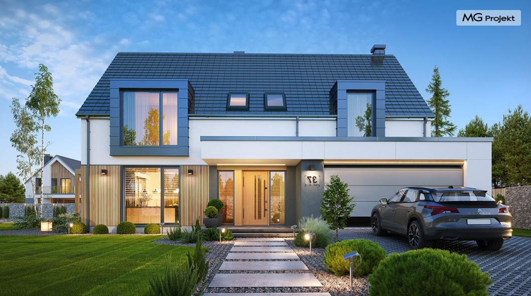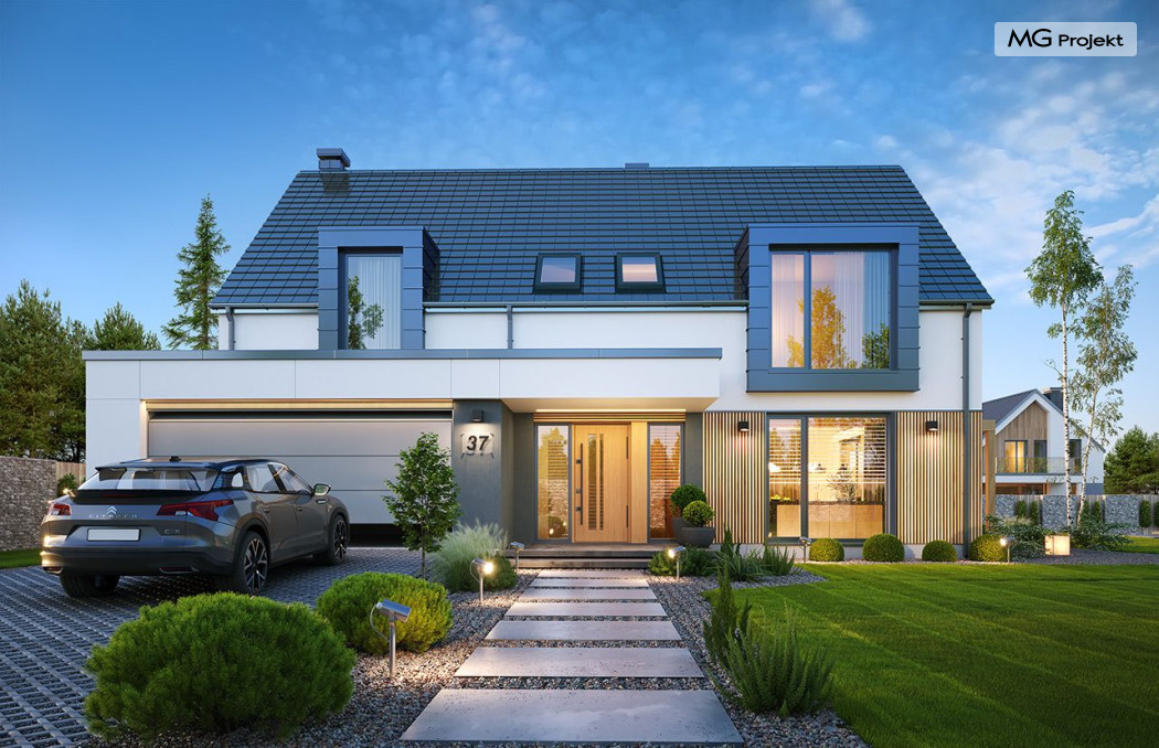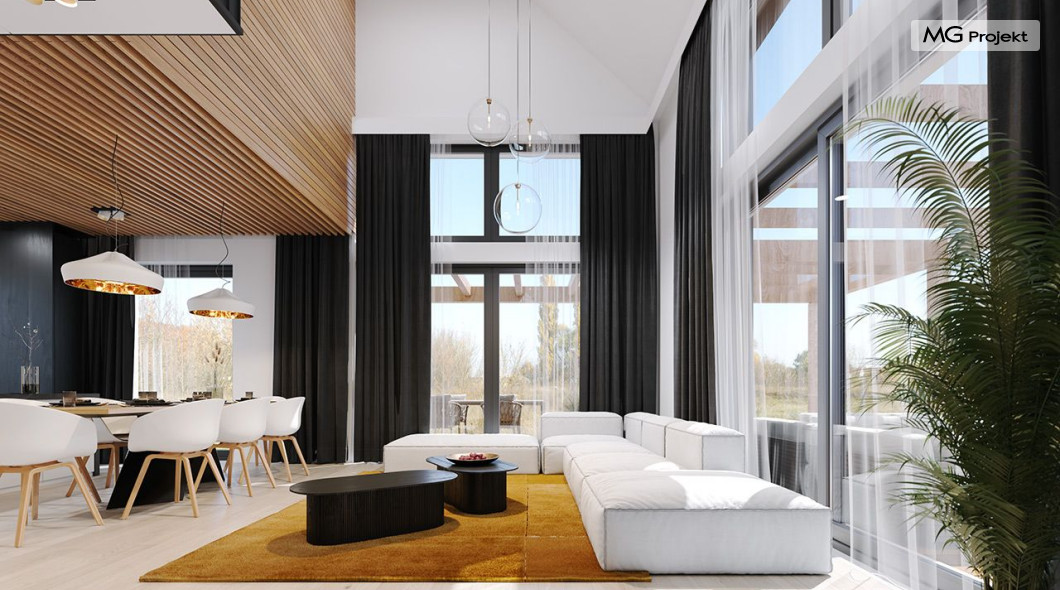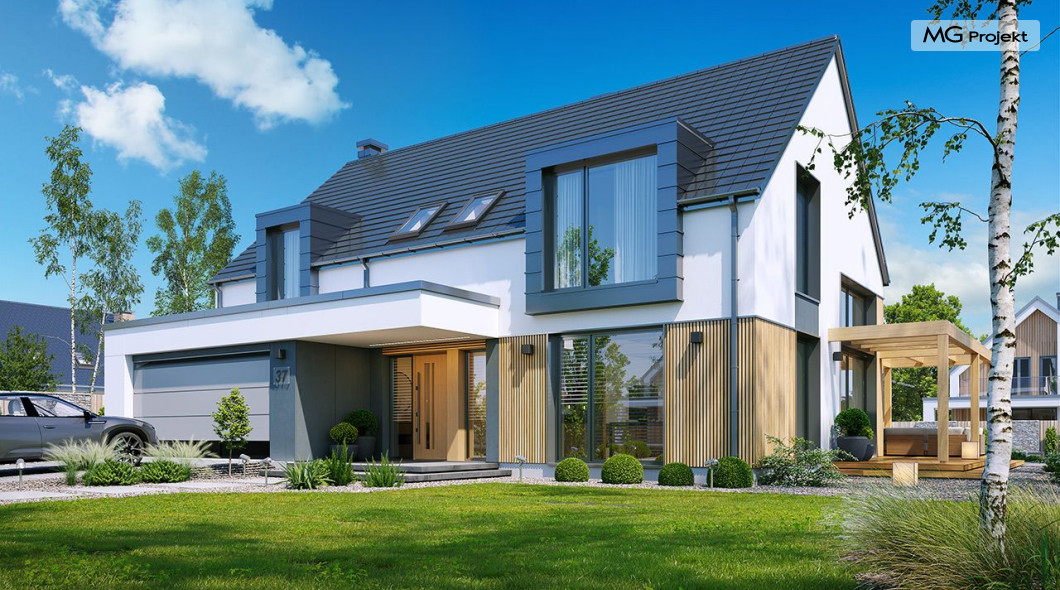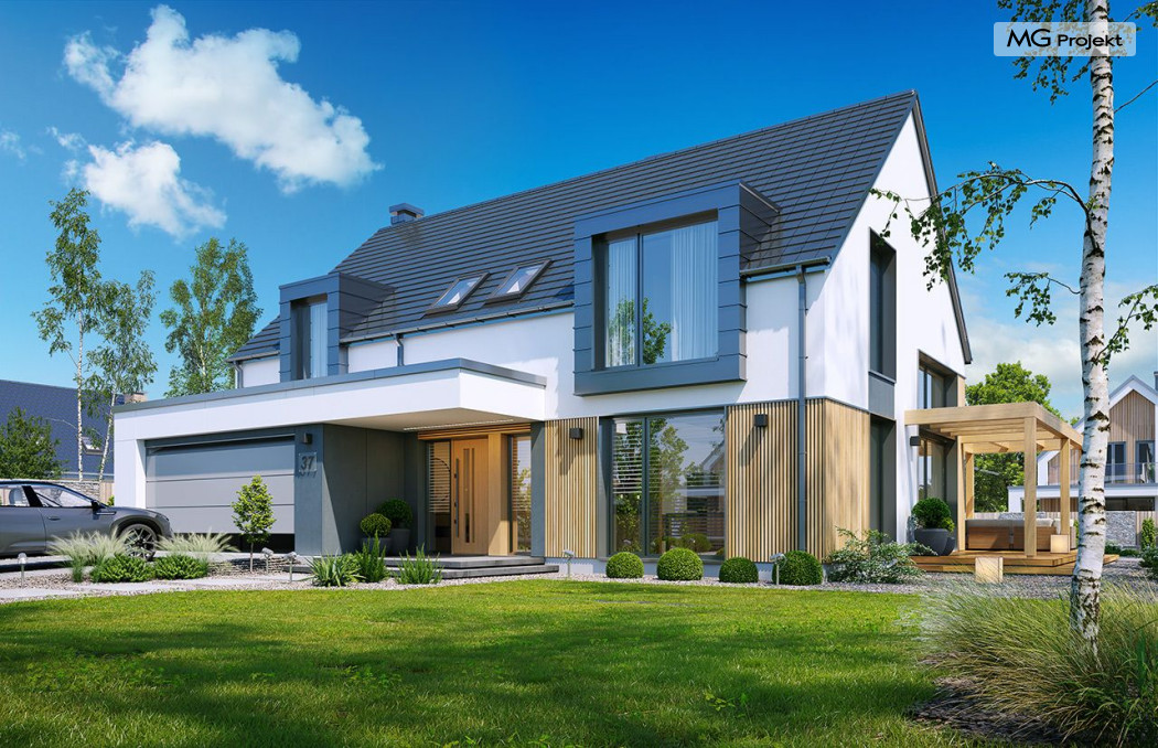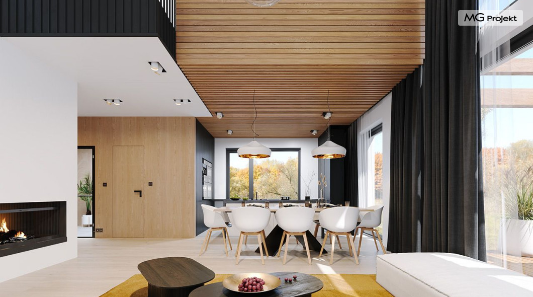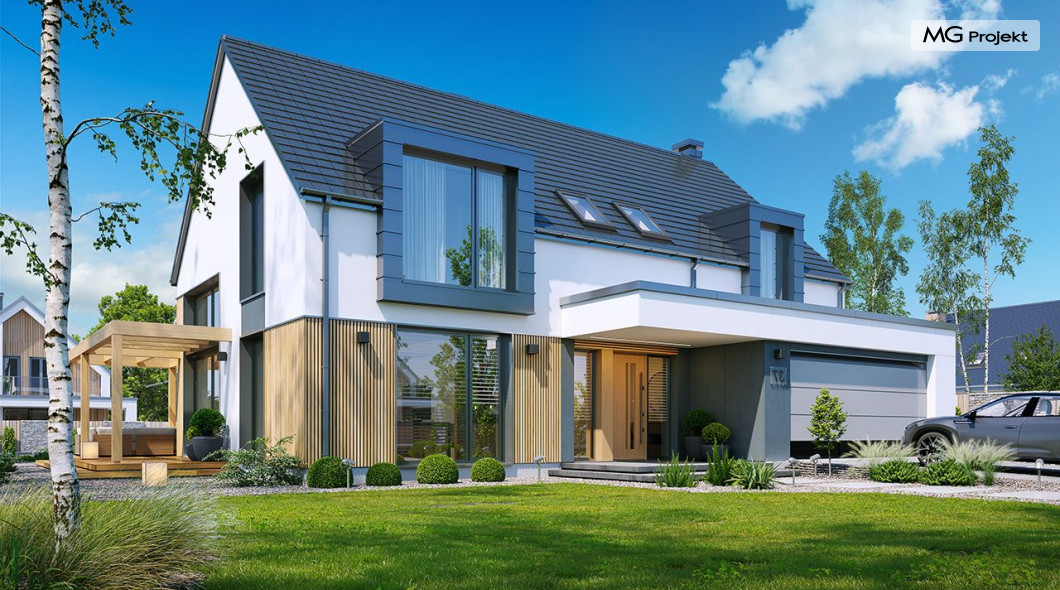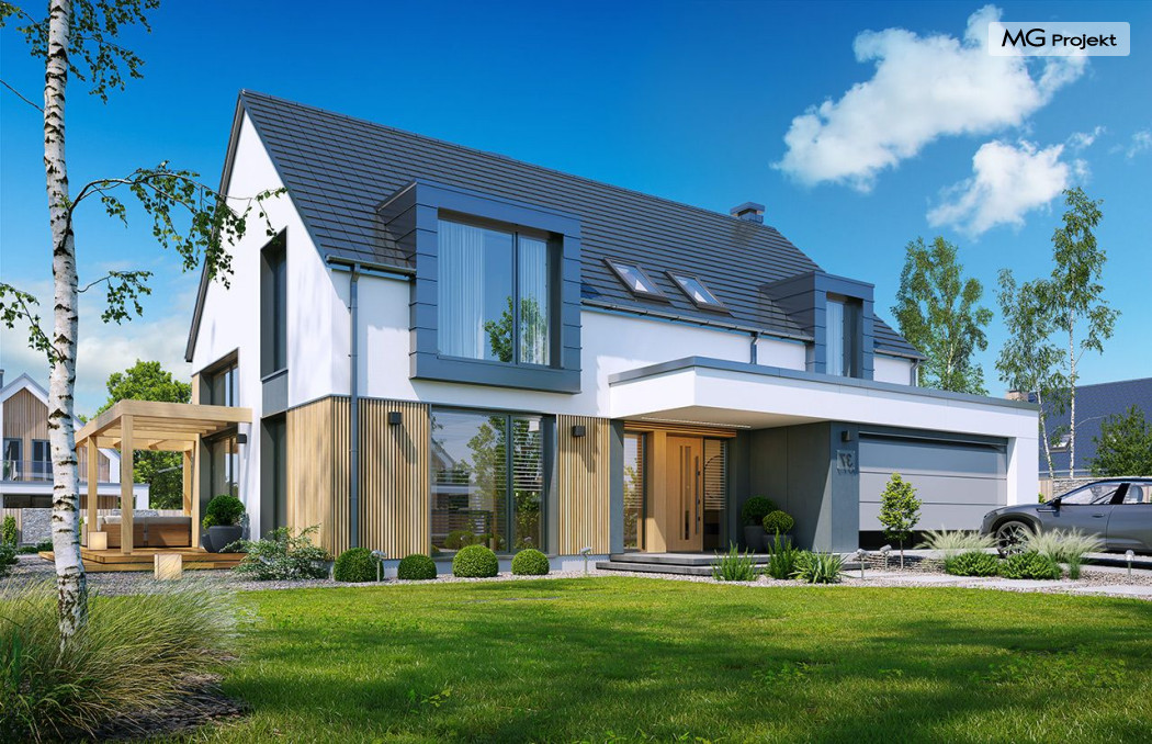 Projekt domu Mambo to kolejna propozycja z naszej serii „imprezowych” domów (Makarena, Bolero, Lambada, Party, Biba, Tango, Salsa, Rumba). Projekt domu Mambo to propozycja praktycznego, funkcjonalnego domu jednorodzinnego, parterowego z poddaszem użytkowym, o nowoczesnej architekturze, w popularnej stylistyce domu-stodoły. Bryła budynku i zastosowane detale architektoniczne tworzą nastrój komfortowej wygodnej podmiejskiej willi. Ciekawie zaprojektowane narożne przeszklenia salonu z pustką i antresolą, przełamują monotonię i oczywistość rozwiązań typowych dla domu parterowego z poddaszem i wprowadzają efekt jak w budynku piętrowym. Przeszklenia salonu na dwóch ścianach mają wysokość 1,5 kondygnacji i równej wysokości nadproża, nawiązując tym samym do dwukondygnacyjnych salonów domów piętrowych. Takie rozwiązanie dodaje domowi elegancji i oryginalności, zarówno jego fasadzie, jak i wnętrzu. Prostokątny rzut budynku przykryto dwuspadowym symetrycznym dachem z wysoką ścianą kolankową poddasza, a sylwetkę urozmaicają : od frontu - wbudowany w bryłę parterowy garaż, kubiczne lukarny poddasza i od tyłu - dobudowana pergola przykrywająca taras. Fasada domu została podzielona kolorystycznie i materiałowo na poziome pasy. Mamy tutaj : biel tynkowanych ścian, fragmenty kontrastowe tynku w odcieniach szarości, fragmenty elewacji drewnianej i dach pokryty antracytową płaską dachówką. Wnętrze budynku zaskakuje poczuciem przestrzeni, niełatwym do uzyskania w 150-metrowym domu. Największym zaskoczeniem jest tu pokój dzienny, którego narożne podwyższone okna sprawiają wrażenie jakbyśmy znaleźli się w wysokim salonie domu piętrowego. Pokój dzienny jest bardzo reprezentacyjny i oryginalny. Gubimy tutaj typowy motyw skośnego dachu we wnętrzu domu z poddaszem. Na parterze prócz salonu zaprojektowano dodatkowy pokój z łazienką, oraz garaż z pomieszczeniem kotłowni. Na poddaszu przewidziano trzy pokoje z dwiema łazienkami, w tym apartament master z własną łazienką i garderobą. Wnętrze można dowolnie kształtować, ale bez problemu zmieści się tutaj 4-6cioosobowa rodzina. Budynek zaprojektowano jako energooszczędny, z dobrymi izolacjami i nowoczesnymi instalacjami. Dom ma prostą konstrukcję i zwartą bryłę, dzięki czemu będzie łatwy w budowie i niedrogi w późniejszej eksploatacji. Mambo to propozycja dla Inwestorów pragnących zbudować nowoczesny, ciekawy i oryginalny architektonicznie dom o sensownej skali. Budynek o wysokiej jakości, ale niekoniecznie wielki. Dom dla Inwestorów chcących połączyć tradycyjną funkcjonalność z ciekawymi designerskimi detalami. Zapraszamy do zapoznania się z całą serią "roztańczonych domów": https://www.mgprojekt.com.pl/makarena, https://www.mgprojekt.com.pl/bolero, https://www.mgprojekt.com.pl/lambada, https://www.mgprojekt.com.pl/party, https://www.mgprojekt.com.pl/party-2, https://www.mgprojekt.com.pl/biba, https://www.mgprojekt.com.pl/tango, https://www.mgprojekt.com.pl/salsa, https://www.mgprojekt.com.pl/rumba.