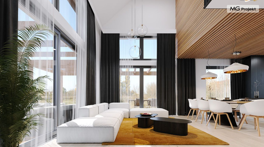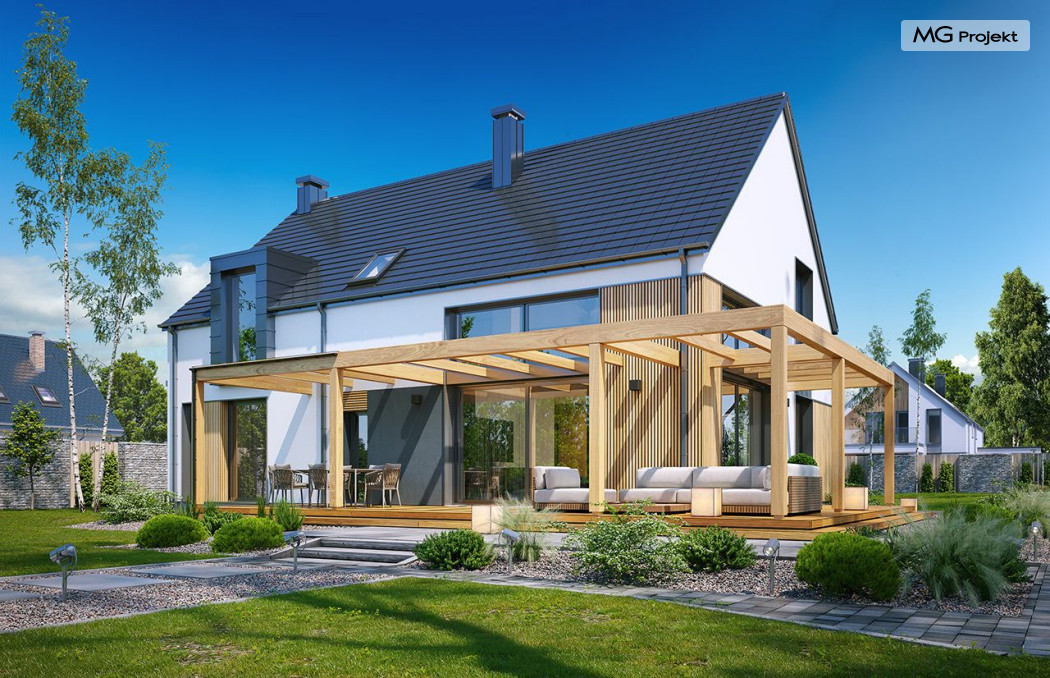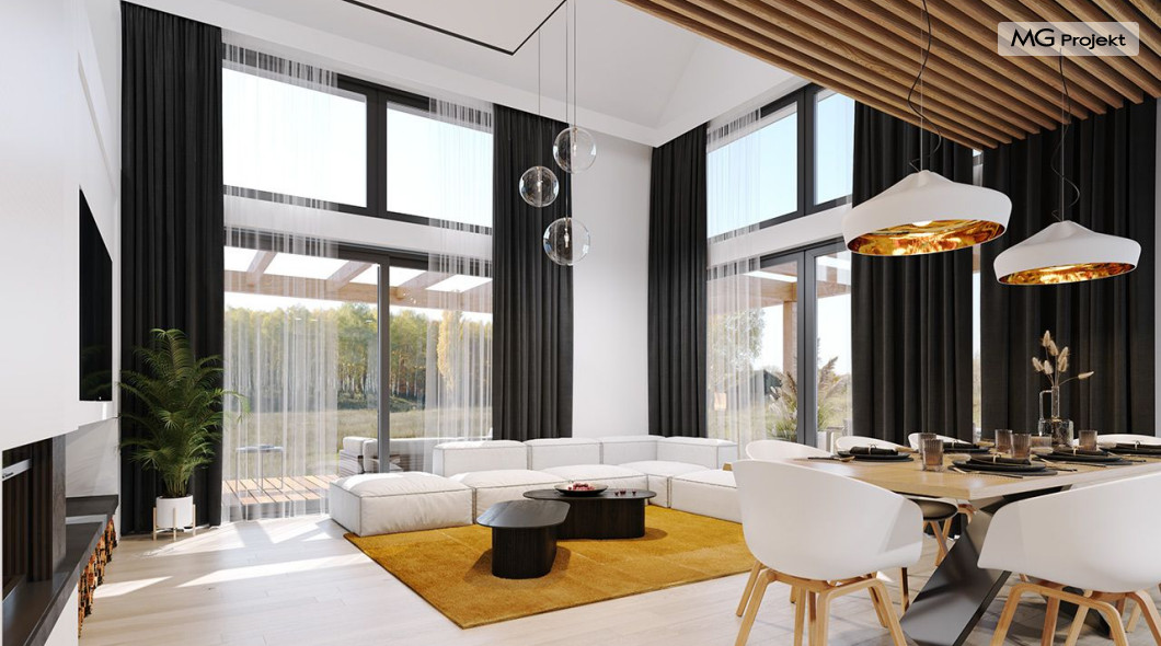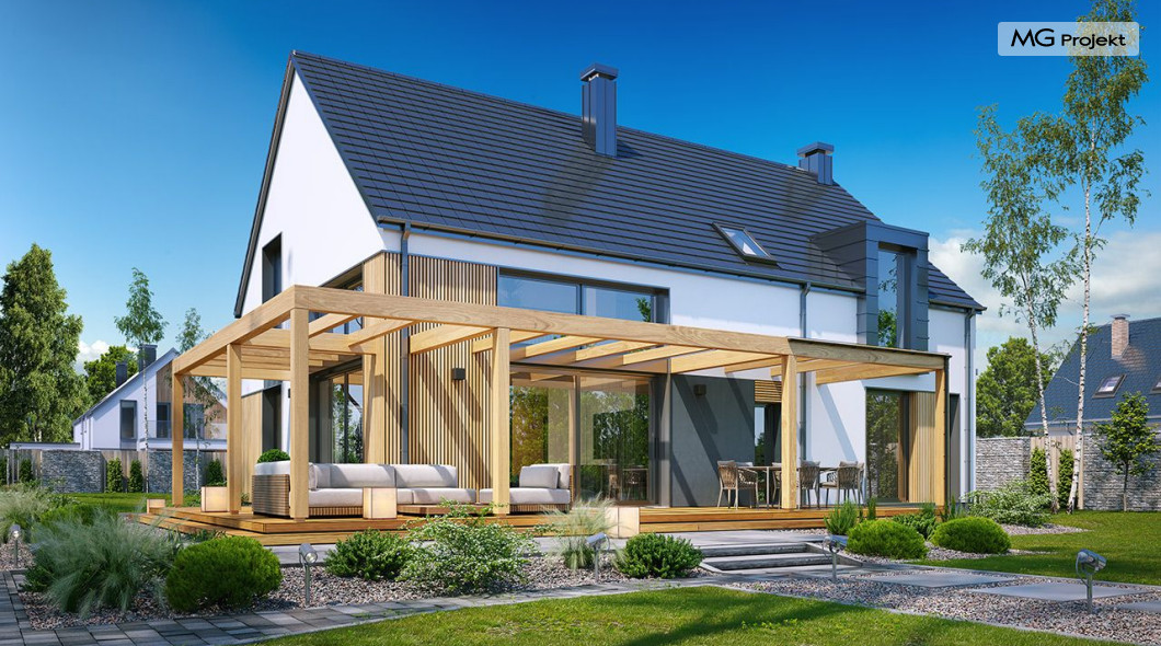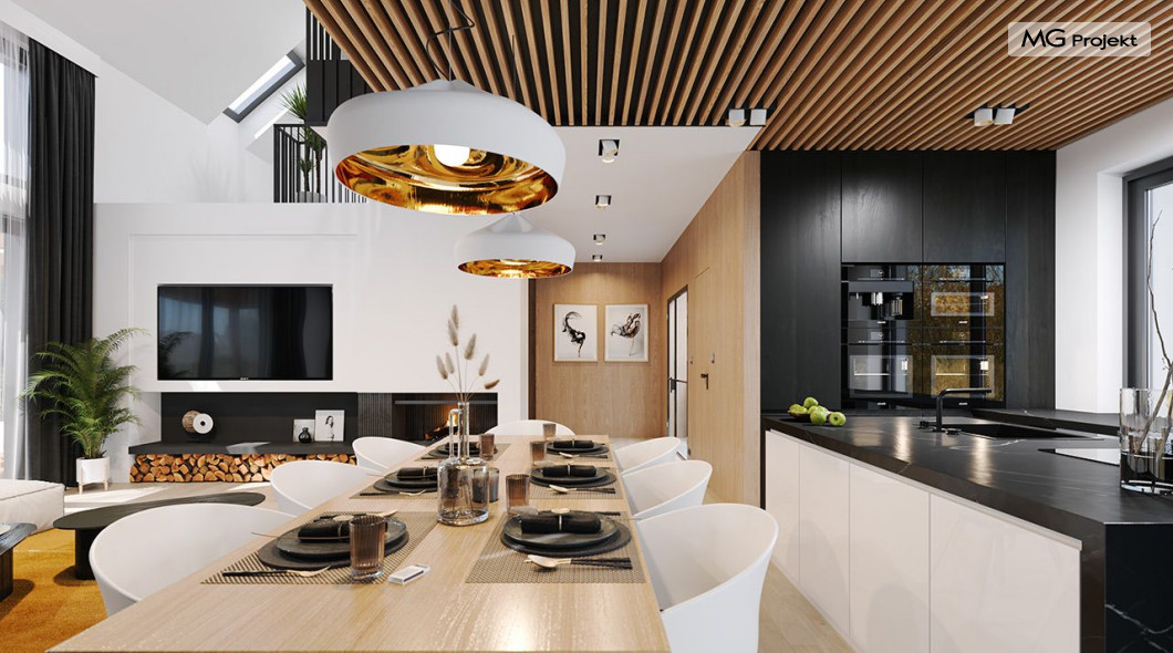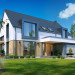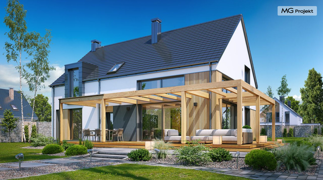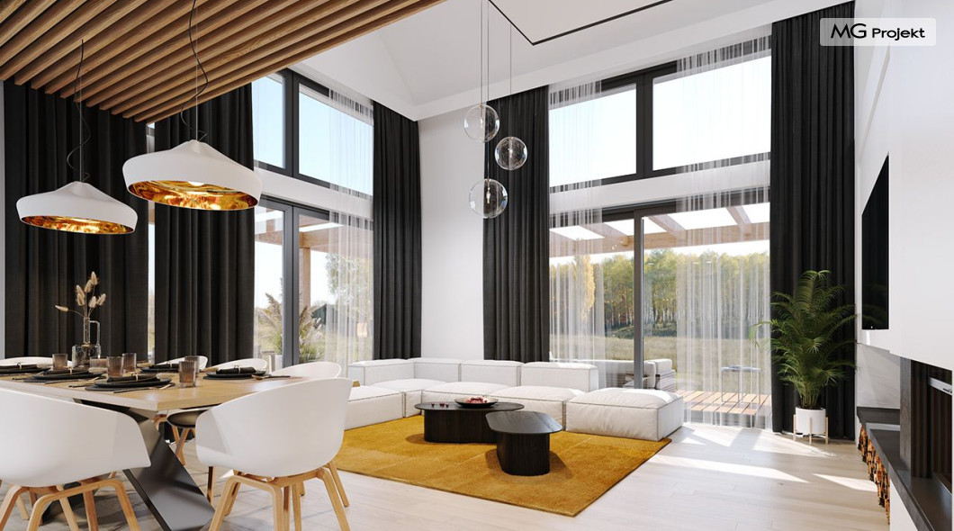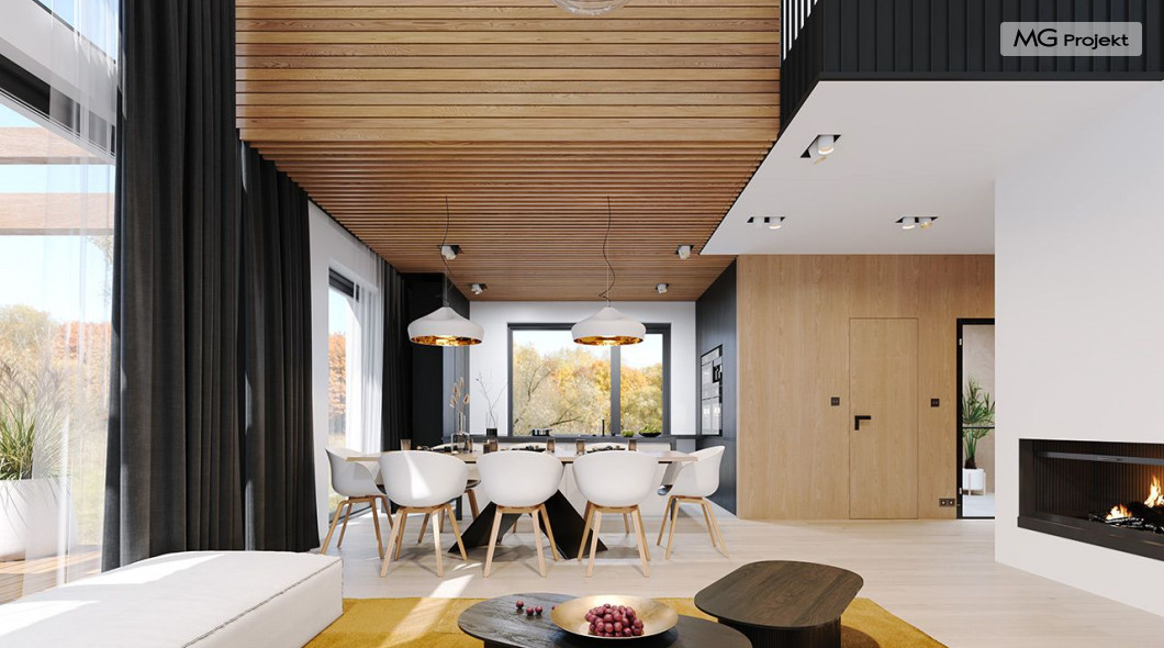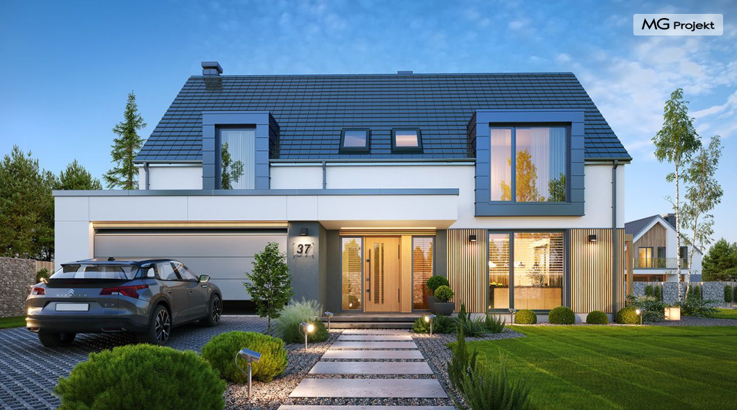 Projekt domu Mambo to kolejna propozycja z naszej serii „imprezowych” domów (Makarena, Bolero, Lambada, Party, Biba, Tango, Salsa, Rumba). Projekt domu Mambo to propozycja praktycznego, funkcjonalnego domu jednorodzinnego, parterowego z poddaszem użytkowym, o nowoczesnej architekturze, w popularnej stylistyce domu-stodoły. Bryła budynku i zastosowane detale architektoniczne tworzą nastrój komfortowej wygodnej podmiejskiej willi. Ciekawie zaprojektowane narożne przeszklenia salonu z pustką i antresolą, przełamują monotonię i oczywistość rozwiązań typowych dla domu parterowego z poddaszem i wprowadzają efekt jak w budynku piętrowym. Przeszklenia salonu na dwóch ścianach mają wysokość 1,5 kondygnacji i równej wysokości nadproża, nawiązując tym samym do dwukondygnacyjnych salonów domów piętrowych. Takie rozwiązanie dodaje domowi elegancji i oryginalności, zarówno jego fasadzie, jak i wnętrzu. Prostokątny rzut budynku przykryto dwuspadowym symetrycznym dachem z wysoką ścianą kolankową poddasza, a sylwetkę urozmaicają : od frontu - wbudowany w bryłę parterowy garaż, kubiczne lukarny poddasza i od tyłu - dobudowana pergola przykrywająca taras. Fasada domu została podzielona kolorystycznie i materiałowo na poziome pasy. Mamy tutaj : biel tynkowanych ścian, fragmenty kontrastowe tynku w odcieniach szarości, fragmenty elewacji drewnianej i dach pokryty antracytową płaską dachówką. Wnętrze budynku zaskakuje poczuciem przestrzeni, niełatwym do uzyskania w 150-metrowym domu. Największym zaskoczeniem jest tu pokój dzienny, którego narożne podwyższone okna sprawiają wrażenie jakbyśmy znaleźli się w wysokim salonie domu piętrowego. Pokój dzienny jest bardzo reprezentacyjny i oryginalny. Gubimy tutaj typowy motyw skośnego dachu we wnętrzu domu z poddaszem. Na parterze prócz salonu zaprojektowano dodatkowy pokój z łazienką, oraz garaż z pomieszczeniem kotłowni. Na poddaszu przewidziano trzy pokoje z dwiema łazienkami, w tym apartament master z własną łazienką i garderobą. Wnętrze można dowolnie kształtować, ale bez problemu zmieści się tutaj 4-6cioosobowa rodzina. Budynek zaprojektowano jako energooszczędny, z dobrymi izolacjami i nowoczesnymi instalacjami. Dom ma prostą konstrukcję i zwartą bryłę, dzięki czemu będzie łatwy w budowie i niedrogi w późniejszej eksploatacji. Mambo to propozycja dla Inwestorów pragnących zbudować nowoczesny, ciekawy i oryginalny architektonicznie dom o sensownej skali. Budynek o wysokiej jakości, ale niekoniecznie wielki. Dom dla Inwestorów chcących połączyć tradycyjną funkcjonalność z ciekawymi designerskimi detalami. Zapraszamy do zapoznania się z całą serią "roztańczonych domów": https://www.mgprojekt.com.pl/makarena, https://www.mgprojekt.com.pl/bolero, https://www.mgprojekt.com.pl/lambada, https://www.mgprojekt.com.pl/party, https://www.mgprojekt.com.pl/party-2, https://www.mgprojekt.com.pl/biba, https://www.mgprojekt.com.pl/tango, https://www.mgprojekt.com.pl/salsa, https://www.mgprojekt.com.pl/rumba.