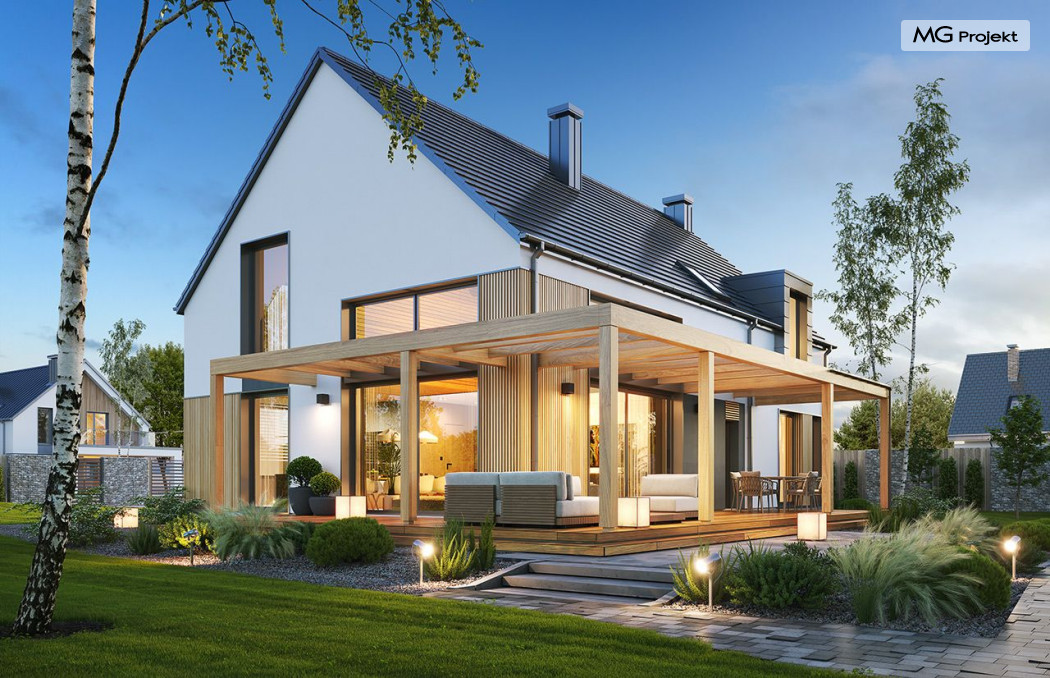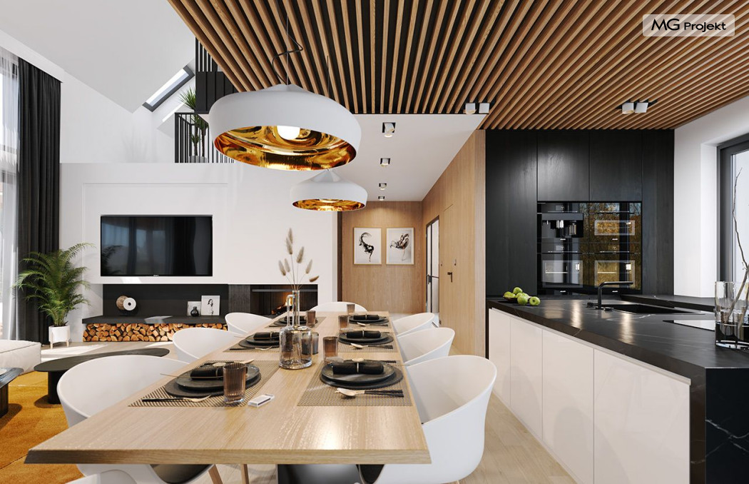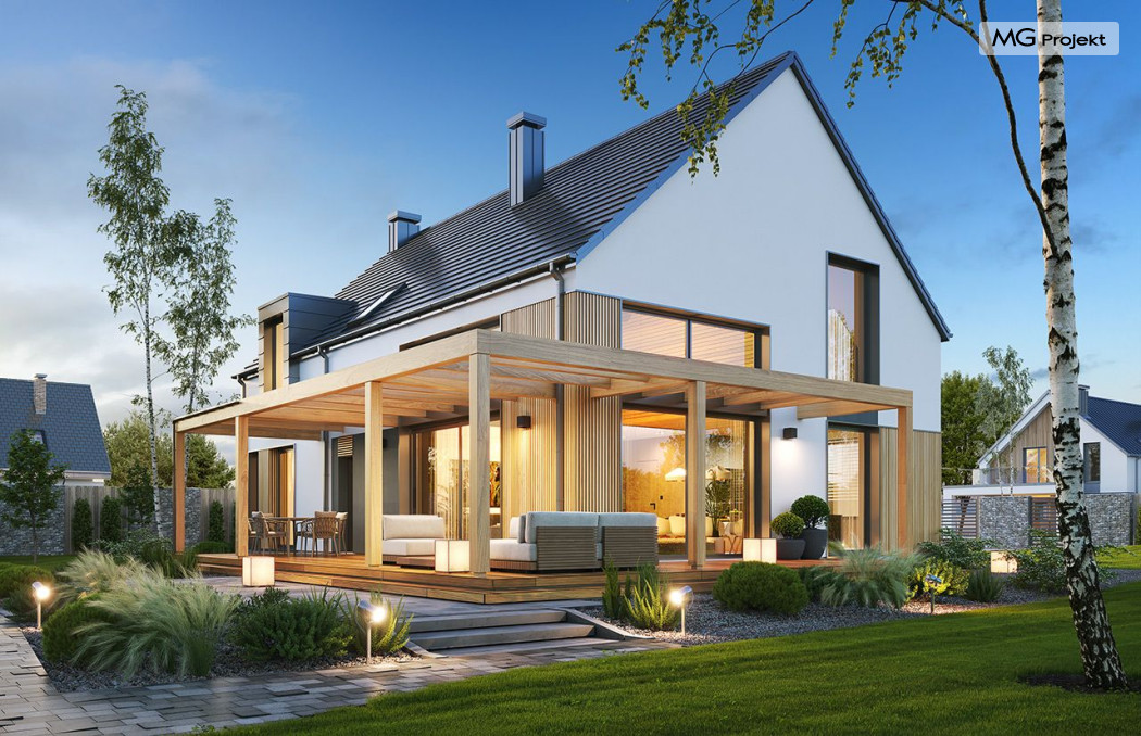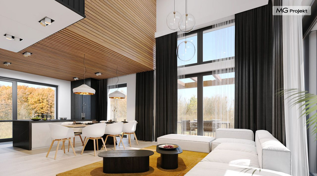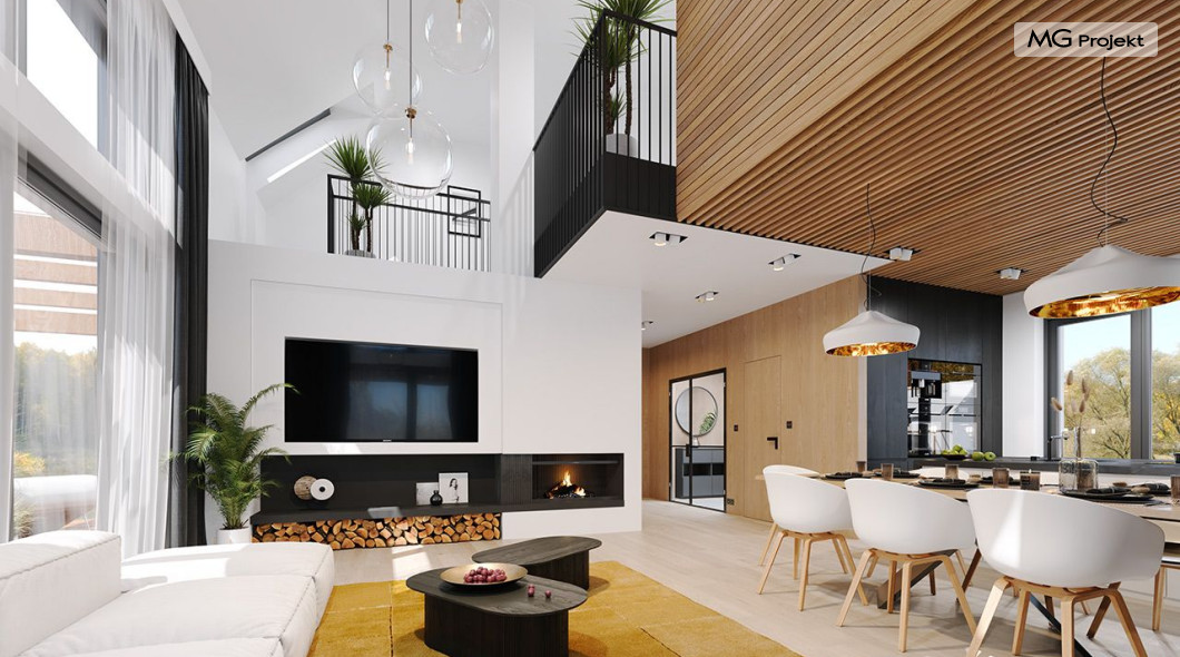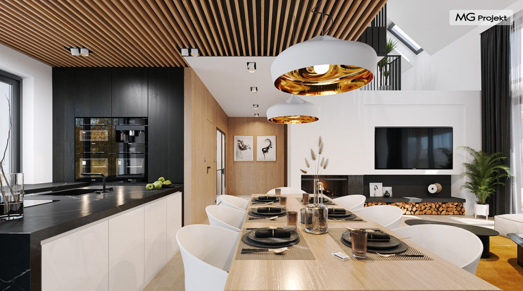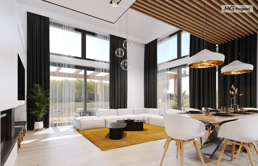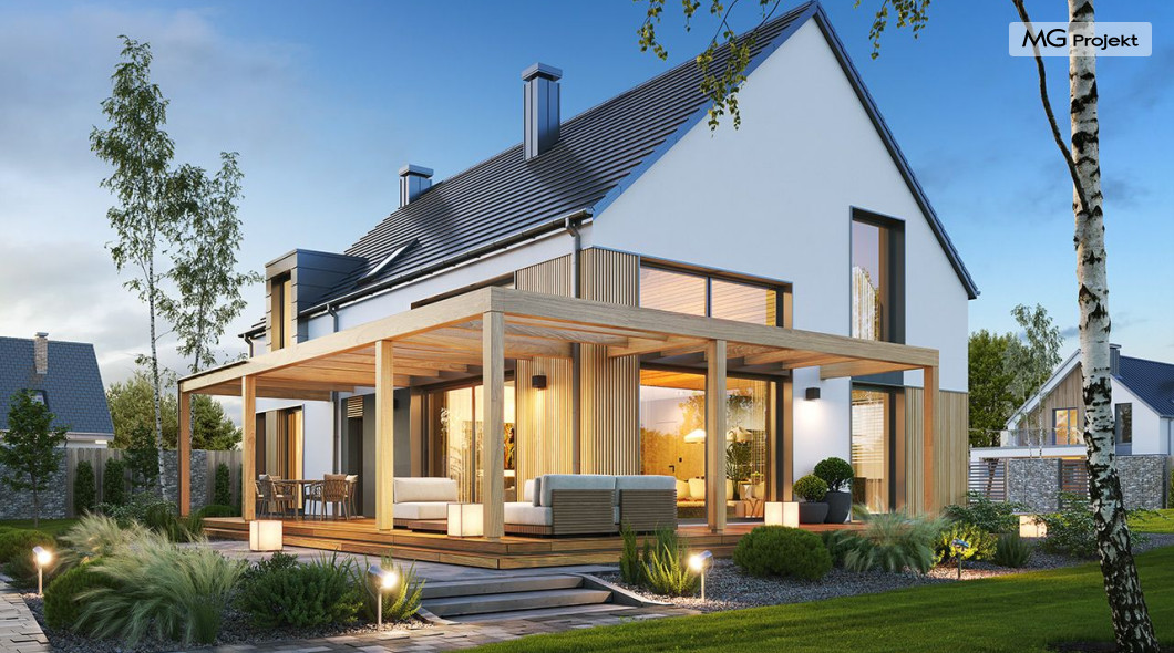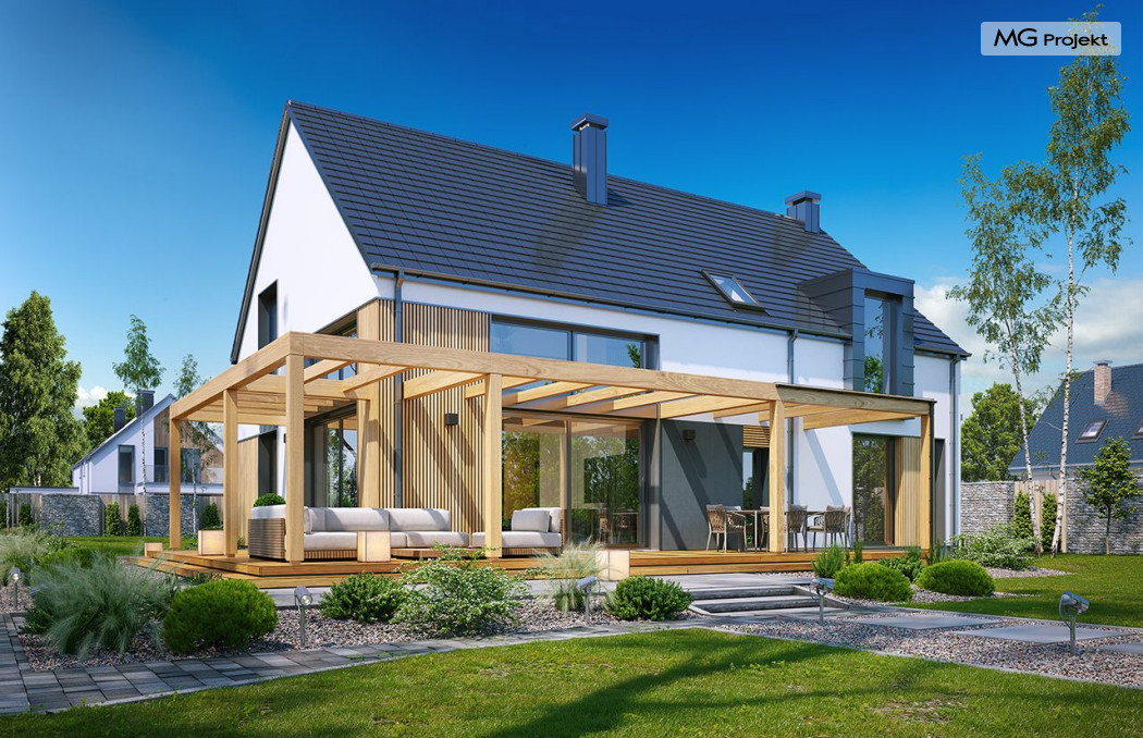 Projekt domu Mambo to kolejna propozycja z naszej serii „imprezowych” domów (Makarena, Bolero, Lambada, Party, Biba, Tango, Salsa, Rumba). Projekt domu Mambo to propozycja praktycznego, funkcjonalnego domu jednorodzinnego, parterowego z poddaszem użytkowym, o nowoczesnej architekturze, w popularnej stylistyce domu-stodoły. Bryła budynku i zastosowane detale architektoniczne tworzą nastrój komfortowej wygodnej podmiejskiej willi. Ciekawie zaprojektowane narożne przeszklenia salonu z pustką i antresolą, przełamują monotonię i oczywistość rozwiązań typowych dla domu parterowego z poddaszem i wprowadzają efekt jak w budynku piętrowym. Przeszklenia salonu na dwóch ścianach mają wysokość 1,5 kondygnacji i równej wysokości nadproża, nawiązując tym samym do dwukondygnacyjnych salonów domów piętrowych. Takie rozwiązanie dodaje domowi elegancji i oryginalności, zarówno jego fasadzie, jak i wnętrzu. Prostokątny rzut budynku przykryto dwuspadowym symetrycznym dachem z wysoką ścianą kolankową poddasza, a sylwetkę urozmaicają : od frontu - wbudowany w bryłę parterowy garaż, kubiczne lukarny poddasza i od tyłu - dobudowana pergola przykrywająca taras. Fasada domu została podzielona kolorystycznie i materiałowo na poziome pasy. Mamy tutaj : biel tynkowanych ścian, fragmenty kontrastowe tynku w odcieniach szarości, fragmenty elewacji drewnianej i dach pokryty antracytową płaską dachówką. Wnętrze budynku zaskakuje poczuciem przestrzeni, niełatwym do uzyskania w 150-metrowym domu. Największym zaskoczeniem jest tu pokój dzienny, którego narożne podwyższone okna sprawiają wrażenie jakbyśmy znaleźli się w wysokim salonie domu piętrowego. Pokój dzienny jest bardzo reprezentacyjny i oryginalny. Gubimy tutaj typowy motyw skośnego dachu we wnętrzu domu z poddaszem. Na parterze prócz salonu zaprojektowano dodatkowy pokój z łazienką, oraz garaż z pomieszczeniem kotłowni. Na poddaszu przewidziano trzy pokoje z dwiema łazienkami, w tym apartament master z własną łazienką i garderobą. Wnętrze można dowolnie kształtować, ale bez problemu zmieści się tutaj 4-6cioosobowa rodzina. Budynek zaprojektowano jako energooszczędny, z dobrymi izolacjami i nowoczesnymi instalacjami. Dom ma prostą konstrukcję i zwartą bryłę, dzięki czemu będzie łatwy w budowie i niedrogi w późniejszej eksploatacji. Mambo to propozycja dla Inwestorów pragnących zbudować nowoczesny, ciekawy i oryginalny architektonicznie dom o sensownej skali. Budynek o wysokiej jakości, ale niekoniecznie wielki. Dom dla Inwestorów chcących połączyć tradycyjną funkcjonalność z ciekawymi designerskimi detalami. Zapraszamy do zapoznania się z całą serią "roztańczonych domów": https://www.mgprojekt.com.pl/makarena, https://www.mgprojekt.com.pl/bolero, https://www.mgprojekt.com.pl/lambada, https://www.mgprojekt.com.pl/party, https://www.mgprojekt.com.pl/party-2, https://www.mgprojekt.com.pl/biba, https://www.mgprojekt.com.pl/tango, https://www.mgprojekt.com.pl/salsa, https://www.mgprojekt.com.pl/rumba.