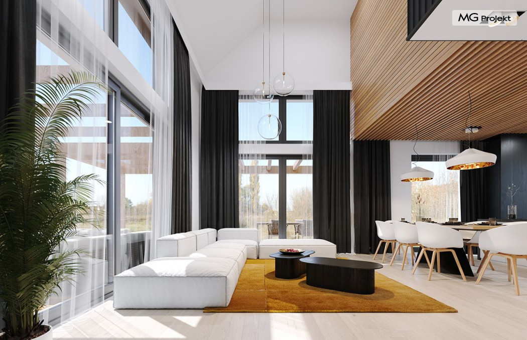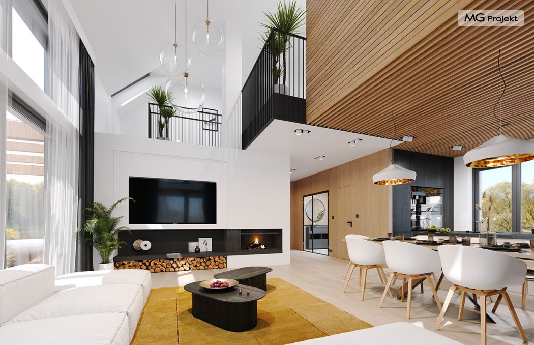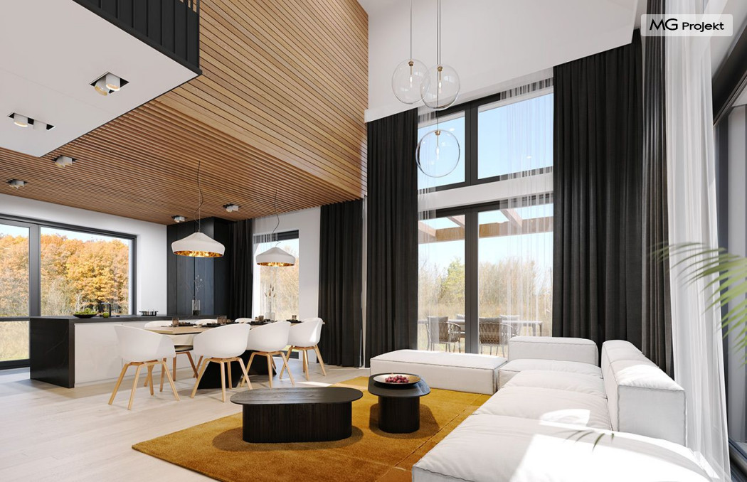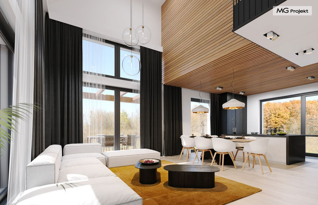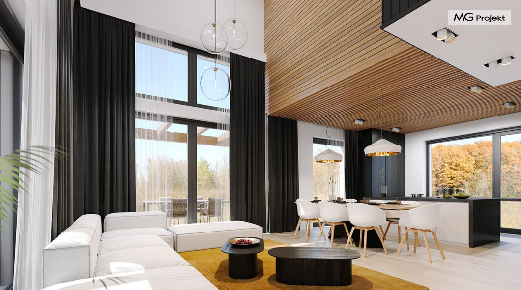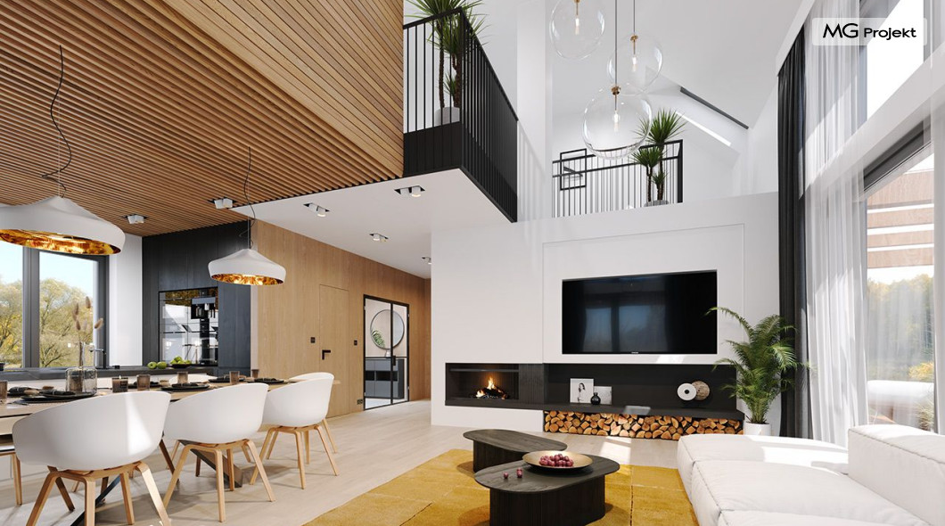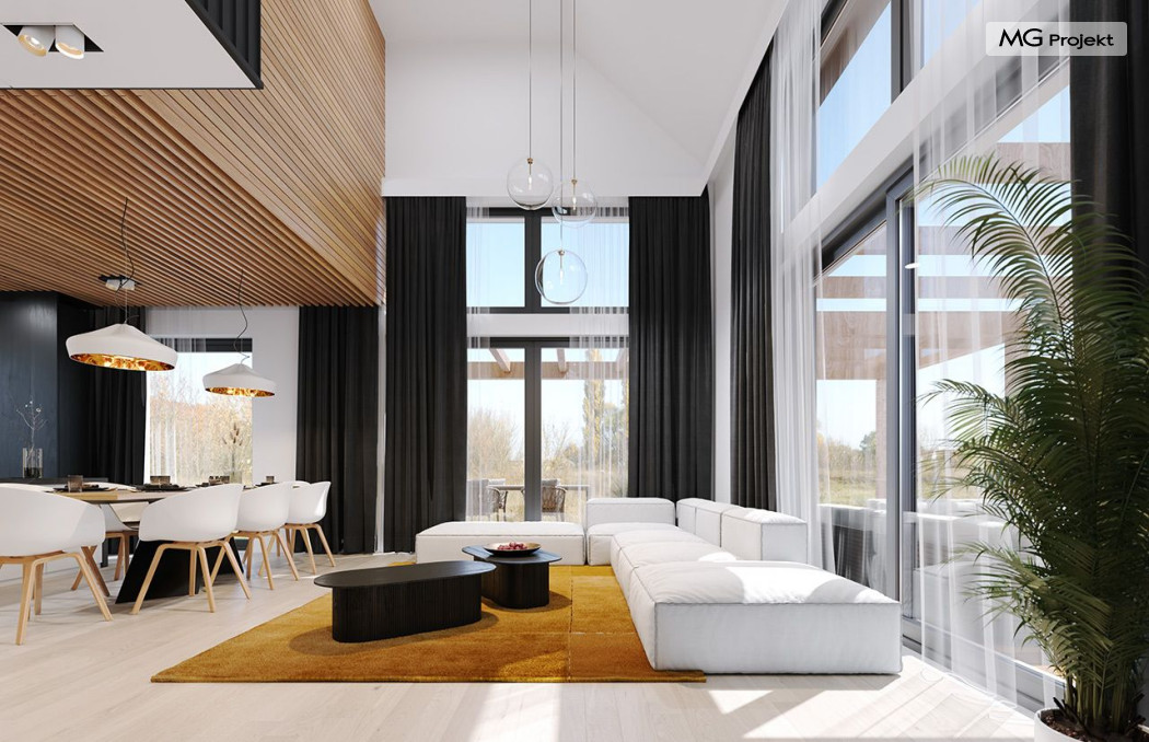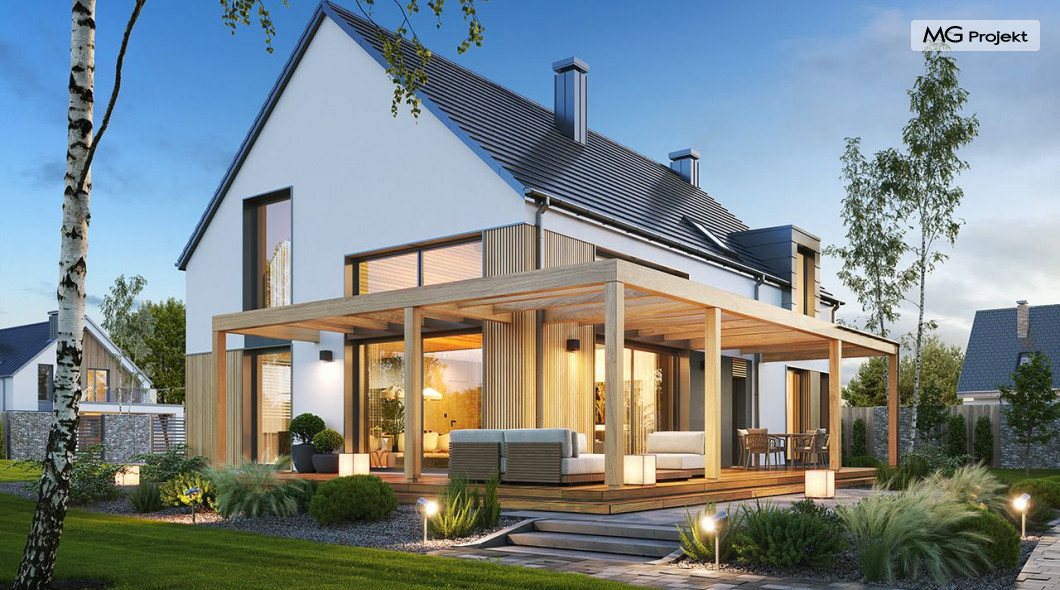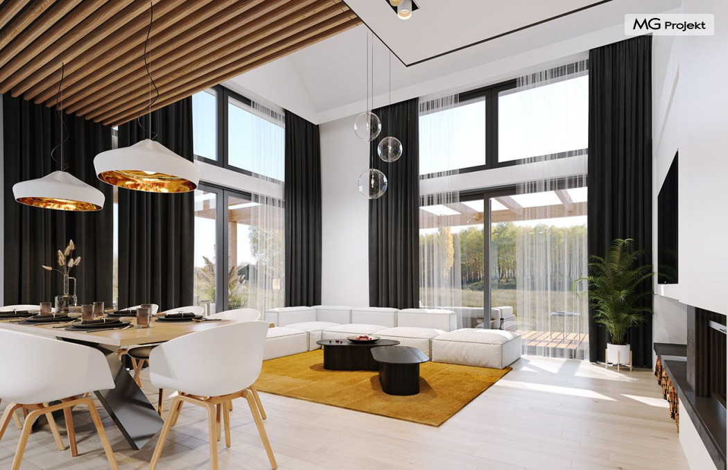 Projekt domu Mambo to kolejna propozycja z naszej serii „imprezowych” domów (Makarena, Bolero, Lambada, Party, Biba, Tango, Salsa, Rumba). Projekt domu Mambo to propozycja praktycznego, funkcjonalnego domu jednorodzinnego, parterowego z poddaszem użytkowym, o nowoczesnej architekturze, w popularnej stylistyce domu-stodoły. Bryła budynku i zastosowane detale architektoniczne tworzą nastrój komfortowej wygodnej podmiejskiej willi. Ciekawie zaprojektowane narożne przeszklenia salonu z pustką i antresolą, przełamują monotonię i oczywistość rozwiązań typowych dla domu parterowego z poddaszem i wprowadzają efekt jak w budynku piętrowym. Przeszklenia salonu na dwóch ścianach mają wysokość 1,5 kondygnacji i równej wysokości nadproża, nawiązując tym samym do dwukondygnacyjnych salonów domów piętrowych. Takie rozwiązanie dodaje domowi elegancji i oryginalności, zarówno jego fasadzie, jak i wnętrzu. Prostokątny rzut budynku przykryto dwuspadowym symetrycznym dachem z wysoką ścianą kolankową poddasza, a sylwetkę urozmaicają : od frontu - wbudowany w bryłę parterowy garaż, kubiczne lukarny poddasza i od tyłu - dobudowana pergola przykrywająca taras. Fasada domu została podzielona kolorystycznie i materiałowo na poziome pasy. Mamy tutaj : biel tynkowanych ścian, fragmenty kontrastowe tynku w odcieniach szarości, fragmenty elewacji drewnianej i dach pokryty antracytową płaską dachówką. Wnętrze budynku zaskakuje poczuciem przestrzeni, niełatwym do uzyskania w 150-metrowym domu. Największym zaskoczeniem jest tu pokój dzienny, którego narożne podwyższone okna sprawiają wrażenie jakbyśmy znaleźli się w wysokim salonie domu piętrowego. Pokój dzienny jest bardzo reprezentacyjny i oryginalny. Gubimy tutaj typowy motyw skośnego dachu we wnętrzu domu z poddaszem. Na parterze prócz salonu zaprojektowano dodatkowy pokój z łazienką, oraz garaż z pomieszczeniem kotłowni. Na poddaszu przewidziano trzy pokoje z dwiema łazienkami, w tym apartament master z własną łazienką i garderobą. Wnętrze można dowolnie kształtować, ale bez problemu zmieści się tutaj 4-6cioosobowa rodzina. Budynek zaprojektowano jako energooszczędny, z dobrymi izolacjami i nowoczesnymi instalacjami. Dom ma prostą konstrukcję i zwartą bryłę, dzięki czemu będzie łatwy w budowie i niedrogi w późniejszej eksploatacji. Mambo to propozycja dla Inwestorów pragnących zbudować nowoczesny, ciekawy i oryginalny architektonicznie dom o sensownej skali. Budynek o wysokiej jakości, ale niekoniecznie wielki. Dom dla Inwestorów chcących połączyć tradycyjną funkcjonalność z ciekawymi designerskimi detalami. Zapraszamy do zapoznania się z całą serią "roztańczonych domów": https://www.mgprojekt.com.pl/makarena, https://www.mgprojekt.com.pl/bolero, https://www.mgprojekt.com.pl/lambada, https://www.mgprojekt.com.pl/party, https://www.mgprojekt.com.pl/party-2, https://www.mgprojekt.com.pl/biba, https://www.mgprojekt.com.pl/tango, https://www.mgprojekt.com.pl/salsa, https://www.mgprojekt.com.pl/rumba.