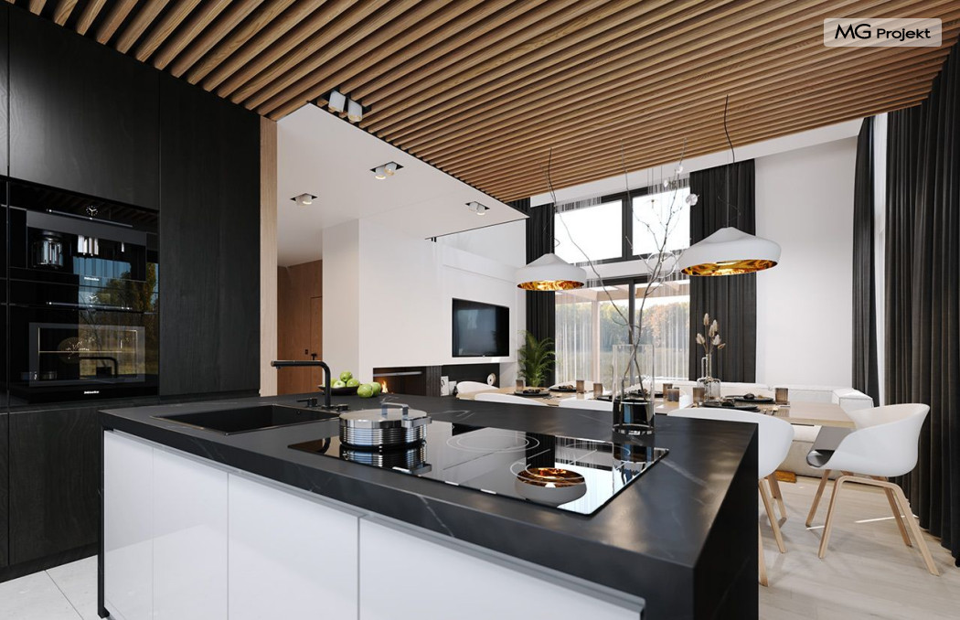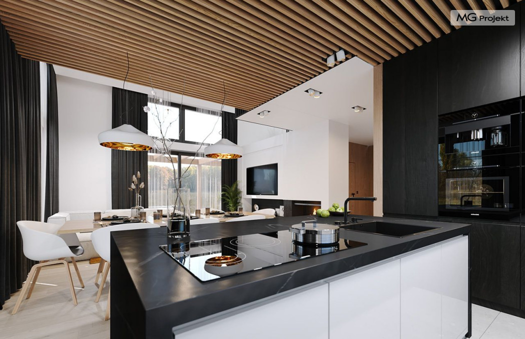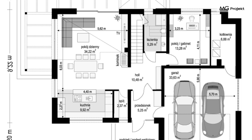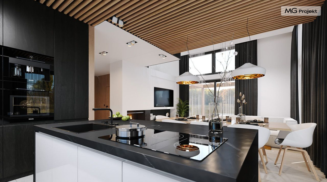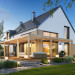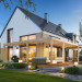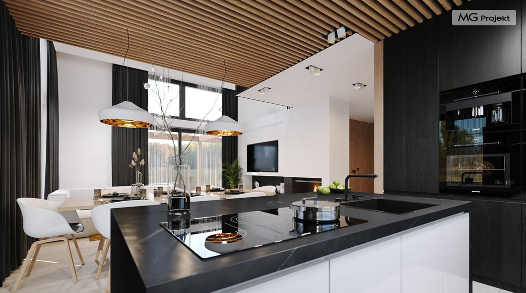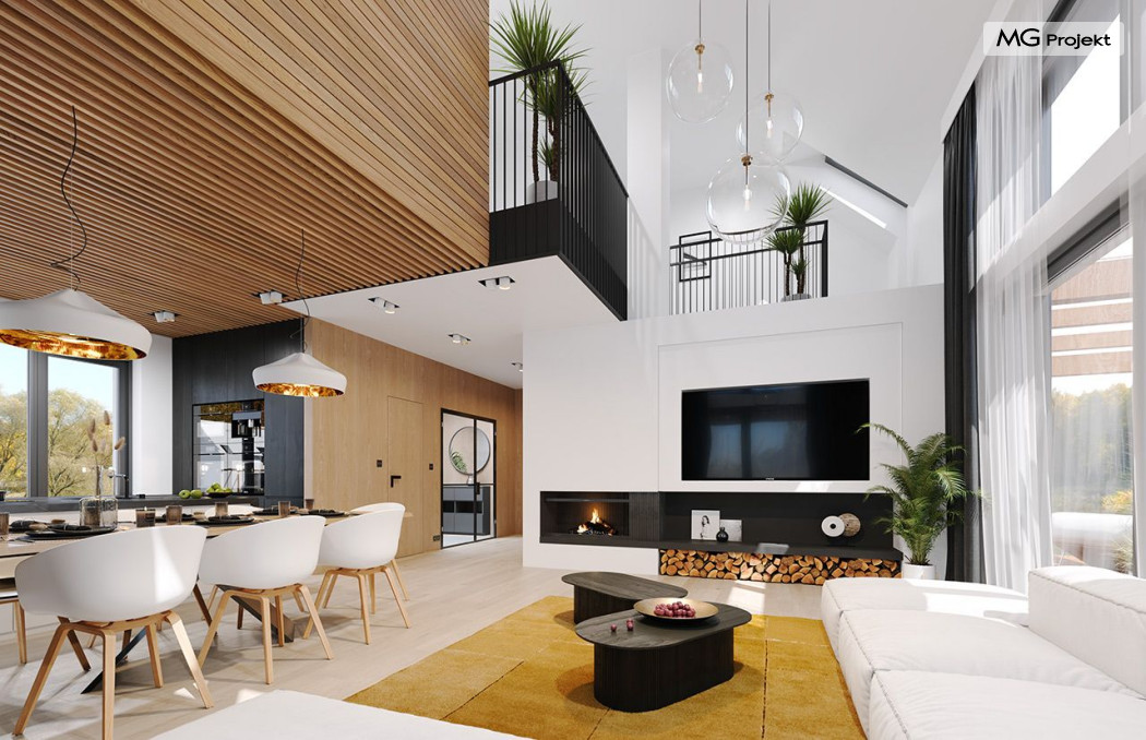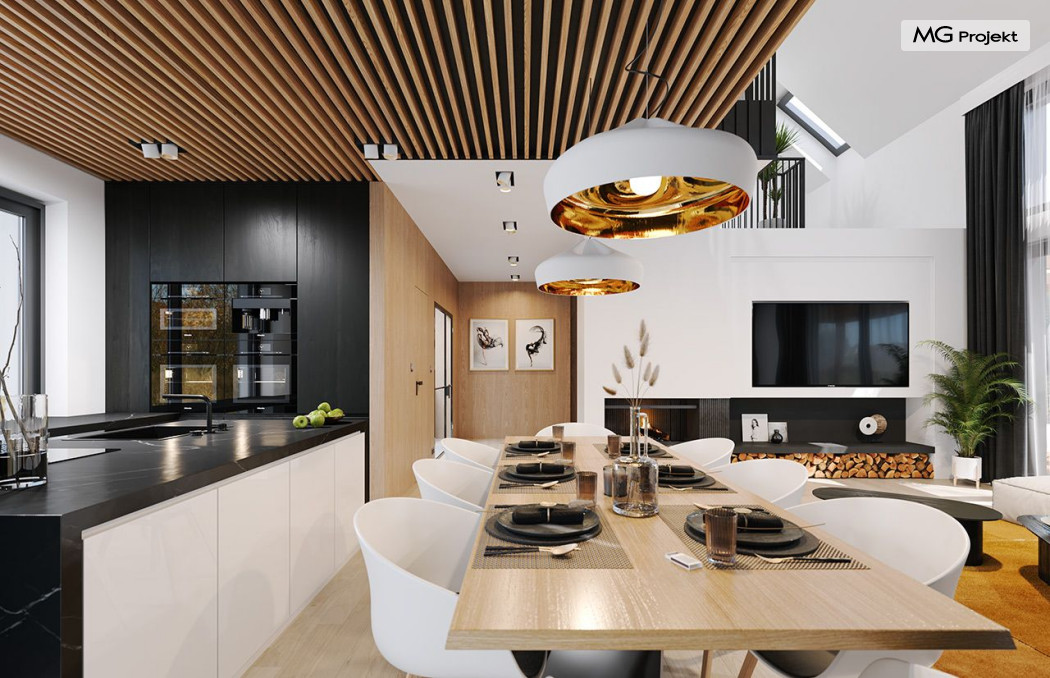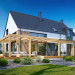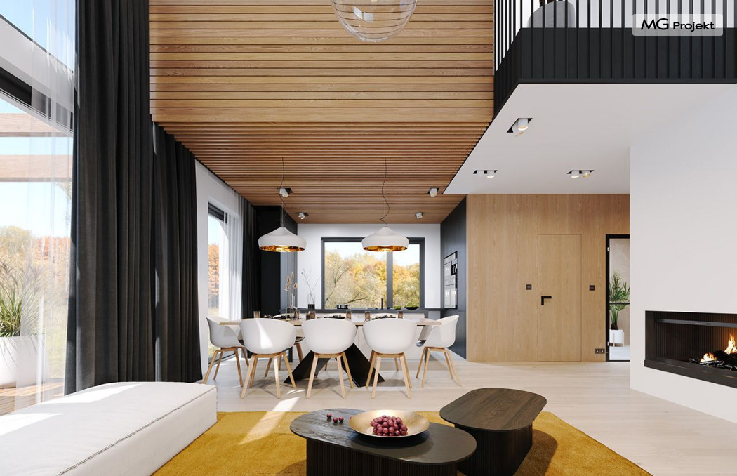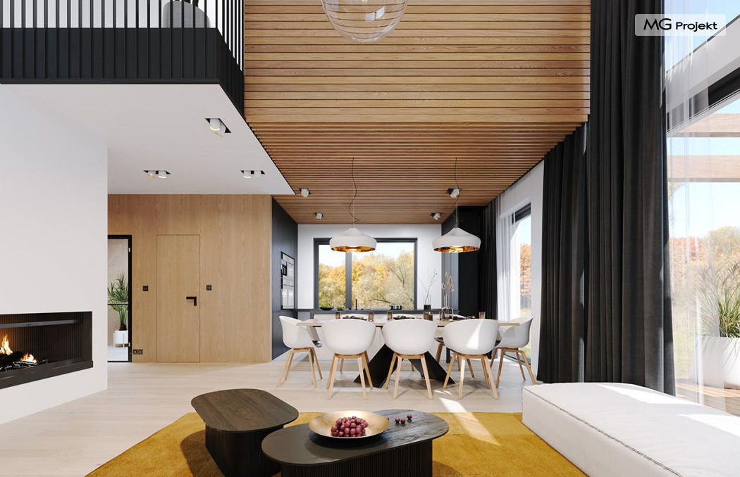 Projekt domu Mambo to kolejna propozycja z naszej serii „imprezowych” domów (Makarena, Bolero, Lambada, Party, Biba, Tango, Salsa, Rumba). Projekt domu Mambo to propozycja praktycznego, funkcjonalnego domu jednorodzinnego, parterowego z poddaszem użytkowym, o nowoczesnej architekturze, w popularnej stylistyce domu-stodoły. Bryła budynku i zastosowane detale architektoniczne tworzą nastrój komfortowej wygodnej podmiejskiej willi. Ciekawie zaprojektowane narożne przeszklenia salonu z pustką i antresolą, przełamują monotonię i oczywistość rozwiązań typowych dla domu parterowego z poddaszem i wprowadzają efekt jak w budynku piętrowym. Przeszklenia salonu na dwóch ścianach mają wysokość 1,5 kondygnacji i równej wysokości nadproża, nawiązując tym samym do dwukondygnacyjnych salonów domów piętrowych. Takie rozwiązanie dodaje domowi elegancji i oryginalności, zarówno jego fasadzie, jak i wnętrzu. Prostokątny rzut budynku przykryto dwuspadowym symetrycznym dachem z wysoką ścianą kolankową poddasza, a sylwetkę urozmaicają : od frontu - wbudowany w bryłę parterowy garaż, kubiczne lukarny poddasza i od tyłu - dobudowana pergola przykrywająca taras. Fasada domu została podzielona kolorystycznie i materiałowo na poziome pasy. Mamy tutaj : biel tynkowanych ścian, fragmenty kontrastowe tynku w odcieniach szarości, fragmenty elewacji drewnianej i dach pokryty antracytową płaską dachówką. Wnętrze budynku zaskakuje poczuciem przestrzeni, niełatwym do uzyskania w 150-metrowym domu. Największym zaskoczeniem jest tu pokój dzienny, którego narożne podwyższone okna sprawiają wrażenie jakbyśmy znaleźli się w wysokim salonie domu piętrowego. Pokój dzienny jest bardzo reprezentacyjny i oryginalny. Gubimy tutaj typowy motyw skośnego dachu we wnętrzu domu z poddaszem. Na parterze prócz salonu zaprojektowano dodatkowy pokój z łazienką, oraz garaż z pomieszczeniem kotłowni. Na poddaszu przewidziano trzy pokoje z dwiema łazienkami, w tym apartament master z własną łazienką i garderobą. Wnętrze można dowolnie kształtować, ale bez problemu zmieści się tutaj 4-6cioosobowa rodzina. Budynek zaprojektowano jako energooszczędny, z dobrymi izolacjami i nowoczesnymi instalacjami. Dom ma prostą konstrukcję i zwartą bryłę, dzięki czemu będzie łatwy w budowie i niedrogi w późniejszej eksploatacji. Mambo to propozycja dla Inwestorów pragnących zbudować nowoczesny, ciekawy i oryginalny architektonicznie dom o sensownej skali. Budynek o wysokiej jakości, ale niekoniecznie wielki. Dom dla Inwestorów chcących połączyć tradycyjną funkcjonalność z ciekawymi designerskimi detalami. Zapraszamy do zapoznania się z całą serią "roztańczonych domów": https://www.mgprojekt.com.pl/makarena, https://www.mgprojekt.com.pl/bolero, https://www.mgprojekt.com.pl/lambada, https://www.mgprojekt.com.pl/party, https://www.mgprojekt.com.pl/party-2, https://www.mgprojekt.com.pl/biba, https://www.mgprojekt.com.pl/tango, https://www.mgprojekt.com.pl/salsa, https://www.mgprojekt.com.pl/rumba.