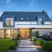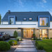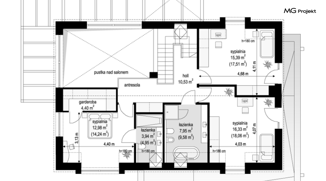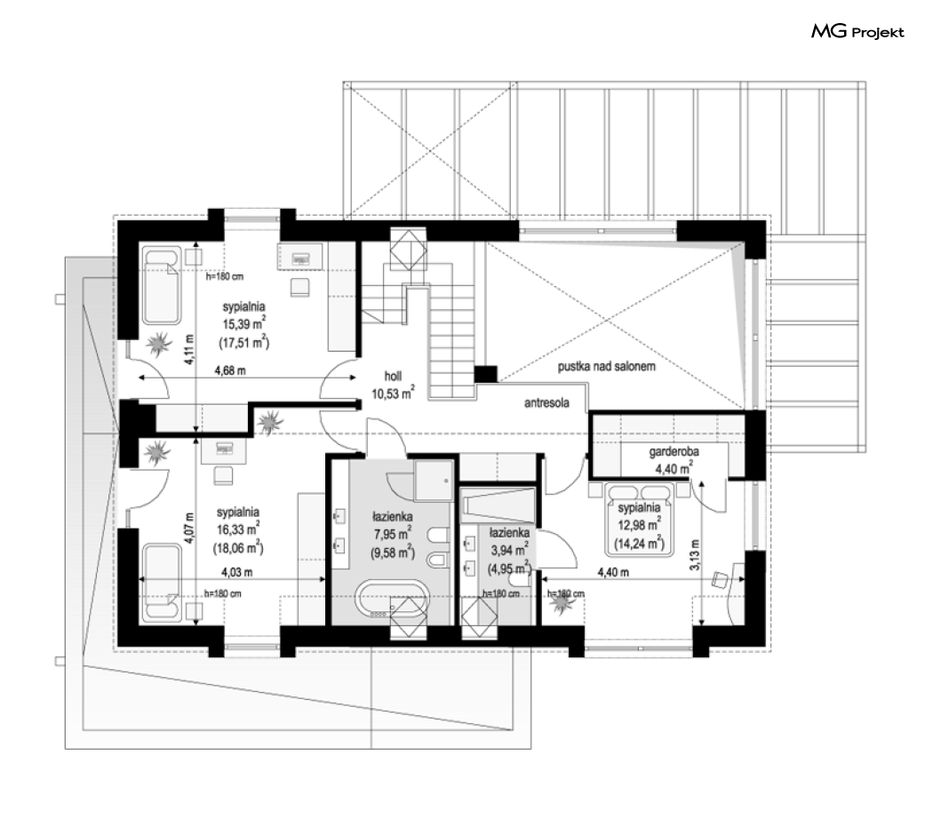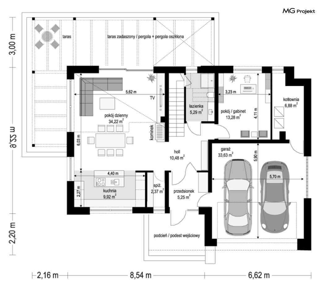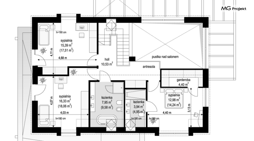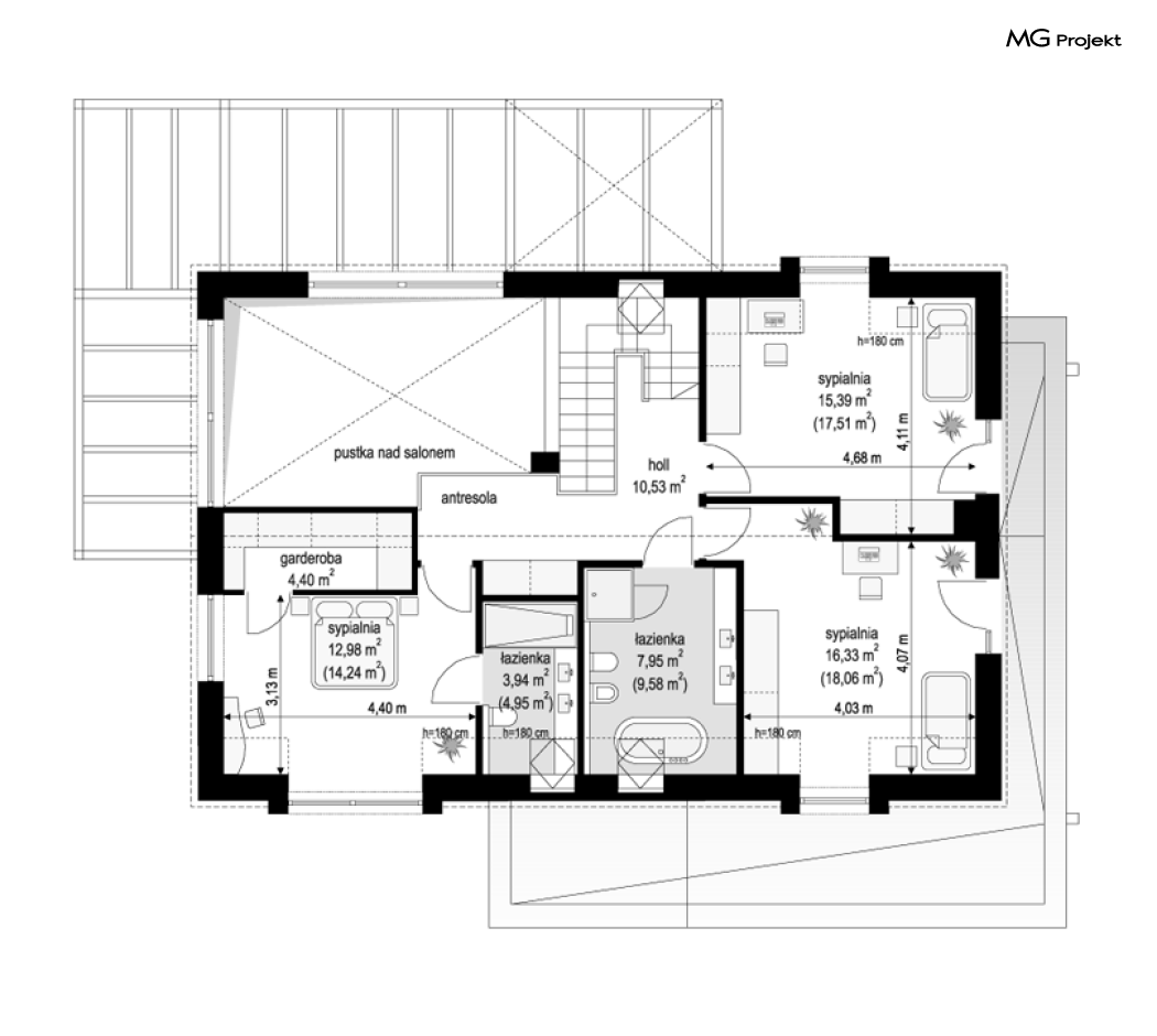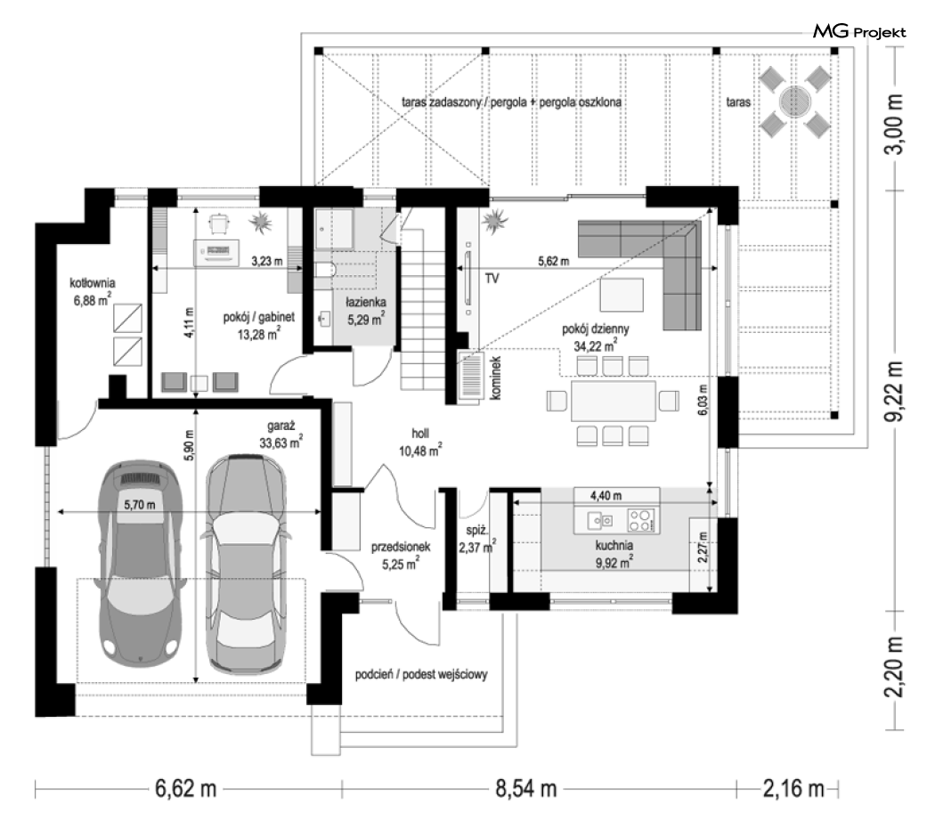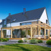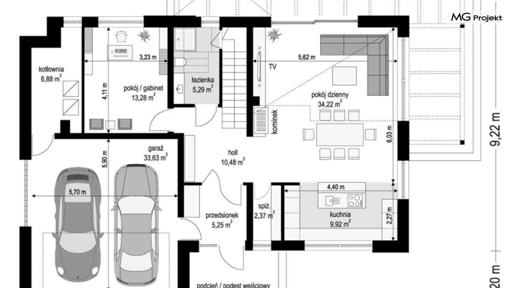 Projekt domu Mambo to kolejna propozycja z naszej serii „imprezowych” domów (Makarena, Bolero, Lambada, Party, Biba, Tango, Salsa, Rumba). Projekt domu Mambo to propozycja praktycznego, funkcjonalnego domu jednorodzinnego, parterowego z poddaszem użytkowym, o nowoczesnej architekturze, w popularnej stylistyce domu-stodoły. Bryła budynku i zastosowane detale architektoniczne tworzą nastrój komfortowej wygodnej podmiejskiej willi. Ciekawie zaprojektowane narożne przeszklenia salonu z pustką i antresolą, przełamują monotonię i oczywistość rozwiązań typowych dla domu parterowego z poddaszem i wprowadzają efekt jak w budynku piętrowym. Przeszklenia salonu na dwóch ścianach mają wysokość 1,5 kondygnacji i równej wysokości nadproża, nawiązując tym samym do dwukondygnacyjnych salonów domów piętrowych. Takie rozwiązanie dodaje domowi elegancji i oryginalności, zarówno jego fasadzie, jak i wnętrzu. Prostokątny rzut budynku przykryto dwuspadowym symetrycznym dachem z wysoką ścianą kolankową poddasza, a sylwetkę urozmaicają : od frontu - wbudowany w bryłę parterowy garaż, kubiczne lukarny poddasza i od tyłu - dobudowana pergola przykrywająca taras. Fasada domu została podzielona kolorystycznie i materiałowo na poziome pasy. Mamy tutaj : biel tynkowanych ścian, fragmenty kontrastowe tynku w odcieniach szarości, fragmenty elewacji drewnianej i dach pokryty antracytową płaską dachówką. Wnętrze budynku zaskakuje poczuciem przestrzeni, niełatwym do uzyskania w 150-metrowym domu. Największym zaskoczeniem jest tu pokój dzienny, którego narożne podwyższone okna sprawiają wrażenie jakbyśmy znaleźli się w wysokim salonie domu piętrowego. Pokój dzienny jest bardzo reprezentacyjny i oryginalny. Gubimy tutaj typowy motyw skośnego dachu we wnętrzu domu z poddaszem. Na parterze prócz salonu zaprojektowano dodatkowy pokój z łazienką, oraz garaż z pomieszczeniem kotłowni. Na poddaszu przewidziano trzy pokoje z dwiema łazienkami, w tym apartament master z własną łazienką i garderobą. Wnętrze można dowolnie kształtować, ale bez problemu zmieści się tutaj 4-6cioosobowa rodzina. Budynek zaprojektowano jako energooszczędny, z dobrymi izolacjami i nowoczesnymi instalacjami. Dom ma prostą konstrukcję i zwartą bryłę, dzięki czemu będzie łatwy w budowie i niedrogi w późniejszej eksploatacji. Mambo to propozycja dla Inwestorów pragnących zbudować nowoczesny, ciekawy i oryginalny architektonicznie dom o sensownej skali. Budynek o wysokiej jakości, ale niekoniecznie wielki. Dom dla Inwestorów chcących połączyć tradycyjną funkcjonalność z ciekawymi designerskimi detalami. Zapraszamy do zapoznania się z całą serią "roztańczonych domów": https://www.mgprojekt.com.pl/makarena, https://www.mgprojekt.com.pl/bolero, https://www.mgprojekt.com.pl/lambada, https://www.mgprojekt.com.pl/party, https://www.mgprojekt.com.pl/party-2, https://www.mgprojekt.com.pl/biba, https://www.mgprojekt.com.pl/tango, https://www.mgprojekt.com.pl/salsa, https://www.mgprojekt.com.pl/rumba.