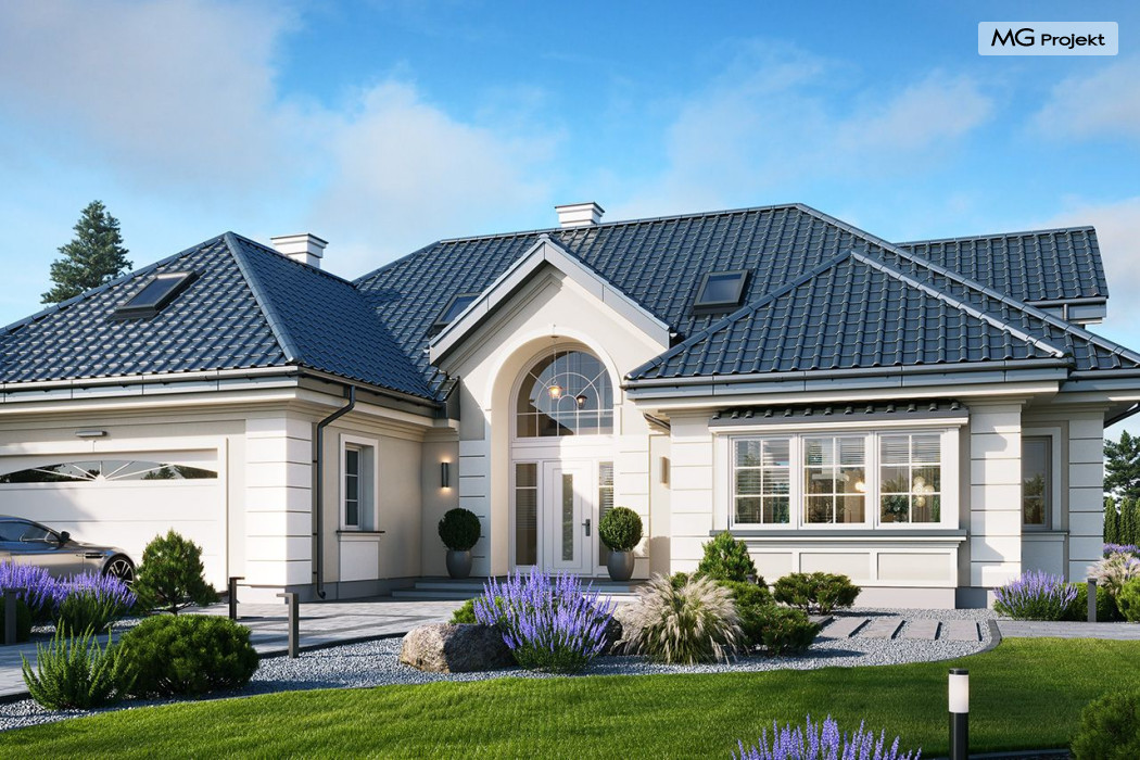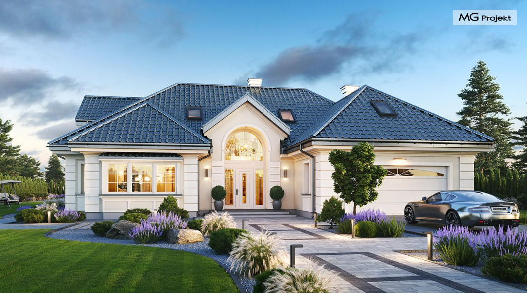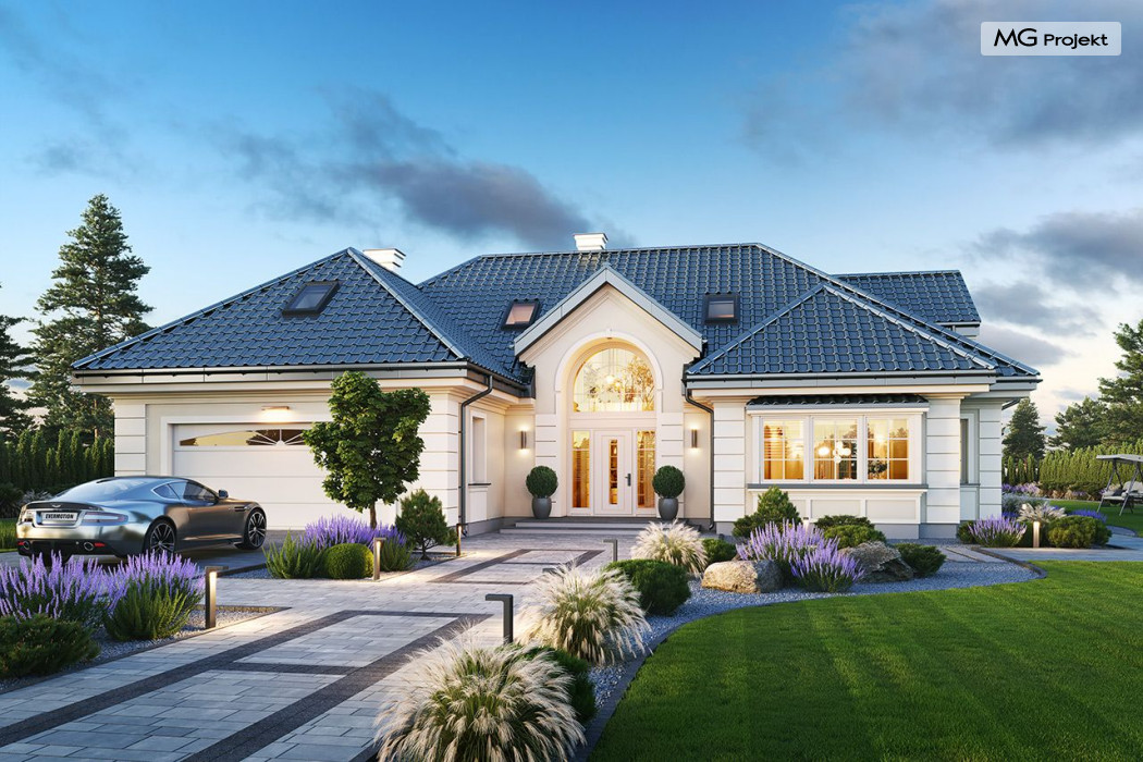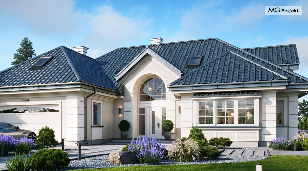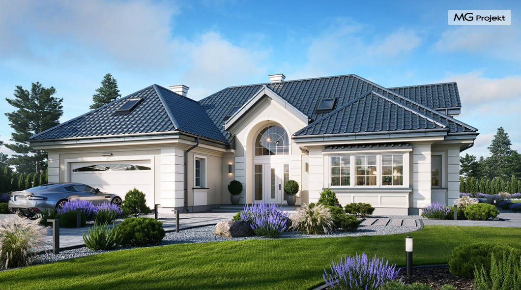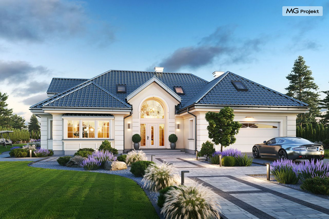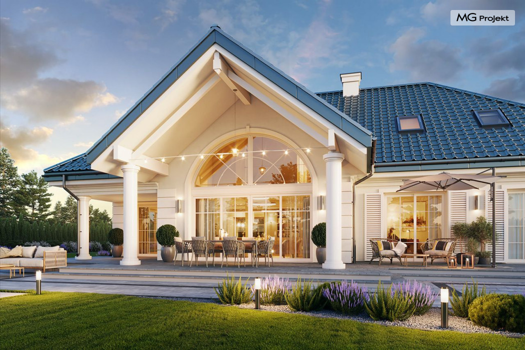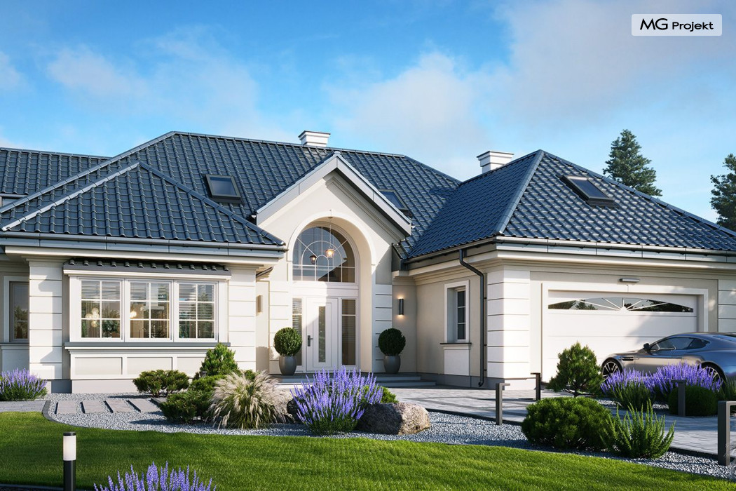 Projekt domu Willa Parkowa 9 jest kolejną wersją projektu z cieszącej się uznaniem serii domów : „Willa Parkowa”. Projekt domu jednorodzinnego, parterowego z poddaszem użytkowym, przeznaczonego dla rodziny 4-5cioosobowej, będącego połączeniem funkcjonalnej nowoczesnej willi, z klasyczną dworkowo-rezydencyjną stylistyką. Dom zaprojektowano na planie prostokąta, z dobudowaną częścią garażową, oraz wykuszami kuchni i salonu. Budynek łączy w sobie detale charakterystyczne dla serii projektów „Parkowa”, ale jednocześnie jest zaprojektowany zupełnie od nowa, z inną zasadą kształtowania wnętrza i zewnętrznych fasad. Bryła budynku jest tutaj bardziej zwarta, węższa a zarazem głębsza, podwyższony dach o kącie 38 stopni mieści w sobie pełne poddasze użytkowe, część wejściowa, wkomponowana między zadaszenie garażu i dach nad kuchnią ma zmienioną – bardziej reprezentacyjną formę, z podwyższonym naświetlem nad drzwiami wejściowymi. Część wejściowa wygląda jeszcze bardziej atrakcyjnie w stosunku do tradycyjnego portalu w projektach „Parkowych” i przypomina swoim wyglądem wzory eleganckich portyków wejściowych amerykańskich rezydencji. Od strony ogrodowej tradycyjnie dla tej serii projektów dominuje wielkie okno salonu z łukowym naświetlem, skryte w dekoracyjnym zadaszeniu nad tarasem. Zadaszenie przesunięte jest bardziej na środek elewacji. Całość bryły domu wieńczy masywny wielospadowy dach przykryty dachówką ceramiczną. Wnętrze „Willi Parkowej 9” podzielono w następujący sposób: parter to cześć dzienna, oddzielny apartament master z dodatkowym pokojem do pracy, oraz garaż z pomieszczeniem technicznym. Poddasze to sypialnie dziecięce z łazienkami i przestrzeń strychowa nad garażem. Do domu wchodzimy przez piękną podwyższoną sień z naświetlami, do holu i następnie części dziennej, składającej się z salonu wypoczynkowego, jadalni, oraz częściowo otwartej kuchni. W salonie dominującymi elementami są duże przeszklenie otwierające pokój dzienny na taras i ogród, oraz otwarcie sufitu na dach i antresolę na poddaszu. Po drugiej stronie domu znajdują się wygodne schody na poddasze, przejście do garażu i kotłowni, a także oddzielna część rodziców z sypialnią master, własną łazienką, garderobą, wyjściem na taras ogrodowy i dodatkowym pokojem – gabinetem. Na poddaszu mieszczą się dwie duże sypialnie dziecięce, dwie łazienki i dodatkowe pomieszczenie nad garażem - strych /magazyn, który w łatwy sposób może być przystosowany jako dodatkowy pokój. Wnętrze domu zaprojektowano w taki sposób aby łatwo można je było przystosować na przestrzeni lat do funkcjonowania rodziny - od małych dzieci, przez dzieci większe -nastoletnie, przez prawie dorosłe, aż do momentu gdy gospodarze zostają sami na swoich „włościach”. „Willa Parkowa 9” została zaprojektowana jako dom energooszczędny, z dobrej jakości materiałów, z dobrą izolacją termiczną i z nowoczesnymi instalacjami. Budynek mimo rozbudowanej bryły wykonano w tradycyjnej technologii, z rozwiązaniami spotykanymi na każdej budowie. Budowa domu nie powinna być problemem dla fachowego wykonawcy. Willa Parkowa 9 to doskonała propozycja dla Inwestorów planujących budowę wygodnego domu o klasycznej architekturze, dającego przestrzeń do komfortowego życia, marzących o realizacji nietuzinkowego projektu o ponadczasowej stylistyce. Zapraszamy do obejrzenia wszystkich projektów domów z serii Willa Parkowa: https://www.mgprojekt.com.pl/willa-parkowa, https://www.mgprojekt.com.pl/willa-parkowa-2, https://www.mgprojekt.com.pl/willa-parkowa-3, https://www.mgprojekt.com.pl/willa-parkowa-4, https://www.mgprojekt.com.pl/willa-parkowa-5, https://www.mgprojekt.com.pl/willa-parkowa-6, https://www.mgprojekt.com.pl/willa-parkowa-6-d, https://www.mgprojekt.com.pl/willa-parkowa-7, https://www.mgprojekt.com.pl/willa-parkowa-8-a, https://www.mgprojekt.com.pl/willa-parkowa-8-b, https://www.mgprojekt.com.pl/willa-parkowa-9, https://www.mgprojekt.com.pl/willa-parkowa-10, https://www.mgprojekt.com.pl/willa-parkowa-b, https://www.mgprojekt.com.pl/willa-parkowa-c, https://www.mgprojekt.com.pl/willa-parkowa-d.