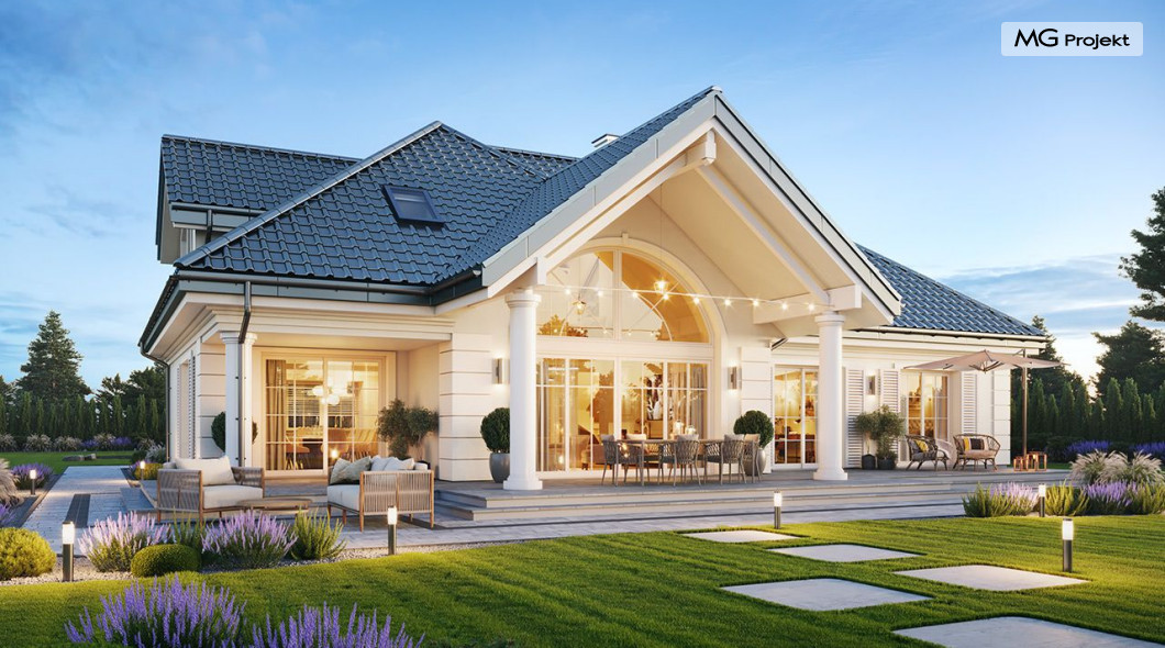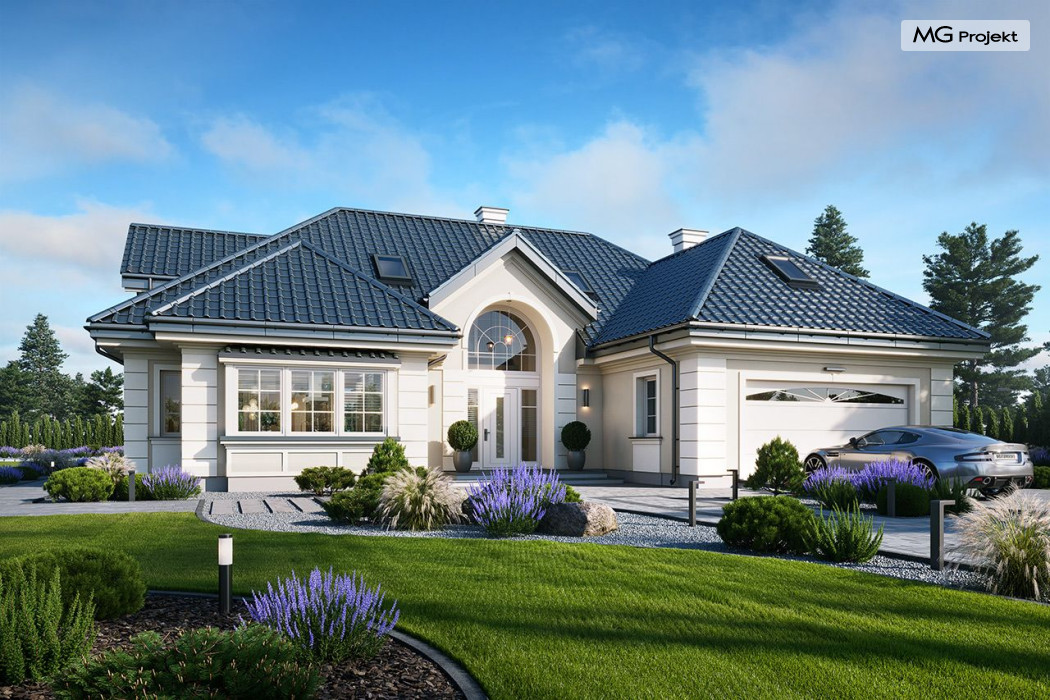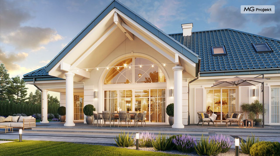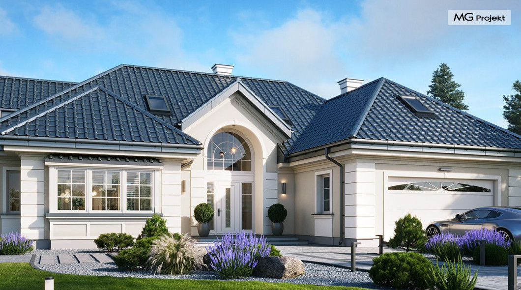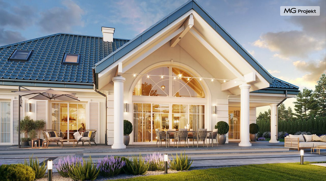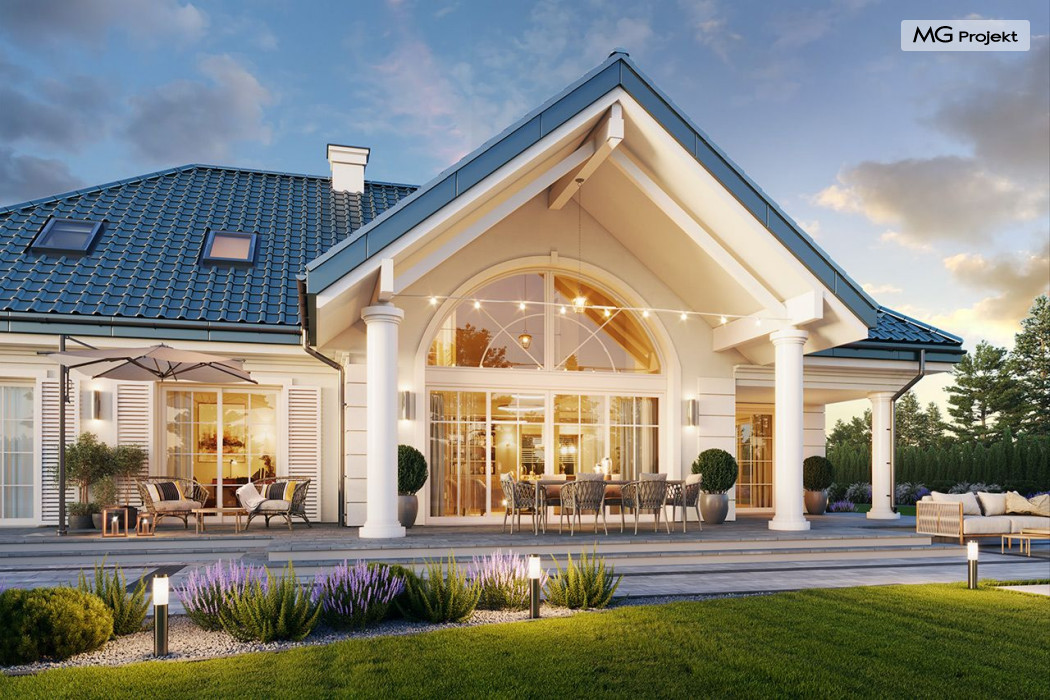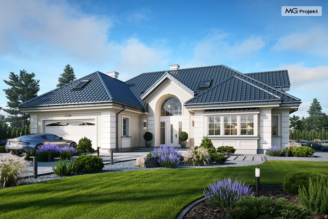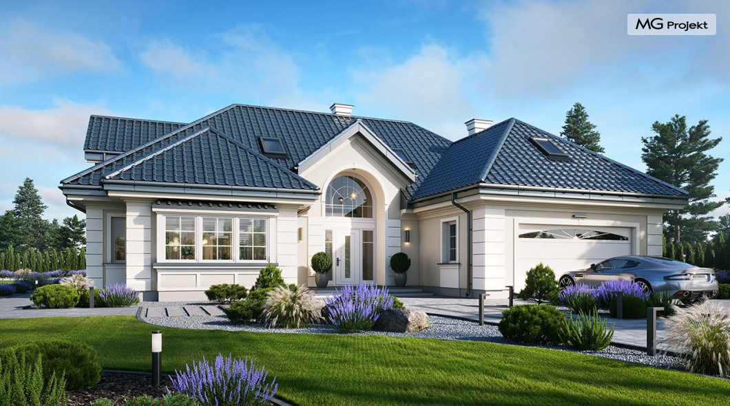 Projekt domu Willa Parkowa 9 jest kolejną wersją projektu z cieszącej się uznaniem serii domów : „Willa Parkowa”. Projekt domu jednorodzinnego, parterowego z poddaszem użytkowym, przeznaczonego dla rodziny 4-5cioosobowej, będącego połączeniem funkcjonalnej nowoczesnej willi, z klasyczną dworkowo-rezydencyjną stylistyką. Dom zaprojektowano na planie prostokąta, z dobudowaną częścią garażową, oraz wykuszami kuchni i salonu. Budynek łączy w sobie detale charakterystyczne dla serii projektów „Parkowa”, ale jednocześnie jest zaprojektowany zupełnie od nowa, z inną zasadą kształtowania wnętrza i zewnętrznych fasad. Bryła budynku jest tutaj bardziej zwarta, węższa a zarazem głębsza, podwyższony dach o kącie 38 stopni mieści w sobie pełne poddasze użytkowe, część wejściowa, wkomponowana między zadaszenie garażu i dach nad kuchnią ma zmienioną – bardziej reprezentacyjną formę, z podwyższonym naświetlem nad drzwiami wejściowymi. Część wejściowa wygląda jeszcze bardziej atrakcyjnie w stosunku do tradycyjnego portalu w projektach „Parkowych” i przypomina swoim wyglądem wzory eleganckich portyków wejściowych amerykańskich rezydencji. Od strony ogrodowej tradycyjnie dla tej serii projektów dominuje wielkie okno salonu z łukowym naświetlem, skryte w dekoracyjnym zadaszeniu nad tarasem. Zadaszenie przesunięte jest bardziej na środek elewacji. Całość bryły domu wieńczy masywny wielospadowy dach przykryty dachówką ceramiczną. Wnętrze „Willi Parkowej 9” podzielono w następujący sposób: parter to cześć dzienna, oddzielny apartament master z dodatkowym pokojem do pracy, oraz garaż z pomieszczeniem technicznym. Poddasze to sypialnie dziecięce z łazienkami i przestrzeń strychowa nad garażem. Do domu wchodzimy przez piękną podwyższoną sień z naświetlami, do holu i następnie części dziennej, składającej się z salonu wypoczynkowego, jadalni, oraz częściowo otwartej kuchni. W salonie dominującymi elementami są duże przeszklenie otwierające pokój dzienny na taras i ogród, oraz otwarcie sufitu na dach i antresolę na poddaszu. Po drugiej stronie domu znajdują się wygodne schody na poddasze, przejście do garażu i kotłowni, a także oddzielna część rodziców z sypialnią master, własną łazienką, garderobą, wyjściem na taras ogrodowy i dodatkowym pokojem – gabinetem. Na poddaszu mieszczą się dwie duże sypialnie dziecięce, dwie łazienki i dodatkowe pomieszczenie nad garażem - strych /magazyn, który w łatwy sposób może być przystosowany jako dodatkowy pokój. Wnętrze domu zaprojektowano w taki sposób aby łatwo można je było przystosować na przestrzeni lat do funkcjonowania rodziny - od małych dzieci, przez dzieci większe -nastoletnie, przez prawie dorosłe, aż do momentu gdy gospodarze zostają sami na swoich „włościach”. „Willa Parkowa 9” została zaprojektowana jako dom energooszczędny, z dobrej jakości materiałów, z dobrą izolacją termiczną i z nowoczesnymi instalacjami. Budynek mimo rozbudowanej bryły wykonano w tradycyjnej technologii, z rozwiązaniami spotykanymi na każdej budowie. Budowa domu nie powinna być problemem dla fachowego wykonawcy. Willa Parkowa 9 to doskonała propozycja dla Inwestorów planujących budowę wygodnego domu o klasycznej architekturze, dającego przestrzeń do komfortowego życia, marzących o realizacji nietuzinkowego projektu o ponadczasowej stylistyce. Zapraszamy do obejrzenia wszystkich projektów domów z serii Willa Parkowa: https://www.mgprojekt.com.pl/willa-parkowa, https://www.mgprojekt.com.pl/willa-parkowa-2, https://www.mgprojekt.com.pl/willa-parkowa-3, https://www.mgprojekt.com.pl/willa-parkowa-4, https://www.mgprojekt.com.pl/willa-parkowa-5, https://www.mgprojekt.com.pl/willa-parkowa-6, https://www.mgprojekt.com.pl/willa-parkowa-6-d, https://www.mgprojekt.com.pl/willa-parkowa-7, https://www.mgprojekt.com.pl/willa-parkowa-8-a, https://www.mgprojekt.com.pl/willa-parkowa-8-b, https://www.mgprojekt.com.pl/willa-parkowa-9, https://www.mgprojekt.com.pl/willa-parkowa-10, https://www.mgprojekt.com.pl/willa-parkowa-b, https://www.mgprojekt.com.pl/willa-parkowa-c, https://www.mgprojekt.com.pl/willa-parkowa-d.