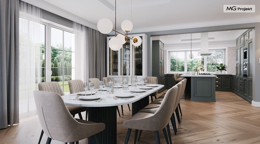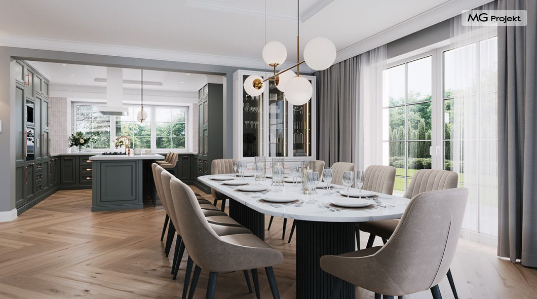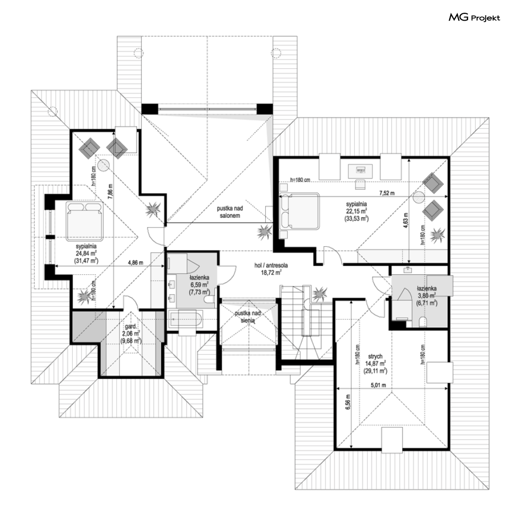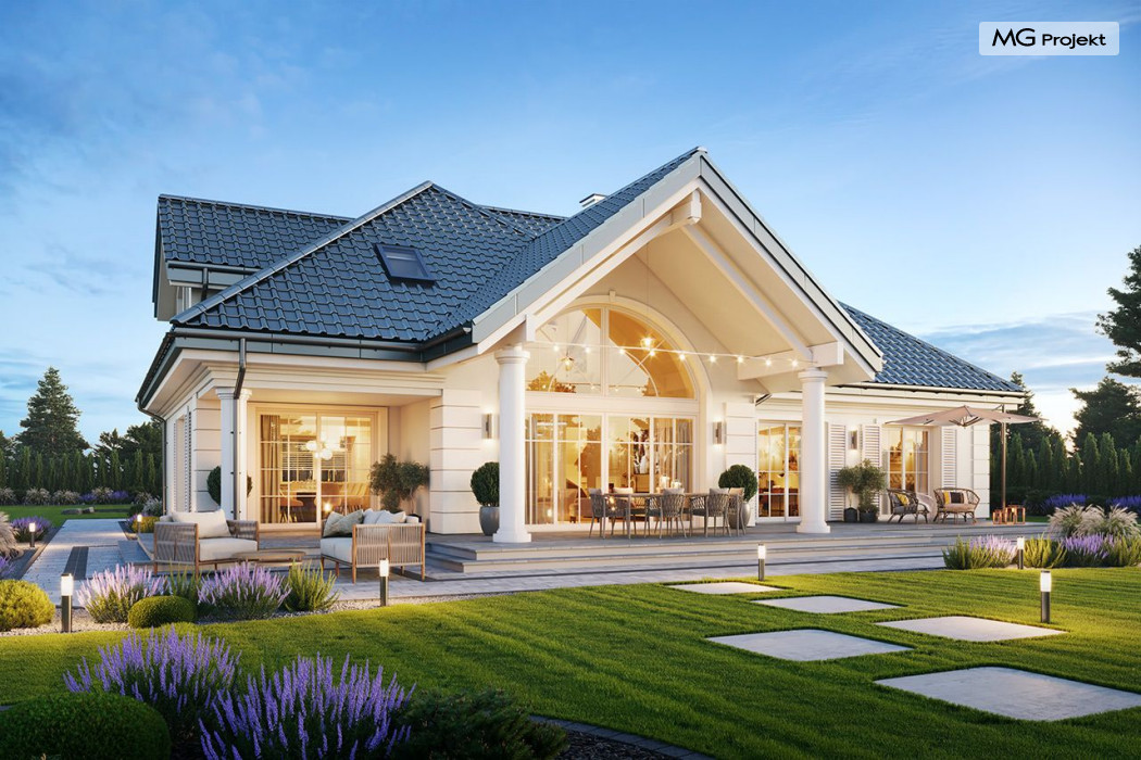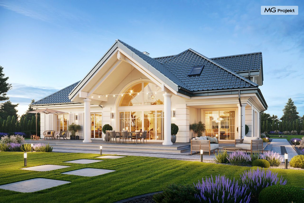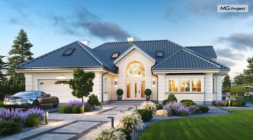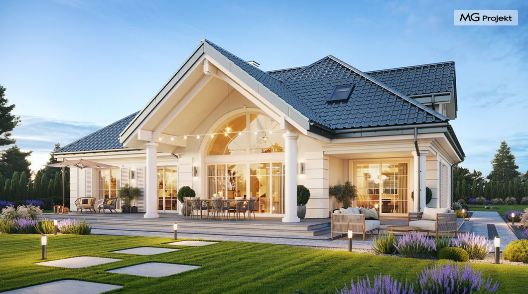 Projekt domu Willa Parkowa 9 jest kolejną wersją projektu z cieszącej się uznaniem serii domów : „Willa Parkowa”. Projekt domu jednorodzinnego, parterowego z poddaszem użytkowym, przeznaczonego dla rodziny 4-5cioosobowej, będącego połączeniem funkcjonalnej nowoczesnej willi, z klasyczną dworkowo-rezydencyjną stylistyką. Dom zaprojektowano na planie prostokąta, z dobudowaną częścią garażową, oraz wykuszami kuchni i salonu. Budynek łączy w sobie detale charakterystyczne dla serii projektów „Parkowa”, ale jednocześnie jest zaprojektowany zupełnie od nowa, z inną zasadą kształtowania wnętrza i zewnętrznych fasad. Bryła budynku jest tutaj bardziej zwarta, węższa a zarazem głębsza, podwyższony dach o kącie 38 stopni mieści w sobie pełne poddasze użytkowe, część wejściowa, wkomponowana między zadaszenie garażu i dach nad kuchnią ma zmienioną – bardziej reprezentacyjną formę, z podwyższonym naświetlem nad drzwiami wejściowymi. Część wejściowa wygląda jeszcze bardziej atrakcyjnie w stosunku do tradycyjnego portalu w projektach „Parkowych” i przypomina swoim wyglądem wzory eleganckich portyków wejściowych amerykańskich rezydencji. Od strony ogrodowej tradycyjnie dla tej serii projektów dominuje wielkie okno salonu z łukowym naświetlem, skryte w dekoracyjnym zadaszeniu nad tarasem. Zadaszenie przesunięte jest bardziej na środek elewacji. Całość bryły domu wieńczy masywny wielospadowy dach przykryty dachówką ceramiczną. Wnętrze „Willi Parkowej 9” podzielono w następujący sposób: parter to cześć dzienna, oddzielny apartament master z dodatkowym pokojem do pracy, oraz garaż z pomieszczeniem technicznym. Poddasze to sypialnie dziecięce z łazienkami i przestrzeń strychowa nad garażem. Do domu wchodzimy przez piękną podwyższoną sień z naświetlami, do holu i następnie części dziennej, składającej się z salonu wypoczynkowego, jadalni, oraz częściowo otwartej kuchni. W salonie dominującymi elementami są duże przeszklenie otwierające pokój dzienny na taras i ogród, oraz otwarcie sufitu na dach i antresolę na poddaszu. Po drugiej stronie domu znajdują się wygodne schody na poddasze, przejście do garażu i kotłowni, a także oddzielna część rodziców z sypialnią master, własną łazienką, garderobą, wyjściem na taras ogrodowy i dodatkowym pokojem – gabinetem. Na poddaszu mieszczą się dwie duże sypialnie dziecięce, dwie łazienki i dodatkowe pomieszczenie nad garażem - strych /magazyn, który w łatwy sposób może być przystosowany jako dodatkowy pokój. Wnętrze domu zaprojektowano w taki sposób aby łatwo można je było przystosować na przestrzeni lat do funkcjonowania rodziny - od małych dzieci, przez dzieci większe -nastoletnie, przez prawie dorosłe, aż do momentu gdy gospodarze zostają sami na swoich „włościach”. „Willa Parkowa 9” została zaprojektowana jako dom energooszczędny, z dobrej jakości materiałów, z dobrą izolacją termiczną i z nowoczesnymi instalacjami. Budynek mimo rozbudowanej bryły wykonano w tradycyjnej technologii, z rozwiązaniami spotykanymi na każdej budowie. Budowa domu nie powinna być problemem dla fachowego wykonawcy. Willa Parkowa 9 to doskonała propozycja dla Inwestorów planujących budowę wygodnego domu o klasycznej architekturze, dającego przestrzeń do komfortowego życia, marzących o realizacji nietuzinkowego projektu o ponadczasowej stylistyce. Zapraszamy do obejrzenia wszystkich projektów domów z serii Willa Parkowa: https://www.mgprojekt.com.pl/willa-parkowa, https://www.mgprojekt.com.pl/willa-parkowa-2, https://www.mgprojekt.com.pl/willa-parkowa-3, https://www.mgprojekt.com.pl/willa-parkowa-4, https://www.mgprojekt.com.pl/willa-parkowa-5, https://www.mgprojekt.com.pl/willa-parkowa-6, https://www.mgprojekt.com.pl/willa-parkowa-6-d, https://www.mgprojekt.com.pl/willa-parkowa-7, https://www.mgprojekt.com.pl/willa-parkowa-8-a, https://www.mgprojekt.com.pl/willa-parkowa-8-b, https://www.mgprojekt.com.pl/willa-parkowa-9, https://www.mgprojekt.com.pl/willa-parkowa-10, https://www.mgprojekt.com.pl/willa-parkowa-b, https://www.mgprojekt.com.pl/willa-parkowa-c, https://www.mgprojekt.com.pl/willa-parkowa-d.