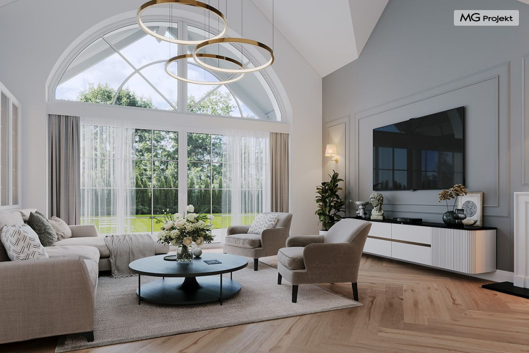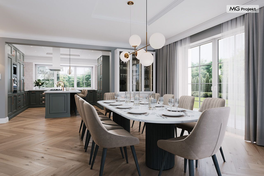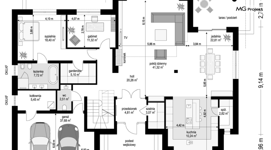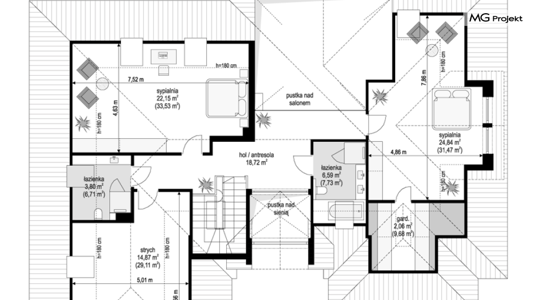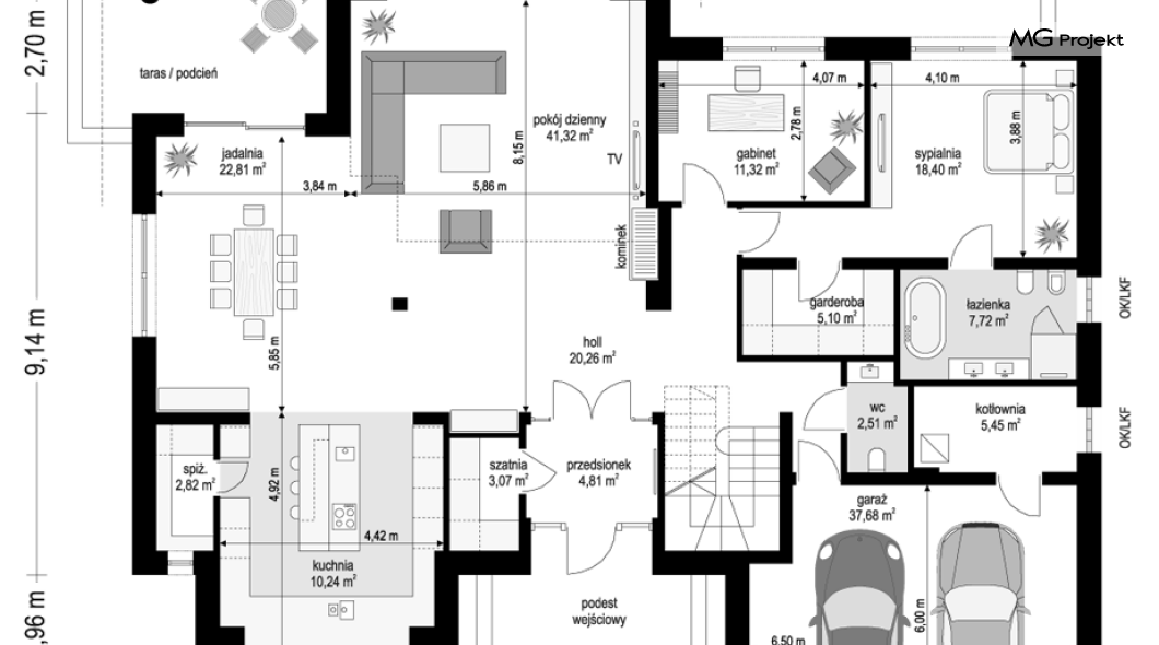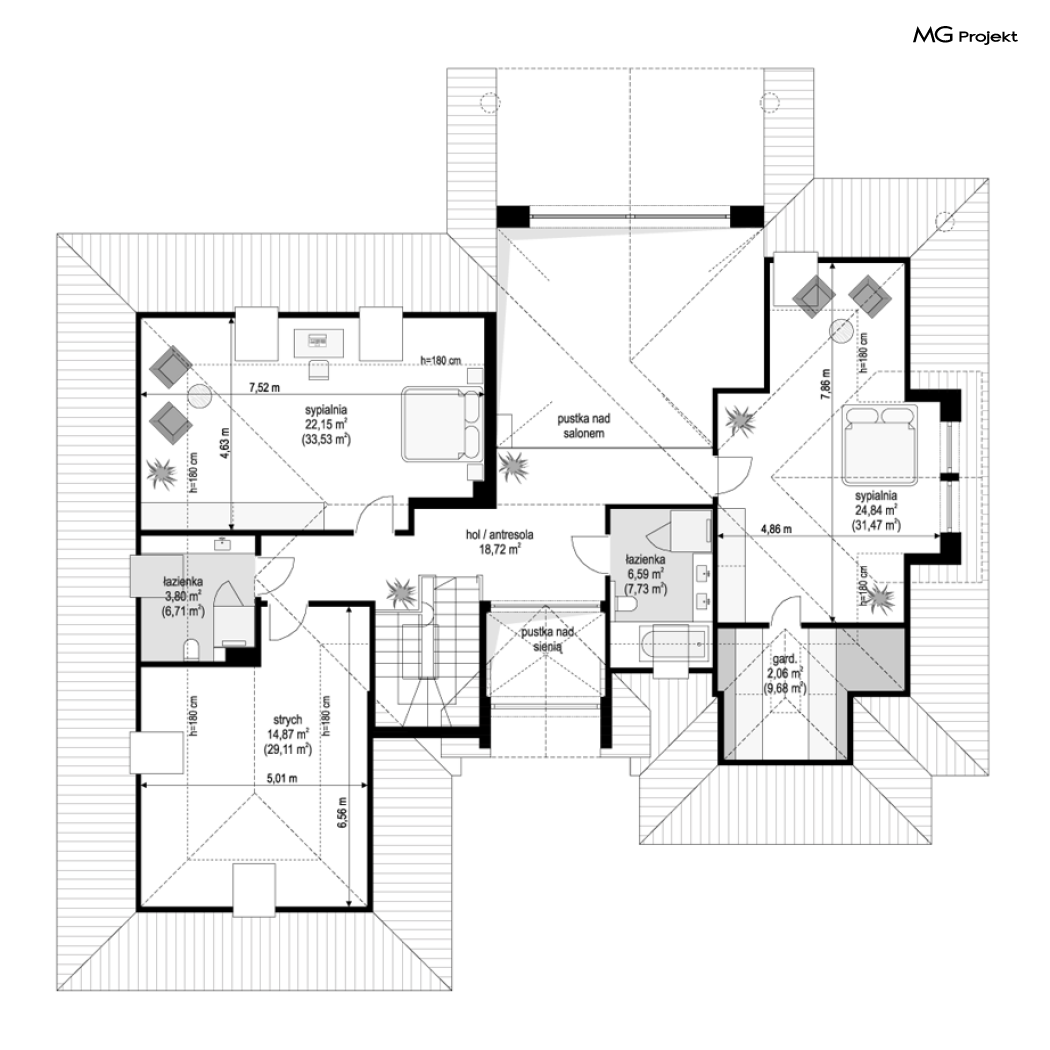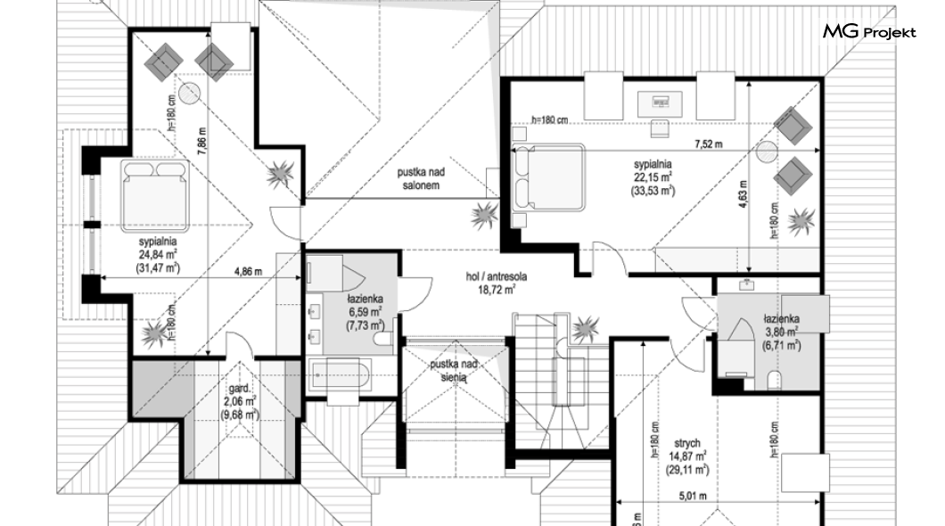 Projekt domu Willa Parkowa 9 jest kolejną wersją projektu z cieszącej się uznaniem serii domów : „Willa Parkowa”. Projekt domu jednorodzinnego, parterowego z poddaszem użytkowym, przeznaczonego dla rodziny 4-5cioosobowej, będącego połączeniem funkcjonalnej nowoczesnej willi, z klasyczną dworkowo-rezydencyjną stylistyką. Dom zaprojektowano na planie prostokąta, z dobudowaną częścią garażową, oraz wykuszami kuchni i salonu. Budynek łączy w sobie detale charakterystyczne dla serii projektów „Parkowa”, ale jednocześnie jest zaprojektowany zupełnie od nowa, z inną zasadą kształtowania wnętrza i zewnętrznych fasad. Bryła budynku jest tutaj bardziej zwarta, węższa a zarazem głębsza, podwyższony dach o kącie 38 stopni mieści w sobie pełne poddasze użytkowe, część wejściowa, wkomponowana między zadaszenie garażu i dach nad kuchnią ma zmienioną – bardziej reprezentacyjną formę, z podwyższonym naświetlem nad drzwiami wejściowymi. Część wejściowa wygląda jeszcze bardziej atrakcyjnie w stosunku do tradycyjnego portalu w projektach „Parkowych” i przypomina swoim wyglądem wzory eleganckich portyków wejściowych amerykańskich rezydencji. Od strony ogrodowej tradycyjnie dla tej serii projektów dominuje wielkie okno salonu z łukowym naświetlem, skryte w dekoracyjnym zadaszeniu nad tarasem. Zadaszenie przesunięte jest bardziej na środek elewacji. Całość bryły domu wieńczy masywny wielospadowy dach przykryty dachówką ceramiczną. Wnętrze „Willi Parkowej 9” podzielono w następujący sposób: parter to cześć dzienna, oddzielny apartament master z dodatkowym pokojem do pracy, oraz garaż z pomieszczeniem technicznym. Poddasze to sypialnie dziecięce z łazienkami i przestrzeń strychowa nad garażem. Do domu wchodzimy przez piękną podwyższoną sień z naświetlami, do holu i następnie części dziennej, składającej się z salonu wypoczynkowego, jadalni, oraz częściowo otwartej kuchni. W salonie dominującymi elementami są duże przeszklenie otwierające pokój dzienny na taras i ogród, oraz otwarcie sufitu na dach i antresolę na poddaszu. Po drugiej stronie domu znajdują się wygodne schody na poddasze, przejście do garażu i kotłowni, a także oddzielna część rodziców z sypialnią master, własną łazienką, garderobą, wyjściem na taras ogrodowy i dodatkowym pokojem – gabinetem. Na poddaszu mieszczą się dwie duże sypialnie dziecięce, dwie łazienki i dodatkowe pomieszczenie nad garażem - strych /magazyn, który w łatwy sposób może być przystosowany jako dodatkowy pokój. Wnętrze domu zaprojektowano w taki sposób aby łatwo można je było przystosować na przestrzeni lat do funkcjonowania rodziny - od małych dzieci, przez dzieci większe -nastoletnie, przez prawie dorosłe, aż do momentu gdy gospodarze zostają sami na swoich „włościach”. „Willa Parkowa 9” została zaprojektowana jako dom energooszczędny, z dobrej jakości materiałów, z dobrą izolacją termiczną i z nowoczesnymi instalacjami. Budynek mimo rozbudowanej bryły wykonano w tradycyjnej technologii, z rozwiązaniami spotykanymi na każdej budowie. Budowa domu nie powinna być problemem dla fachowego wykonawcy. Willa Parkowa 9 to doskonała propozycja dla Inwestorów planujących budowę wygodnego domu o klasycznej architekturze, dającego przestrzeń do komfortowego życia, marzących o realizacji nietuzinkowego projektu o ponadczasowej stylistyce. Zapraszamy do obejrzenia wszystkich projektów domów z serii Willa Parkowa: https://www.mgprojekt.com.pl/willa-parkowa, https://www.mgprojekt.com.pl/willa-parkowa-2, https://www.mgprojekt.com.pl/willa-parkowa-3, https://www.mgprojekt.com.pl/willa-parkowa-4, https://www.mgprojekt.com.pl/willa-parkowa-5, https://www.mgprojekt.com.pl/willa-parkowa-6, https://www.mgprojekt.com.pl/willa-parkowa-6-d, https://www.mgprojekt.com.pl/willa-parkowa-7, https://www.mgprojekt.com.pl/willa-parkowa-8-a, https://www.mgprojekt.com.pl/willa-parkowa-8-b, https://www.mgprojekt.com.pl/willa-parkowa-9, https://www.mgprojekt.com.pl/willa-parkowa-10, https://www.mgprojekt.com.pl/willa-parkowa-b, https://www.mgprojekt.com.pl/willa-parkowa-c, https://www.mgprojekt.com.pl/willa-parkowa-d.