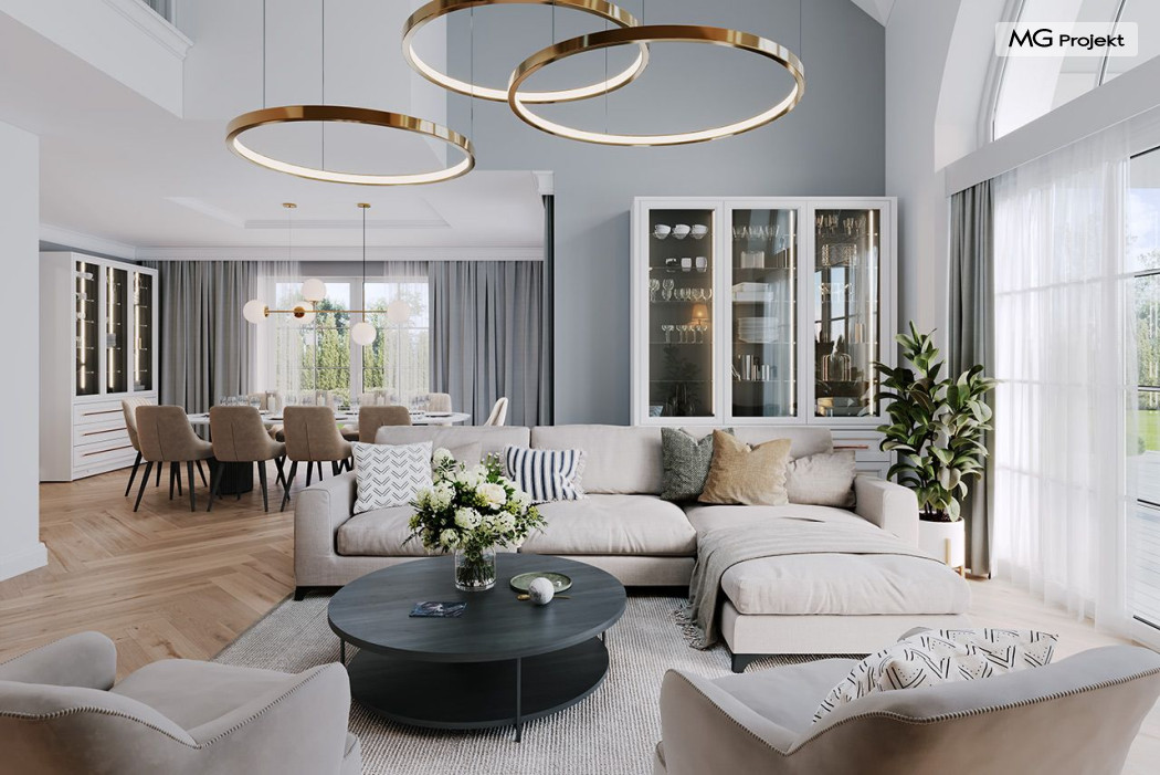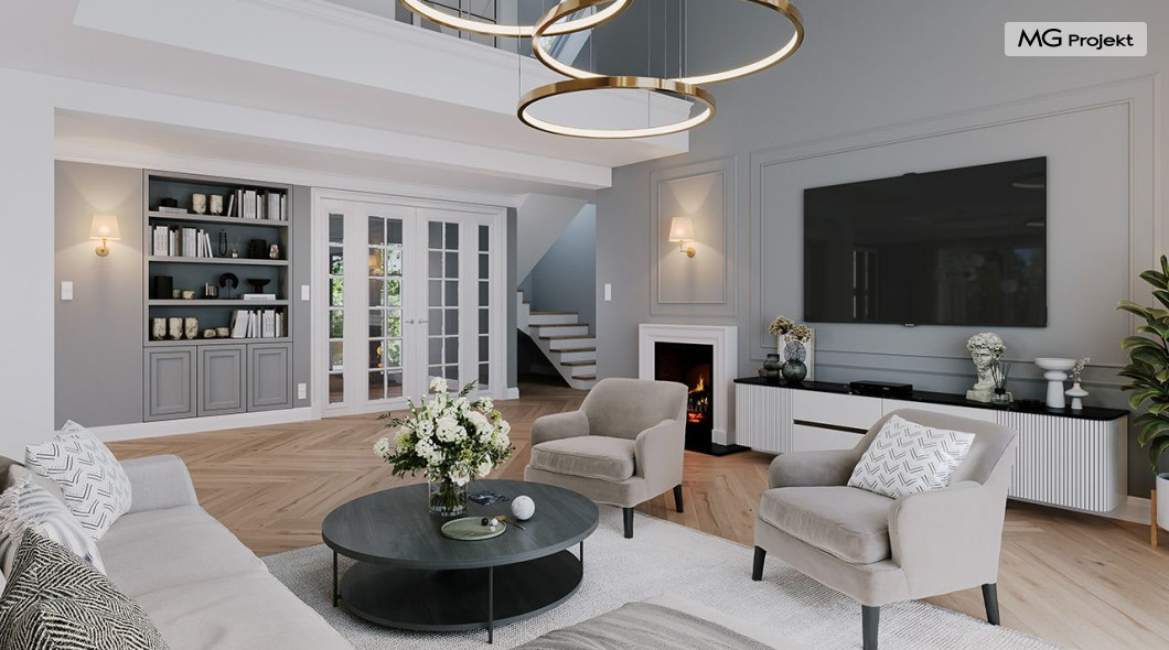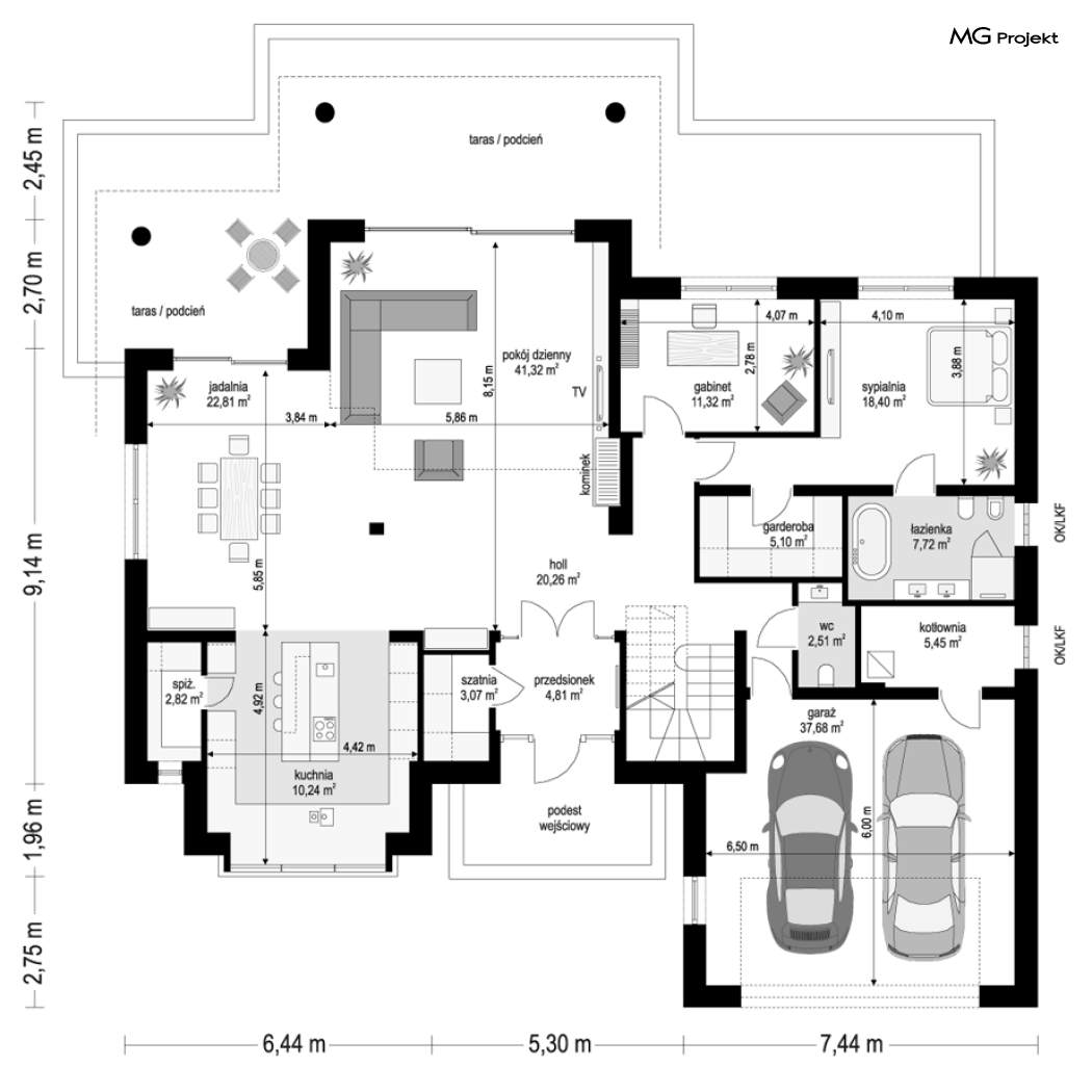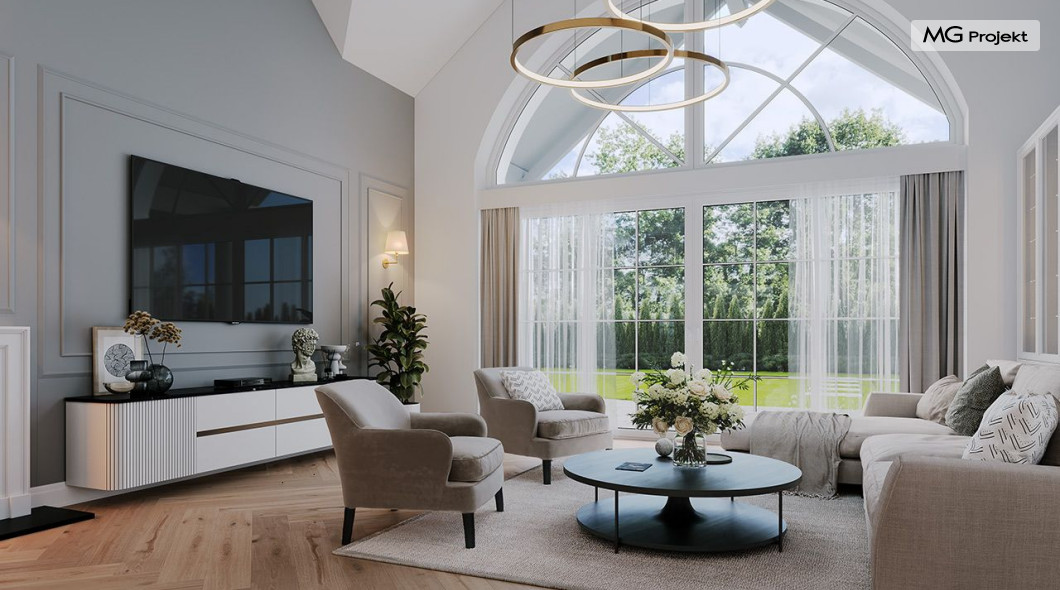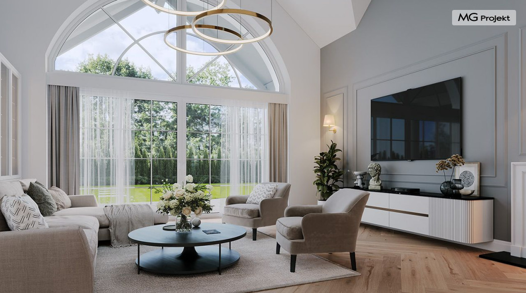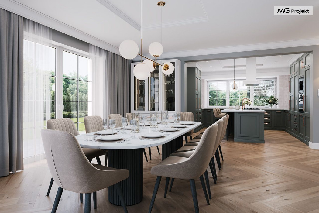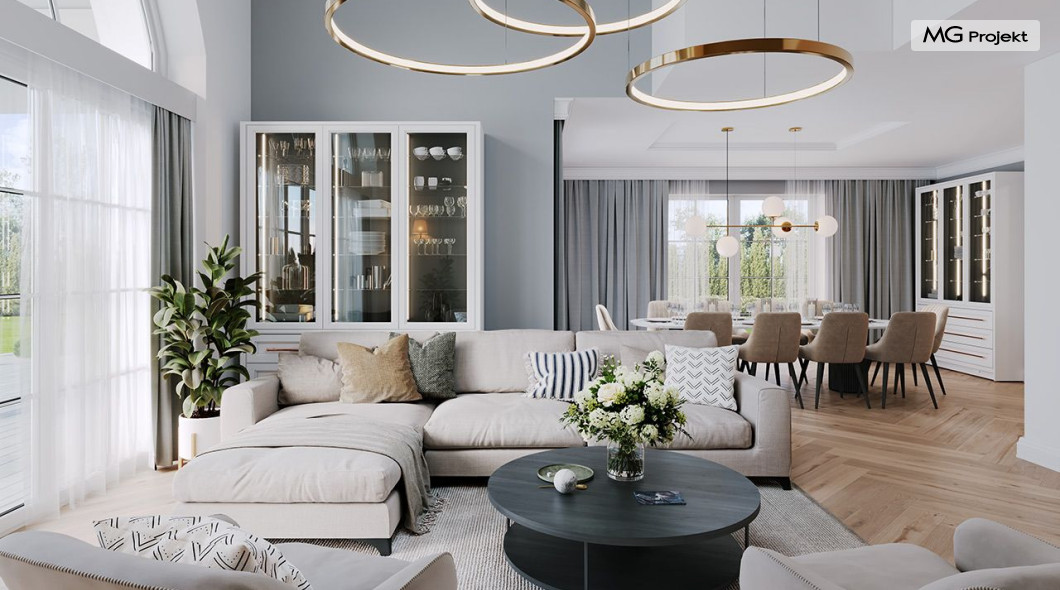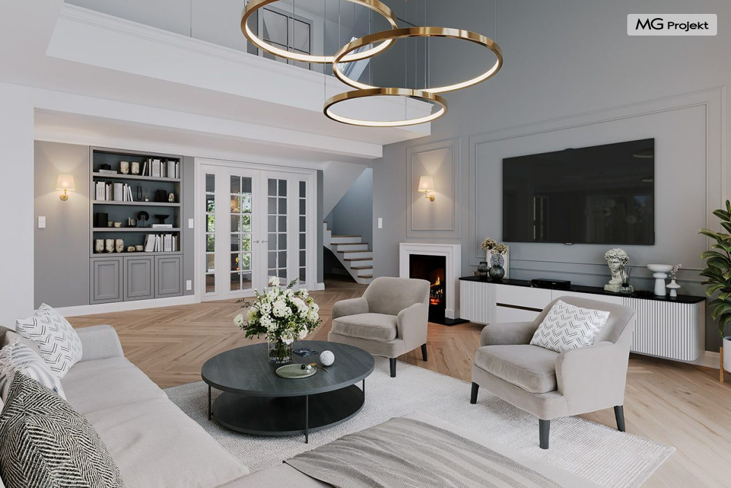 Projekt domu Willa Parkowa 9 jest kolejną wersją projektu z cieszącej się uznaniem serii domów : „Willa Parkowa”. Projekt domu jednorodzinnego, parterowego z poddaszem użytkowym, przeznaczonego dla rodziny 4-5cioosobowej, będącego połączeniem funkcjonalnej nowoczesnej willi, z klasyczną dworkowo-rezydencyjną stylistyką. Dom zaprojektowano na planie prostokąta, z dobudowaną częścią garażową, oraz wykuszami kuchni i salonu. Budynek łączy w sobie detale charakterystyczne dla serii projektów „Parkowa”, ale jednocześnie jest zaprojektowany zupełnie od nowa, z inną zasadą kształtowania wnętrza i zewnętrznych fasad. Bryła budynku jest tutaj bardziej zwarta, węższa a zarazem głębsza, podwyższony dach o kącie 38 stopni mieści w sobie pełne poddasze użytkowe, część wejściowa, wkomponowana między zadaszenie garażu i dach nad kuchnią ma zmienioną – bardziej reprezentacyjną formę, z podwyższonym naświetlem nad drzwiami wejściowymi. Część wejściowa wygląda jeszcze bardziej atrakcyjnie w stosunku do tradycyjnego portalu w projektach „Parkowych” i przypomina swoim wyglądem wzory eleganckich portyków wejściowych amerykańskich rezydencji. Od strony ogrodowej tradycyjnie dla tej serii projektów dominuje wielkie okno salonu z łukowym naświetlem, skryte w dekoracyjnym zadaszeniu nad tarasem. Zadaszenie przesunięte jest bardziej na środek elewacji. Całość bryły domu wieńczy masywny wielospadowy dach przykryty dachówką ceramiczną. Wnętrze „Willi Parkowej 9” podzielono w następujący sposób: parter to cześć dzienna, oddzielny apartament master z dodatkowym pokojem do pracy, oraz garaż z pomieszczeniem technicznym. Poddasze to sypialnie dziecięce z łazienkami i przestrzeń strychowa nad garażem. Do domu wchodzimy przez piękną podwyższoną sień z naświetlami, do holu i następnie części dziennej, składającej się z salonu wypoczynkowego, jadalni, oraz częściowo otwartej kuchni. W salonie dominującymi elementami są duże przeszklenie otwierające pokój dzienny na taras i ogród, oraz otwarcie sufitu na dach i antresolę na poddaszu. Po drugiej stronie domu znajdują się wygodne schody na poddasze, przejście do garażu i kotłowni, a także oddzielna część rodziców z sypialnią master, własną łazienką, garderobą, wyjściem na taras ogrodowy i dodatkowym pokojem – gabinetem. Na poddaszu mieszczą się dwie duże sypialnie dziecięce, dwie łazienki i dodatkowe pomieszczenie nad garażem - strych /magazyn, który w łatwy sposób może być przystosowany jako dodatkowy pokój. Wnętrze domu zaprojektowano w taki sposób aby łatwo można je było przystosować na przestrzeni lat do funkcjonowania rodziny - od małych dzieci, przez dzieci większe -nastoletnie, przez prawie dorosłe, aż do momentu gdy gospodarze zostają sami na swoich „włościach”. „Willa Parkowa 9” została zaprojektowana jako dom energooszczędny, z dobrej jakości materiałów, z dobrą izolacją termiczną i z nowoczesnymi instalacjami. Budynek mimo rozbudowanej bryły wykonano w tradycyjnej technologii, z rozwiązaniami spotykanymi na każdej budowie. Budowa domu nie powinna być problemem dla fachowego wykonawcy. Willa Parkowa 9 to doskonała propozycja dla Inwestorów planujących budowę wygodnego domu o klasycznej architekturze, dającego przestrzeń do komfortowego życia, marzących o realizacji nietuzinkowego projektu o ponadczasowej stylistyce. Zapraszamy do obejrzenia wszystkich projektów domów z serii Willa Parkowa: https://www.mgprojekt.com.pl/willa-parkowa, https://www.mgprojekt.com.pl/willa-parkowa-2, https://www.mgprojekt.com.pl/willa-parkowa-3, https://www.mgprojekt.com.pl/willa-parkowa-4, https://www.mgprojekt.com.pl/willa-parkowa-5, https://www.mgprojekt.com.pl/willa-parkowa-6, https://www.mgprojekt.com.pl/willa-parkowa-6-d, https://www.mgprojekt.com.pl/willa-parkowa-7, https://www.mgprojekt.com.pl/willa-parkowa-8-a, https://www.mgprojekt.com.pl/willa-parkowa-8-b, https://www.mgprojekt.com.pl/willa-parkowa-9, https://www.mgprojekt.com.pl/willa-parkowa-10, https://www.mgprojekt.com.pl/willa-parkowa-b, https://www.mgprojekt.com.pl/willa-parkowa-c, https://www.mgprojekt.com.pl/willa-parkowa-d.
