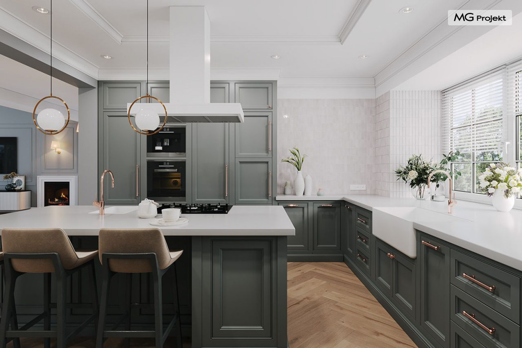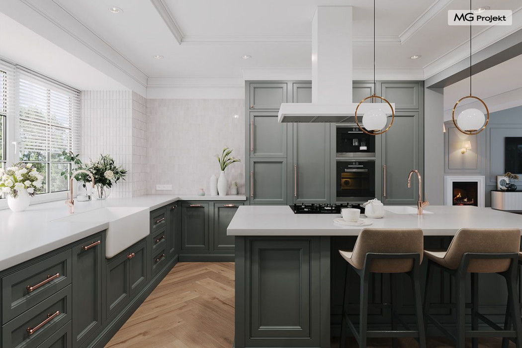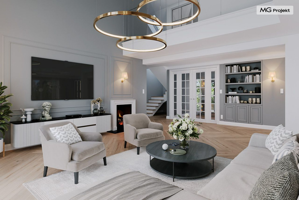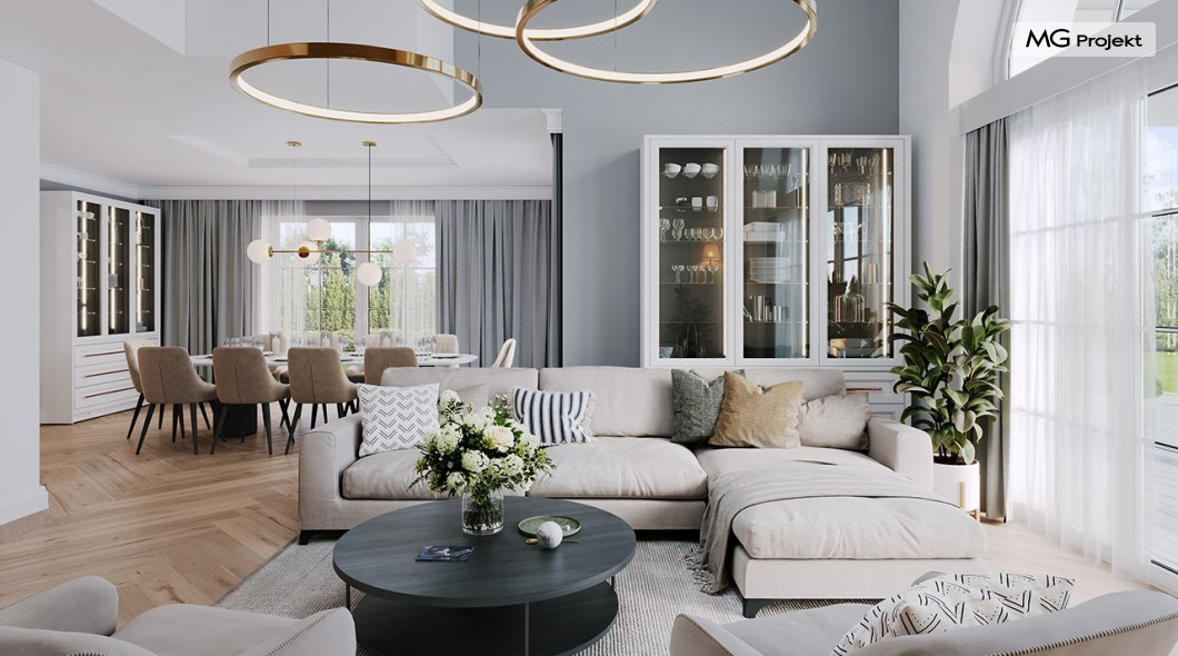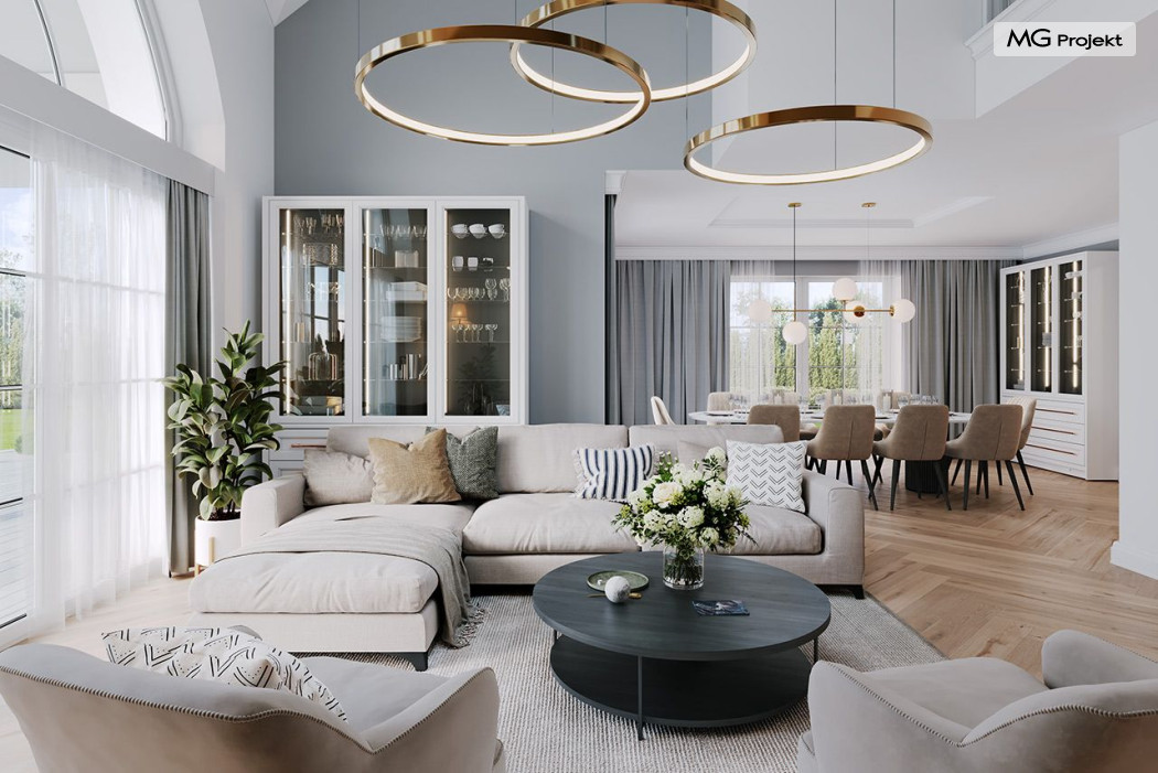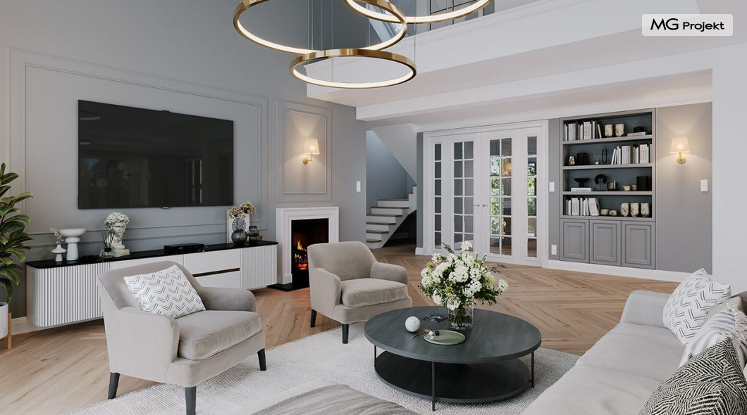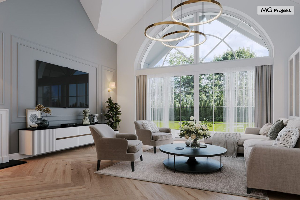 Projekt domu Willa Parkowa 9 jest kolejną wersją projektu z cieszącej się uznaniem serii domów : „Willa Parkowa”. Projekt domu jednorodzinnego, parterowego z poddaszem użytkowym, przeznaczonego dla rodziny 4-5cioosobowej, będącego połączeniem funkcjonalnej nowoczesnej willi, z klasyczną dworkowo-rezydencyjną stylistyką. Dom zaprojektowano na planie prostokąta, z dobudowaną częścią garażową, oraz wykuszami kuchni i salonu. Budynek łączy w sobie detale charakterystyczne dla serii projektów „Parkowa”, ale jednocześnie jest zaprojektowany zupełnie od nowa, z inną zasadą kształtowania wnętrza i zewnętrznych fasad. Bryła budynku jest tutaj bardziej zwarta, węższa a zarazem głębsza, podwyższony dach o kącie 38 stopni mieści w sobie pełne poddasze użytkowe, część wejściowa, wkomponowana między zadaszenie garażu i dach nad kuchnią ma zmienioną – bardziej reprezentacyjną formę, z podwyższonym naświetlem nad drzwiami wejściowymi. Część wejściowa wygląda jeszcze bardziej atrakcyjnie w stosunku do tradycyjnego portalu w projektach „Parkowych” i przypomina swoim wyglądem wzory eleganckich portyków wejściowych amerykańskich rezydencji. Od strony ogrodowej tradycyjnie dla tej serii projektów dominuje wielkie okno salonu z łukowym naświetlem, skryte w dekoracyjnym zadaszeniu nad tarasem. Zadaszenie przesunięte jest bardziej na środek elewacji. Całość bryły domu wieńczy masywny wielospadowy dach przykryty dachówką ceramiczną. Wnętrze „Willi Parkowej 9” podzielono w następujący sposób: parter to cześć dzienna, oddzielny apartament master z dodatkowym pokojem do pracy, oraz garaż z pomieszczeniem technicznym. Poddasze to sypialnie dziecięce z łazienkami i przestrzeń strychowa nad garażem. Do domu wchodzimy przez piękną podwyższoną sień z naświetlami, do holu i następnie części dziennej, składającej się z salonu wypoczynkowego, jadalni, oraz częściowo otwartej kuchni. W salonie dominującymi elementami są duże przeszklenie otwierające pokój dzienny na taras i ogród, oraz otwarcie sufitu na dach i antresolę na poddaszu. Po drugiej stronie domu znajdują się wygodne schody na poddasze, przejście do garażu i kotłowni, a także oddzielna część rodziców z sypialnią master, własną łazienką, garderobą, wyjściem na taras ogrodowy i dodatkowym pokojem – gabinetem. Na poddaszu mieszczą się dwie duże sypialnie dziecięce, dwie łazienki i dodatkowe pomieszczenie nad garażem - strych /magazyn, który w łatwy sposób może być przystosowany jako dodatkowy pokój. Wnętrze domu zaprojektowano w taki sposób aby łatwo można je było przystosować na przestrzeni lat do funkcjonowania rodziny - od małych dzieci, przez dzieci większe -nastoletnie, przez prawie dorosłe, aż do momentu gdy gospodarze zostają sami na swoich „włościach”. „Willa Parkowa 9” została zaprojektowana jako dom energooszczędny, z dobrej jakości materiałów, z dobrą izolacją termiczną i z nowoczesnymi instalacjami. Budynek mimo rozbudowanej bryły wykonano w tradycyjnej technologii, z rozwiązaniami spotykanymi na każdej budowie. Budowa domu nie powinna być problemem dla fachowego wykonawcy. Willa Parkowa 9 to doskonała propozycja dla Inwestorów planujących budowę wygodnego domu o klasycznej architekturze, dającego przestrzeń do komfortowego życia, marzących o realizacji nietuzinkowego projektu o ponadczasowej stylistyce. Zapraszamy do obejrzenia wszystkich projektów domów z serii Willa Parkowa: https://www.mgprojekt.com.pl/willa-parkowa, https://www.mgprojekt.com.pl/willa-parkowa-2, https://www.mgprojekt.com.pl/willa-parkowa-3, https://www.mgprojekt.com.pl/willa-parkowa-4, https://www.mgprojekt.com.pl/willa-parkowa-5, https://www.mgprojekt.com.pl/willa-parkowa-6, https://www.mgprojekt.com.pl/willa-parkowa-6-d, https://www.mgprojekt.com.pl/willa-parkowa-7, https://www.mgprojekt.com.pl/willa-parkowa-8-a, https://www.mgprojekt.com.pl/willa-parkowa-8-b, https://www.mgprojekt.com.pl/willa-parkowa-9, https://www.mgprojekt.com.pl/willa-parkowa-10, https://www.mgprojekt.com.pl/willa-parkowa-b, https://www.mgprojekt.com.pl/willa-parkowa-c, https://www.mgprojekt.com.pl/willa-parkowa-d.